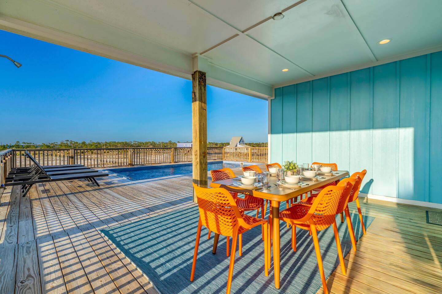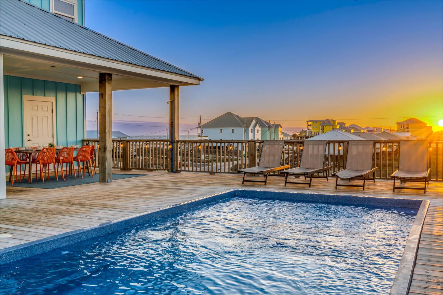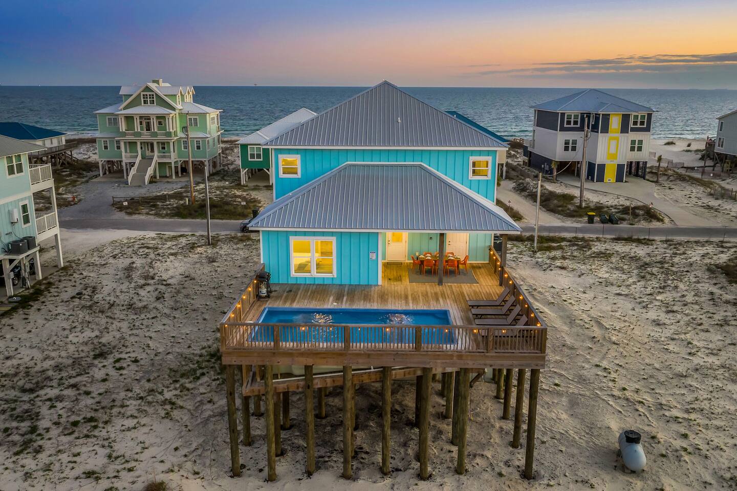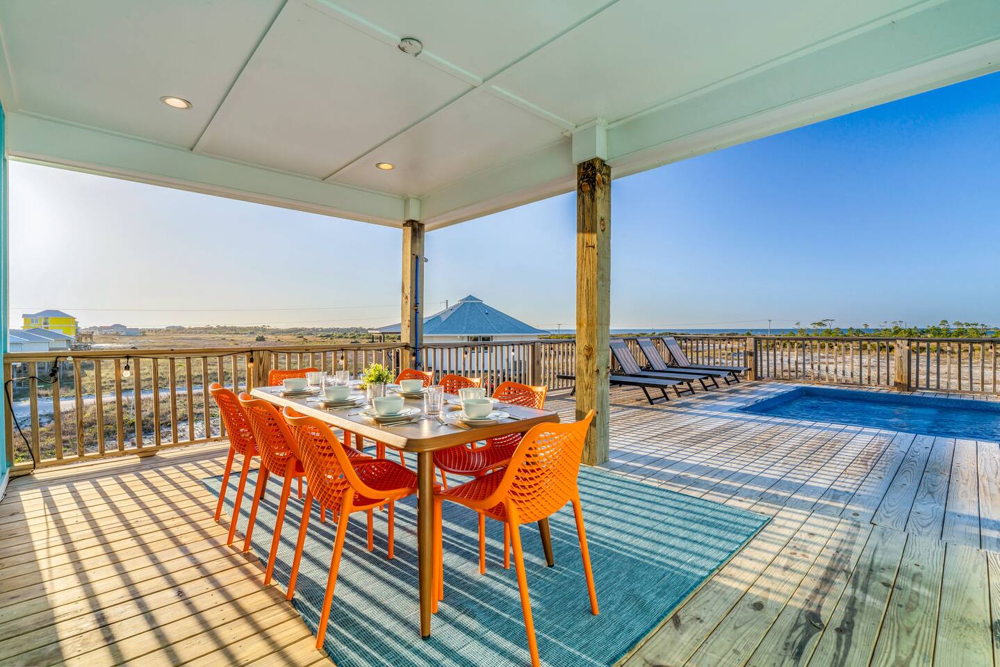 Stunning Gulf Views, Private Heated Pool & Steps to the Beach Brand new in 2024, this luxurious Gulf Shores beach house sleeps 16 and delivers everything you need for an unforgettable coastal escape. Wake up to breathtaking ocean views from every room, cool off in your private heated pool, and reach the sugar-white sand in less than a minute—the beach is just across the street. Whether you're gathered around the dining table, floating in the pool, or watching the sunset from your oceanfront deck, this home is designed for comfort, connection, and the kind of memories that last a lifetime. WHAT MAKES THIS HOME SPECIAL ✔ Sweeping Gulf views from every single room ✔ Private heated pool + beach access across the street ✔ 6 bedrooms, 6 bathrooms, sleeps 16 comfortably ✔ Brand new 2024 construction with modern coastal design ✔ Dog-friendly—bring the whole family THE SPACE Step inside to an open-concept living area where floor-to-ceiling windows frame endless Gulf views. Sink into the plush leather sectional, stream your favorite shows on the 65" Smart TV, or simply watch the waves roll in. The spacious dining table seats your entire crew—perfect for lingering over morning coffee, dealing cards after dinner, or replaying the day's beach adventures. The gourmet kitchen makes meal prep effortless with modern stainless appliances, generous counter space, and everything you need to whip up beach-day breakfasts or full family feasts. A high chair is provided for little ones. Outside, your private pool area becomes the heart of the home. Lounge poolside with a cold drink, fire up the BBQ grill for a sunset cookout, or head up to one of two oceanfront decks outfitted with rocking chairs, a cozy daybed, and pub-height tables. Rinse off the sand in the outdoor shower before diving back in. When you're ready for the beach, grab the complimentary chairs and wagon—you'll be toes-in-the-sand in under 60 seconds. WHERE EVERYONE SLEEPS Main Floor: 2 king suites with en-suite bathrooms, 50" Smart TVs Upper Floor: 2 king suites with en-suite bathrooms, 50" Smart TVs Upper Floor: 1 room with 2 queen beds, en-suite bathroom, 50" Smart TV Upper Floor: 1 bunk room with 2 queen-over-twin bunks (sleeps 6), en-suite bathroom, 50" Smart TV Every bed and mattress is brand new. Every bedroom has its own private bathroom. Boho-inspired coastal decor and spa-quality showers throughout. GOOD TO KNOW ✔ Pack 'n Play and high chair provided ✔ Washer and dryer in-unit ✔ Fast Wi-Fi for streaming or remote work ✔ Beach chairs, toys, and wagon included ✔ Central A/C and heat for year-round comfort ✔ Restaurants and shopping 5 minutes away (Tacky Jacks, Sassy Bass, LuLu's) ✔ Downtown Gulf Shores 20 minutes down the coast POOL HEATING Want to take a dip even when it's cooler outside? Pool heating is available for $85/day and typically maintains a comfortable 80–85°F depending on weather. Just let us know after booking and we'll get it warmed up for your arrival. BOOK YOUR ESCAPE Whether you're planning a multigenerational family reunion, a friends' getaway, or just need to unplug and recharge, this is the Gulf Shores home you've been searching for. Availability fills fast—check your dates now. Doug & Rose Waves & Wilderness
