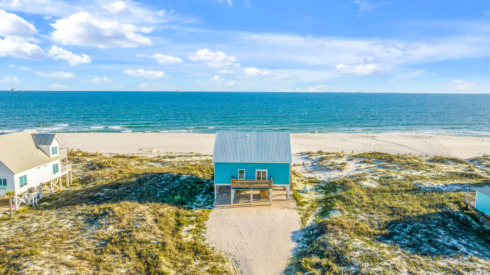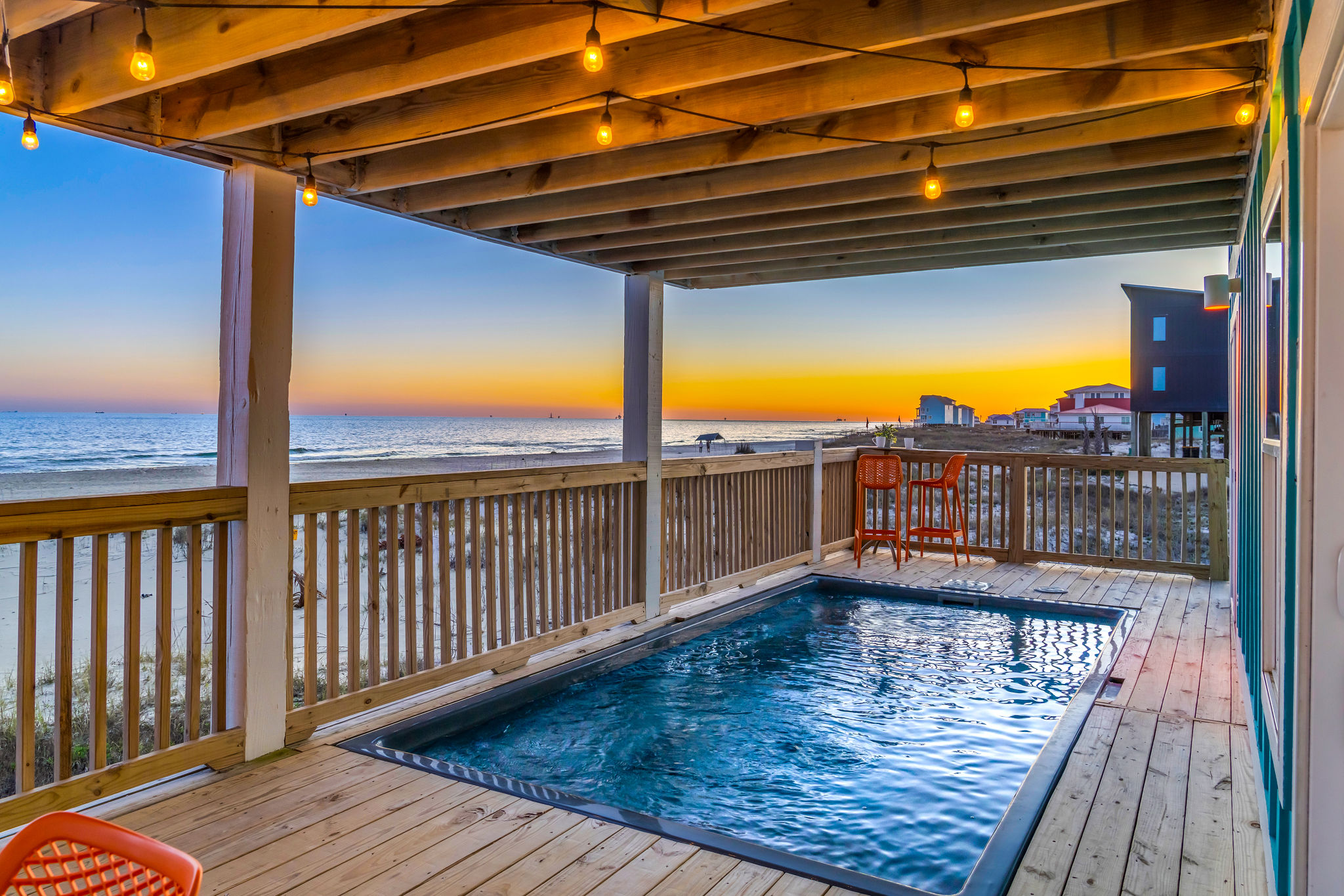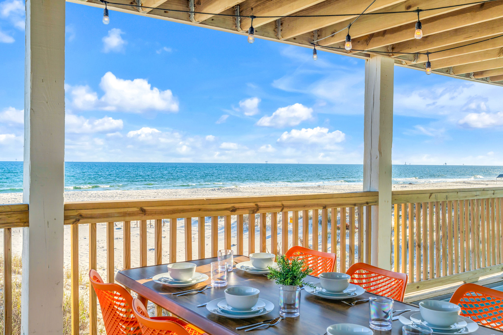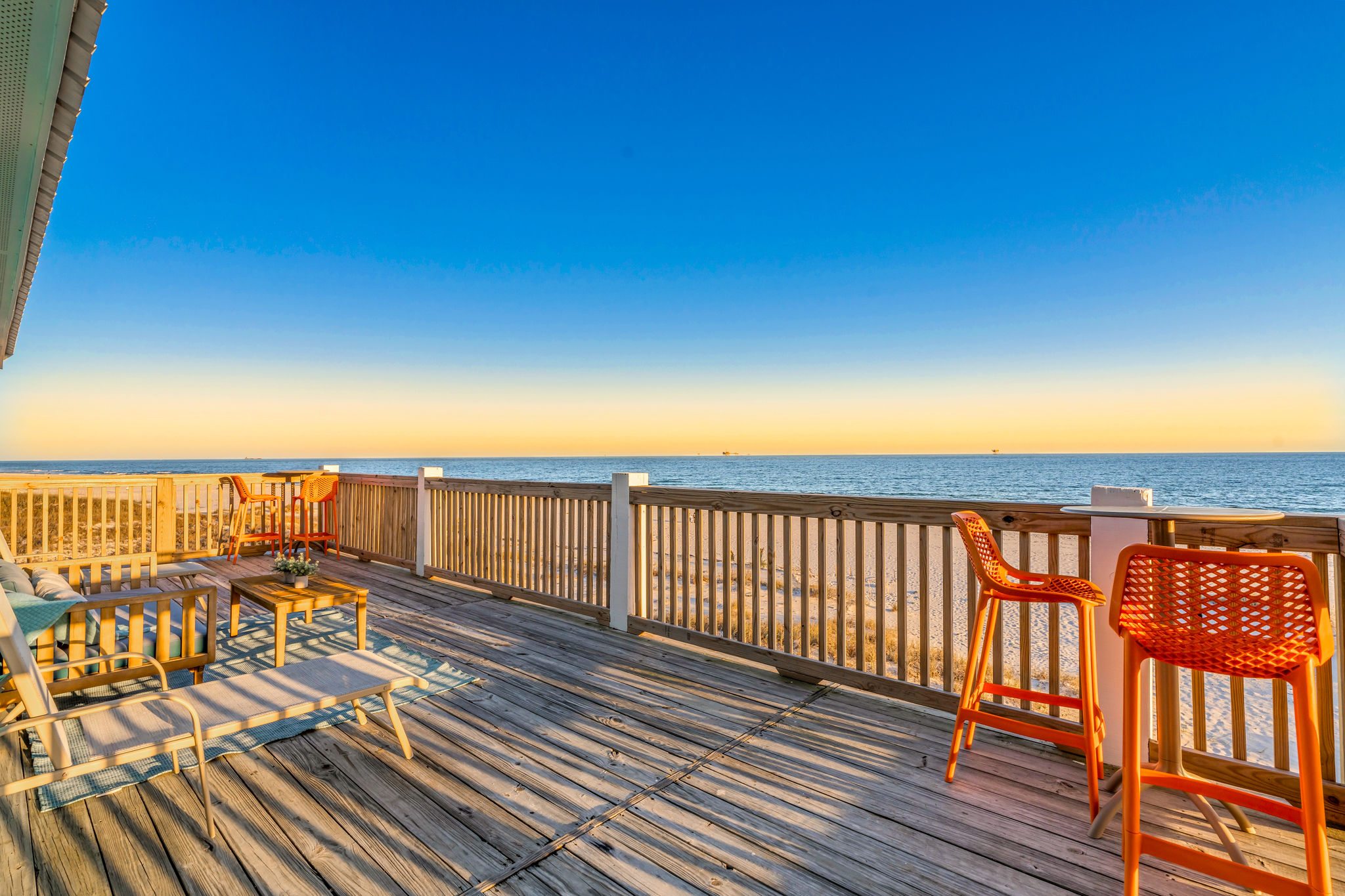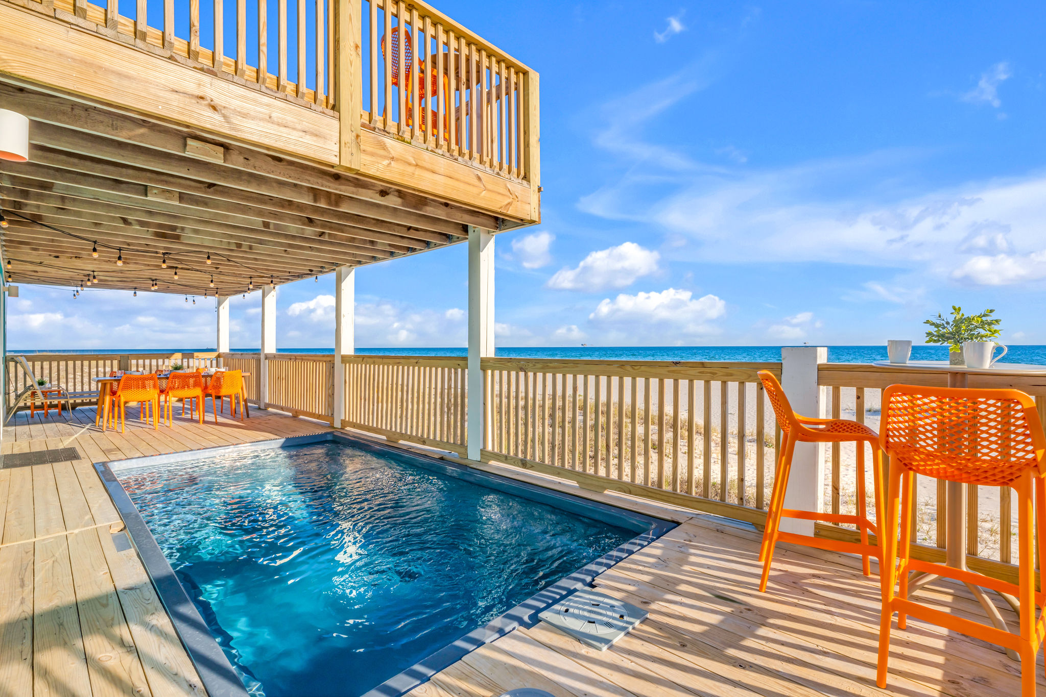 Gulf-Front Luxury with Private Pool & Sunset Views from Every Room Fully renovated in 2025, this stunning beachfront home in Gulf Shores offers the ultimate coastal escape for families, friends, and your four-legged crew. Wake up to endless Gulf views from every room, step directly from your deck onto the sand, and spend your days floating between the beach and your private heated pool. This is true Gulf-front living—where the sound of waves is your constant companion and sunset swims are just part of the daily routine. WHAT MAKES THIS HOME SPECIAL ✔ Direct beachfront—step from your deck straight onto the sand ✔ Unobstructed Gulf views from every single room ✔ Private heated pool on the deck for post-beach cooldowns ✔ Fully renovated in 2025 with coastal-chic design ✔ Dog-friendly—bring the whole pack THE SPACE Your two expansive Gulf-facing decks are where you'll spend most of your time. Start mornings with coffee and front-row sunrise views, gather for alfresco dinners at the outdoor table, or pull up a seat at the high-top pub seating with a cold drink as the sky turns pink and gold. When you need to cool off, dive into your private pool without ever leaving the view. And when the beach calls? You're already there—just step off the deck onto the sand. Inside, the fully stocked kitchen makes meal prep effortless, whether you're blending morning smoothies or prepping a seafood feast. The dining table has room for everyone, and the living room invites you to sink into the cognac leather sofa surrounded by boho-chic accents. Stream a movie on the 65" Smart TV or leave the windows open and let the sound of the waves be your entertainment. Rinse off the salt and sand in the outdoor shower, then decide whether your next move is the pool, the deck, or straight back to the beach. WHERE EVERYONE SLEEPS Main Floor: 2 Gulf-front king suites with deck access, 50" Smart TVs Upstairs: 2 Gulf-front king suites with deck access, 50" Smart TVs Upstairs: 1 bunk room with queen-over-twin and twin-over-twin bunks—perfect for kids As of 2025, every bed and mattress is brand new. Four full bathrooms (two per floor) with spa-inspired showers, plush towels, and boho decor throughout. GOOD TO KNOW ✔ Beach chairs, toys, and wagon included ✔ Private outdoor shower ✔ Washer and dryer in-unit ✔ Central A/C for year-round comfort ✔ Fast Wi-Fi for streaming or staying connected ✔ Dining favorites 5 minutes away (Tacky Jacks, Jessie's, Sassy Bass) ✔ Downtown Gulf Shores 20 minutes down the coast ✔ Fort Morgan's quieter, family-friendly vibe with easy access to everything POOL HEATING Want to swim even when it's cooler outside? Pool heating is available for $85/day and typically maintains a comfortable 80–85°F depending on the weather. Just let us know after booking, and we'll have it ready for your arrival. BOOK YOUR ESCAPE This is the kind of place where you lose track of time—where days blur into a perfect rhythm of beach, pool, deck, repeat. Whether you're here for a family reunion, a friends' trip, or just to unplug and recharge, this Gulf-front home delivers the vacation you've been dreaming about. Availability fills fast—check your dates now. Rose & Doug Waves & Wilderness