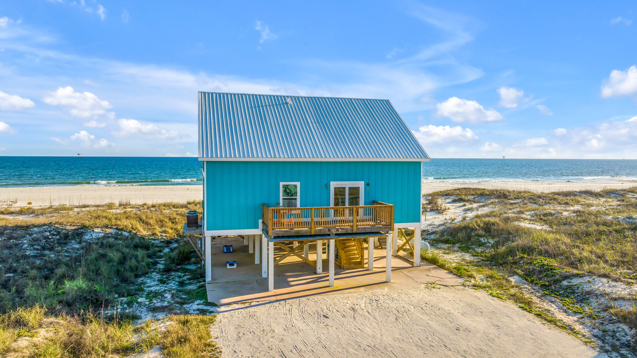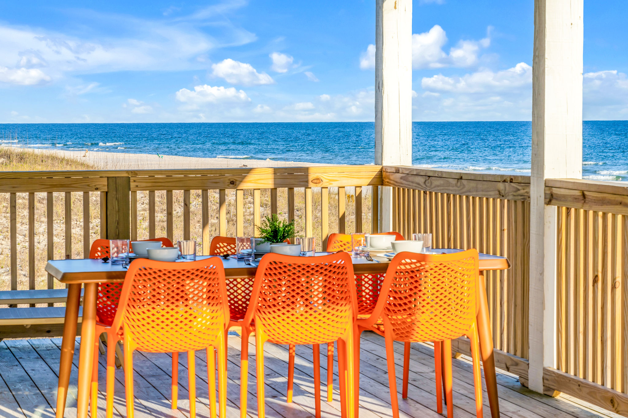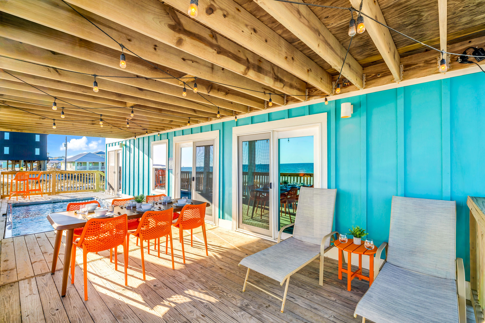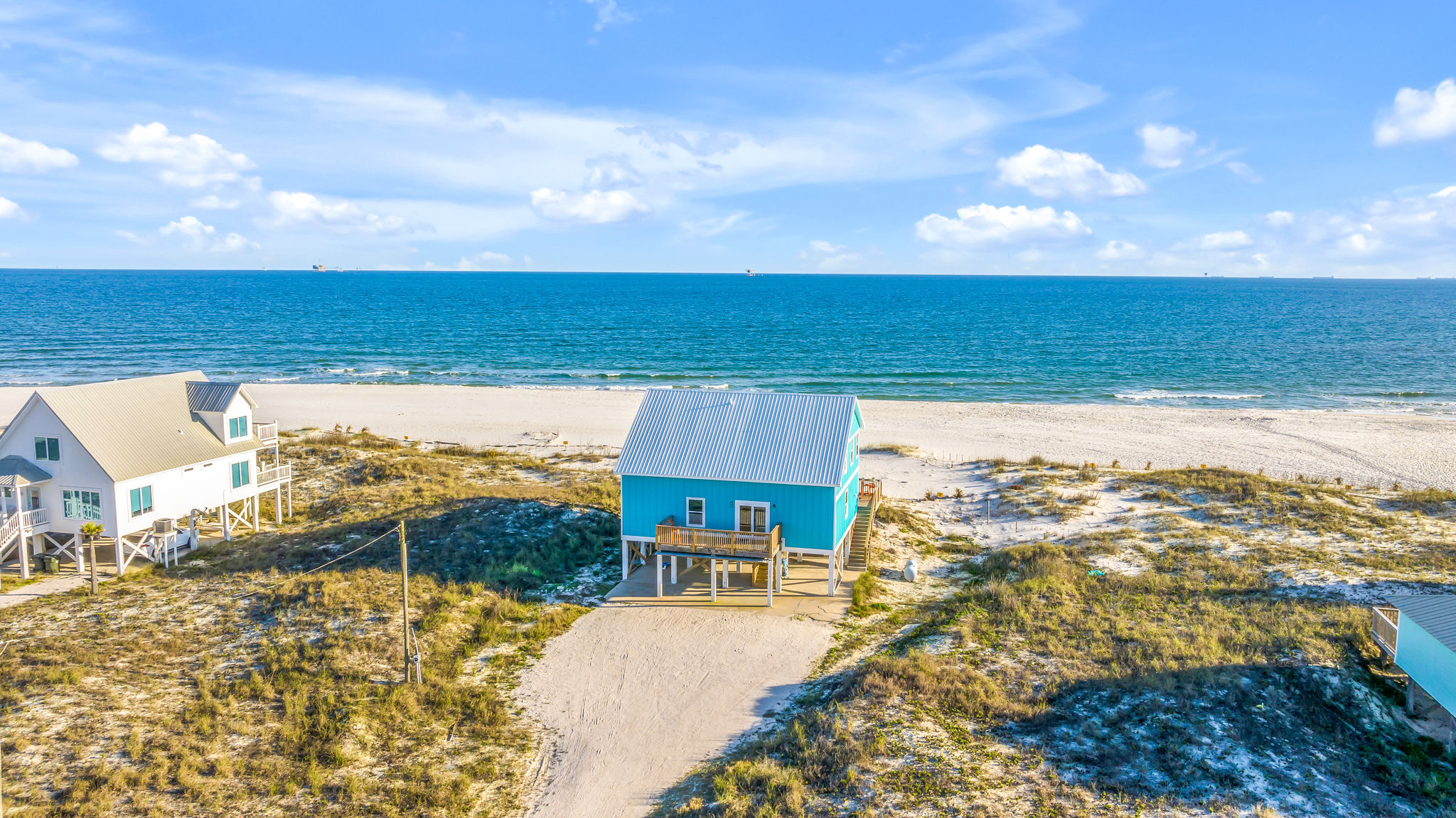 Gulf-Front Luxury with Private Pool & Sunset Views from Every Room Fully renovated in 2025, this stunning beachfront home in Gulf Shores offers the ultimate coastal escape for families, friends, and your four-legged crew. Wake up to endless Gulf views from every room, step directly from your deck onto the sand, and spend your days floating between the beach and your private heated pool. This is true Gulf-front living—where the sound of waves is your constant companion and sunset swims are just part of the daily routine. WHAT MAKES THIS HOME SPECIAL ✔ Direct beachfront—step from your deck straight onto the sand ✔ Unobstructed Gulf views from every single room ✔ Private heated pool on the deck for post-beach cooldowns ✔ Fully renovated in 2025 with coastal-chic design ✔ Dog-friendly—bring the whole pack THE SPACE Your two expansive Gulf-facing decks are where you'll spend most of your time. Start mornings with coffee and front-row sunrise views, gather for alfresco dinners at the outdoor table, or pull up a seat at the high-top pub seating with a cold drink as the sky turns pink and gold. When you need to cool off, dive into your private pool without ever leaving the view. And when the beach calls? You're already there—just step off the deck onto the sand. Inside, the fully stocked kitchen makes meal prep effortless, whether you're blending morning smoothies or prepping a seafood feast. The dining table has room for everyone, and the living room invites you to sink into the cognac leather sofa surrounded by boho-chic accents. Stream a movie on the 65" Smart TV or leave the windows open and let the sound of the waves be your entertainment. Rinse off the salt and sand in the outdoor shower, then decide whether your next move is the pool, the deck, or straight back to the beach. WHERE EVERYONE SLEEPS Main Floor: 2 Gulf-front king suites with deck access, 50" Smart TVs Upstairs: 2 Gulf-front king suites with deck access, 50" Smart TVs Upstairs: 1 bunk room with queen-over-twin and twin-over-twin bunks—perfect for kids As of 2025, every bed and mattress is brand new. Four full bathrooms (two per floor) with spa-inspired showers, plush towels, and boho decor throughout. GOOD TO KNOW ✔ Beach chairs, toys, and wagon included ✔ Private outdoor shower ✔ Washer and dryer in-unit ✔ Central A/C for year-round comfort ✔ Fast Wi-Fi for streaming or staying connected ✔ Dining favorites 5 minutes away (Tacky Jacks, Jessie's, Sassy Bass) ✔ Downtown Gulf Shores 20 minutes down the coast ✔ Fort Morgan's quieter, family-friendly vibe with easy access to everything POOL HEATING Want to swim even when it's cooler outside? Pool heating is available for $85/day and typically maintains a comfortable 80–85°F depending on the weather. Just let us know after booking, and we'll have it ready for your arrival. BOOK YOUR ESCAPE This is the kind of place where you lose track of time—where days blur into a perfect rhythm of beach, pool, deck, repeat. Whether you're here for a family reunion, a friends' trip, or just to unplug and recharge, this Gulf-front home delivers the vacation you've been dreaming about. Availability fills fast—check your dates now. Rose & Doug Waves & Wilderness