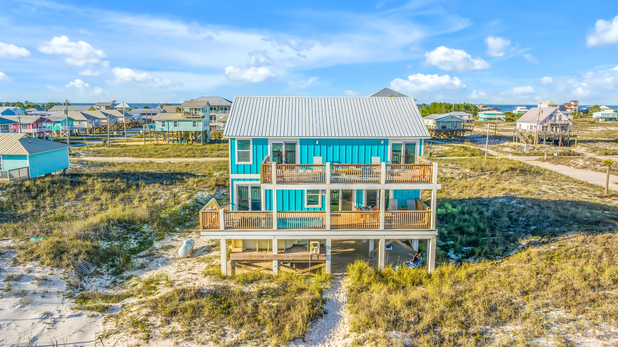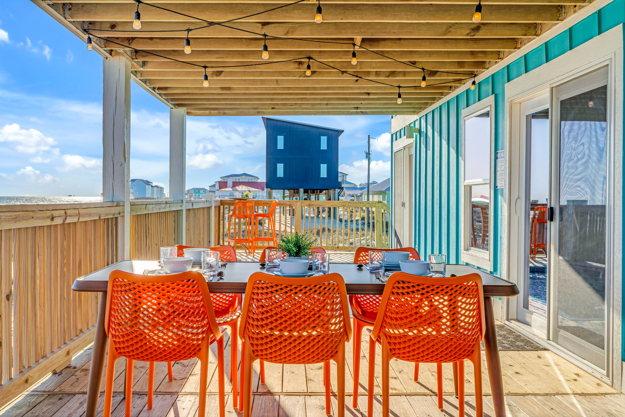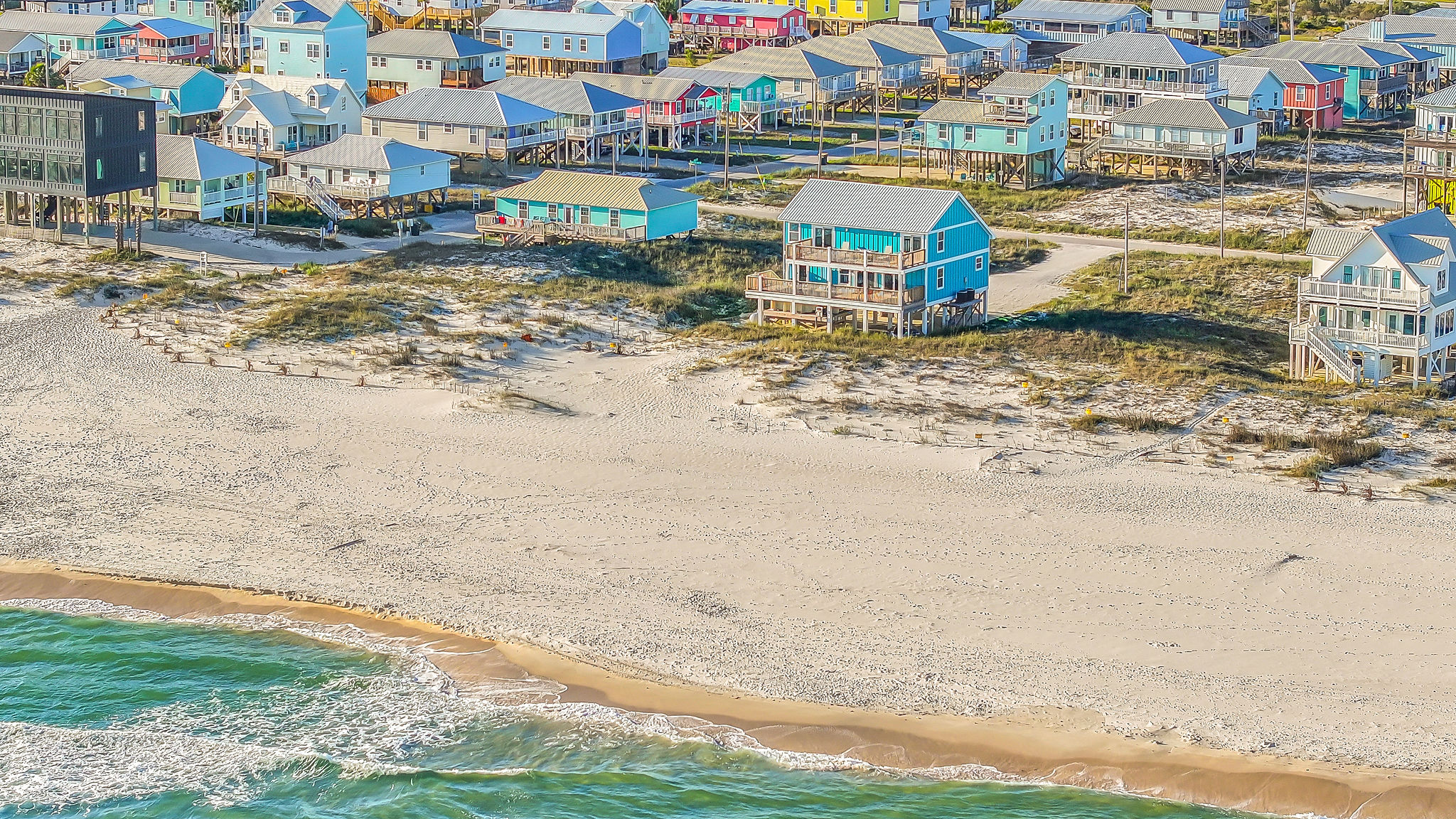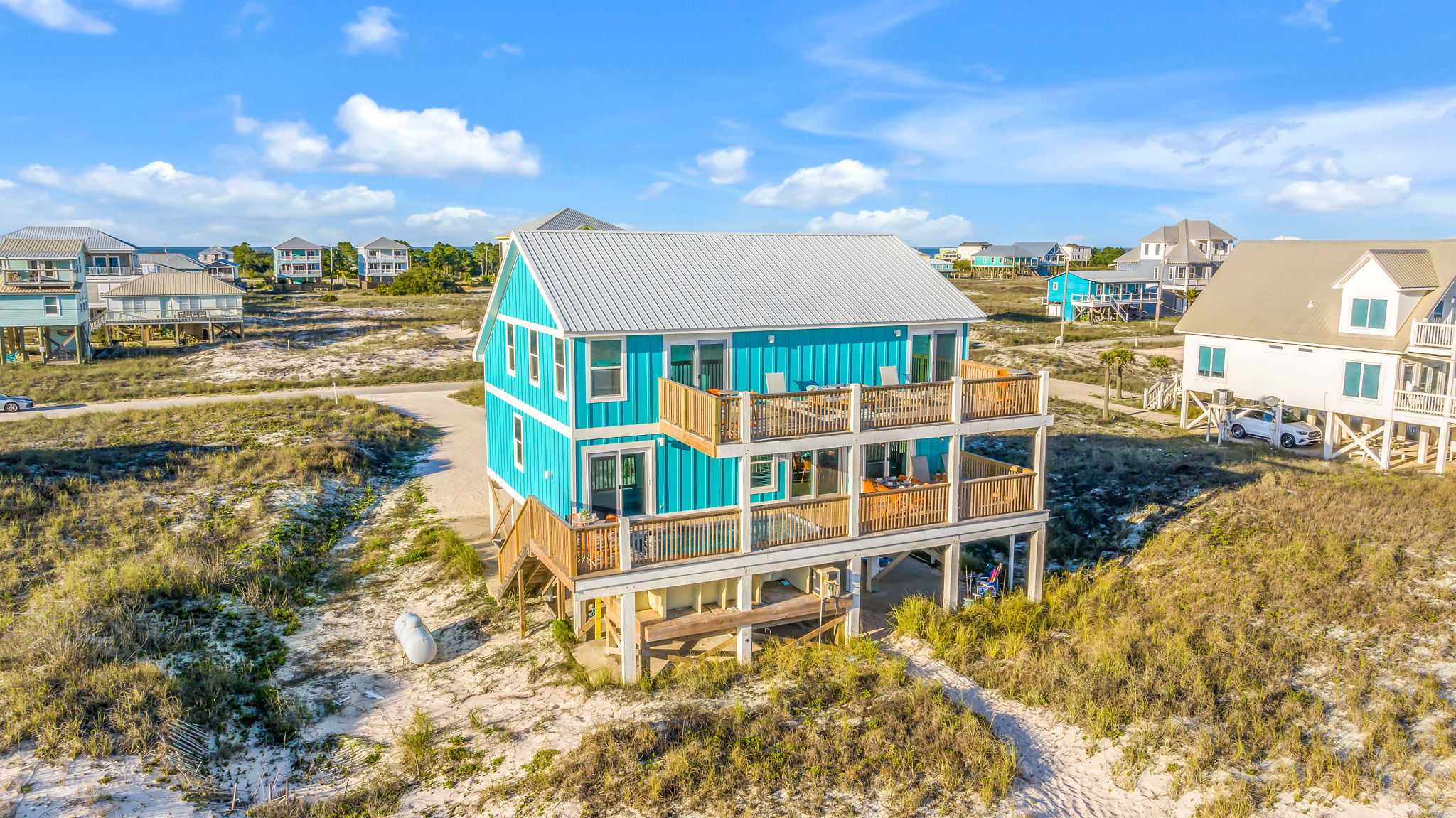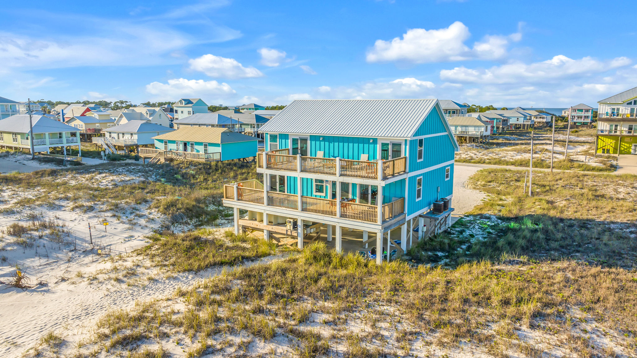 Gulf-Front Luxury with Private Pool & Sunset Views from Every Room Fully renovated in 2025, this stunning beachfront home in Gulf Shores offers the ultimate coastal escape for families, friends, and your four-legged crew. Wake up to endless Gulf views from every room, step directly from your deck onto the sand, and spend your days floating between the beach and your private heated pool. This is true Gulf-front living—where the sound of waves is your constant companion and sunset swims are just part of the daily routine. WHAT MAKES THIS HOME SPECIAL ✔ Direct beachfront—step from your deck straight onto the sand ✔ Unobstructed Gulf views from every single room ✔ Private heated pool on the deck for post-beach cooldowns ✔ Fully renovated in 2025 with coastal-chic design ✔ Dog-friendly—bring the whole pack THE SPACE Your two expansive Gulf-facing decks are where you'll spend most of your time. Start mornings with coffee and front-row sunrise views, gather for alfresco dinners at the outdoor table, or pull up a seat at the high-top pub seating with a cold drink as the sky turns pink and gold. When you need to cool off, dive into your private pool without ever leaving the view. And when the beach calls? You're already there—just step off the deck onto the sand. Inside, the fully stocked kitchen makes meal prep effortless, whether you're blending morning smoothies or prepping a seafood feast. The dining table has room for everyone, and the living room invites you to sink into the cognac leather sofa surrounded by boho-chic accents. Stream a movie on the 65" Smart TV or leave the windows open and let the sound of the waves be your entertainment. Rinse off the salt and sand in the outdoor shower, then decide whether your next move is the pool, the deck, or straight back to the beach. WHERE EVERYONE SLEEPS Main Floor: 2 Gulf-front king suites with deck access, 50" Smart TVs Upstairs: 2 Gulf-front king suites with deck access, 50" Smart TVs Upstairs: 1 bunk room with queen-over-twin and twin-over-twin bunks—perfect for kids As of 2025, every bed and mattress is brand new. Four full bathrooms (two per floor) with spa-inspired showers, plush towels, and boho decor throughout. GOOD TO KNOW ✔ Beach chairs, toys, and wagon included ✔ Private outdoor shower ✔ Washer and dryer in-unit ✔ Central A/C for year-round comfort ✔ Fast Wi-Fi for streaming or staying connected ✔ Dining favorites 5 minutes away (Tacky Jacks, Jessie's, Sassy Bass) ✔ Downtown Gulf Shores 20 minutes down the coast ✔ Fort Morgan's quieter, family-friendly vibe with easy access to everything POOL HEATING Want to swim even when it's cooler outside? Pool heating is available for $85/day and typically maintains a comfortable 80–85°F depending on the weather. Just let us know after booking, and we'll have it ready for your arrival. BOOK YOUR ESCAPE This is the kind of place where you lose track of time—where days blur into a perfect rhythm of beach, pool, deck, repeat. Whether you're here for a family reunion, a friends' trip, or just to unplug and recharge, this Gulf-front home delivers the vacation you've been dreaming about. Availability fills fast—check your dates now. Rose & Doug Waves & Wilderness