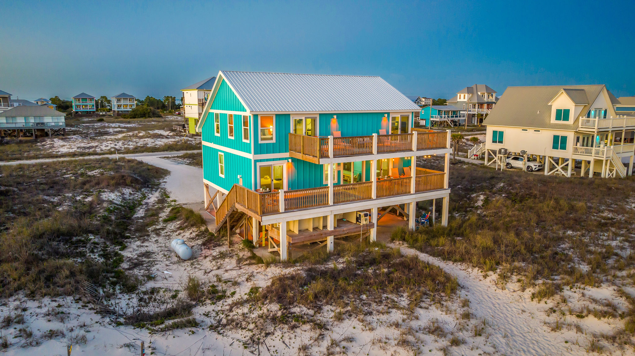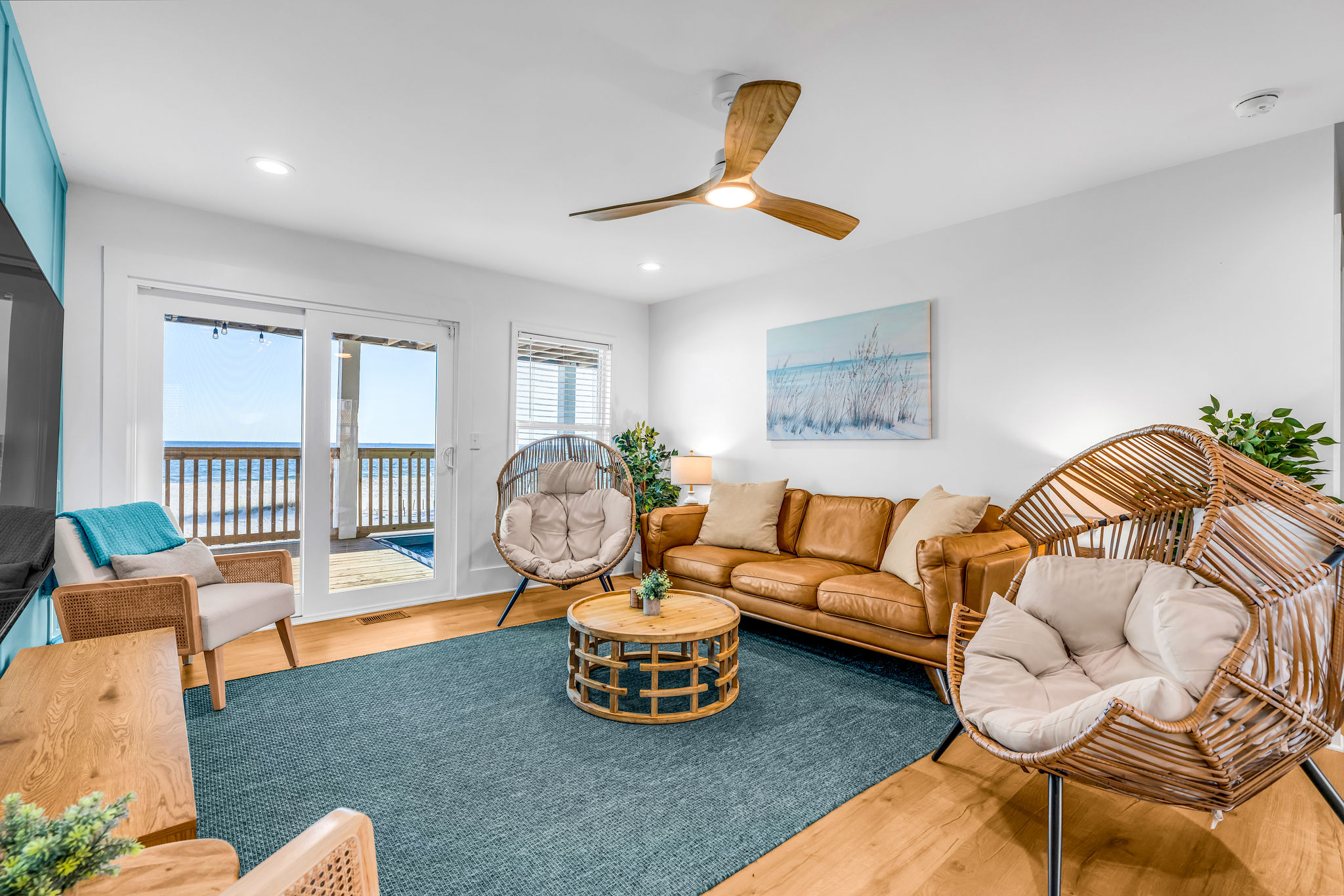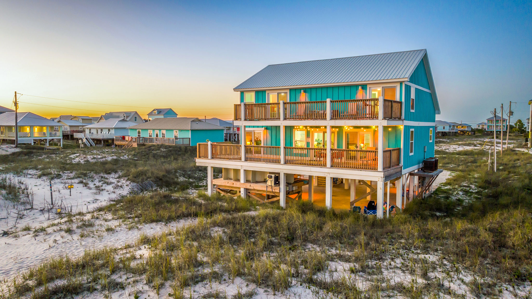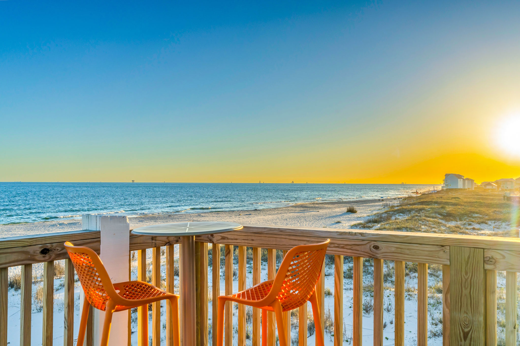Gulf-Front Luxury with Private Pool & Sunset Views from Every Room Fully renovated in 2025, this stunning beachfront home in Gulf Shores offers the ultimate coastal escape for families, friends, and your four-legged crew. Wake up to endless Gulf views from every room, step directly from your deck onto the sand, and spend your days floating between the beach and your private heated pool. This is true Gulf-front living—where the sound of waves is your constant companion and sunset swims are just part of the daily routine. WHAT MAKES THIS HOME SPECIAL ✔ Direct beachfront—step from your deck straight onto the sand ✔ Unobstructed Gulf views from every single room ✔ Private heated pool on the deck for post-beach cooldowns ✔ Fully renovated in 2025 with coastal-chic design ✔ Dog-friendly—bring the whole pack THE SPACE Your two expansive Gulf-facing decks are where you'll spend most of your time. Start mornings with coffee and front-row sunrise views, gather for alfresco dinners at the outdoor table, or pull up a seat at the high-top pub seating with a cold drink as the sky turns pink and gold. When you need to cool off, dive into your private pool without ever leaving the view. And when the beach calls? You're already there—just step off the deck onto the sand. Inside, the fully stocked kitchen makes meal prep effortless, whether you're blending morning smoothies or prepping a seafood feast. The dining table has room for everyone, and the living room invites you to sink into the cognac leather sofa surrounded by boho-chic accents. Stream a movie on the 65" Smart TV or leave the windows open and let the sound of the waves be your entertainment. Rinse off the salt and sand in the outdoor shower, then decide whether your next move is the pool, the deck, or straight back to the beach. WHERE EVERYONE SLEEPS Main Floor: 2 Gulf-front king suites with deck access, 50" Smart TVs Upstairs: 2 Gulf-front king suites with deck access, 50" Smart TVs Upstairs: 1 bunk room with queen-over-twin and twin-over-twin bunks—perfect for kids As of 2025, every bed and mattress is brand new. Four full bathrooms (two per floor) with spa-inspired showers, plush towels, and boho decor throughout. GOOD TO KNOW ✔ Beach chairs, toys, and wagon included ✔ Private outdoor shower ✔ Washer and dryer in-unit ✔ Central A/C for year-round comfort ✔ Fast Wi-Fi for streaming or staying connected ✔ Dining favorites 5 minutes away (Tacky Jacks, Jessie's, Sassy Bass) ✔ Downtown Gulf Shores 20 minutes down the coast ✔ Fort Morgan's quieter, family-friendly vibe with easy access to everything POOL HEATING Want to swim even when it's cooler outside? Pool heating is available for $85/day and typically maintains a comfortable 80–85°F depending on the weather. Just let us know after booking, and we'll have it ready for your arrival. BOOK YOUR ESCAPE This is the kind of place where you lose track of time—where days blur into a perfect rhythm of beach, pool, deck, repeat. Whether you're here for a family reunion, a friends' trip, or just to unplug and recharge, this Gulf-front home delivers the vacation you've been dreaming about. Availability fills fast—check your dates now. Rose & Doug Waves & Wilderness