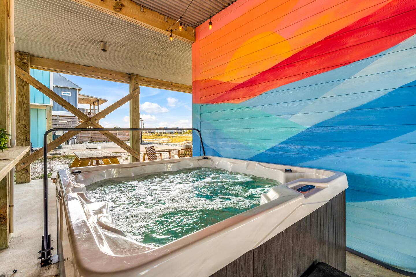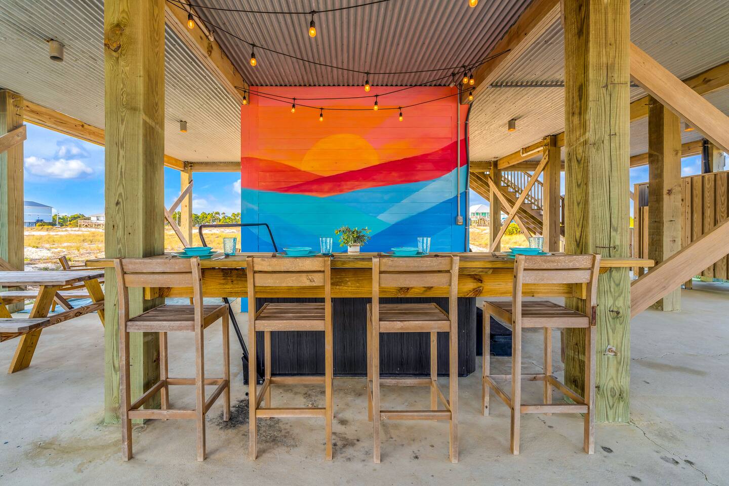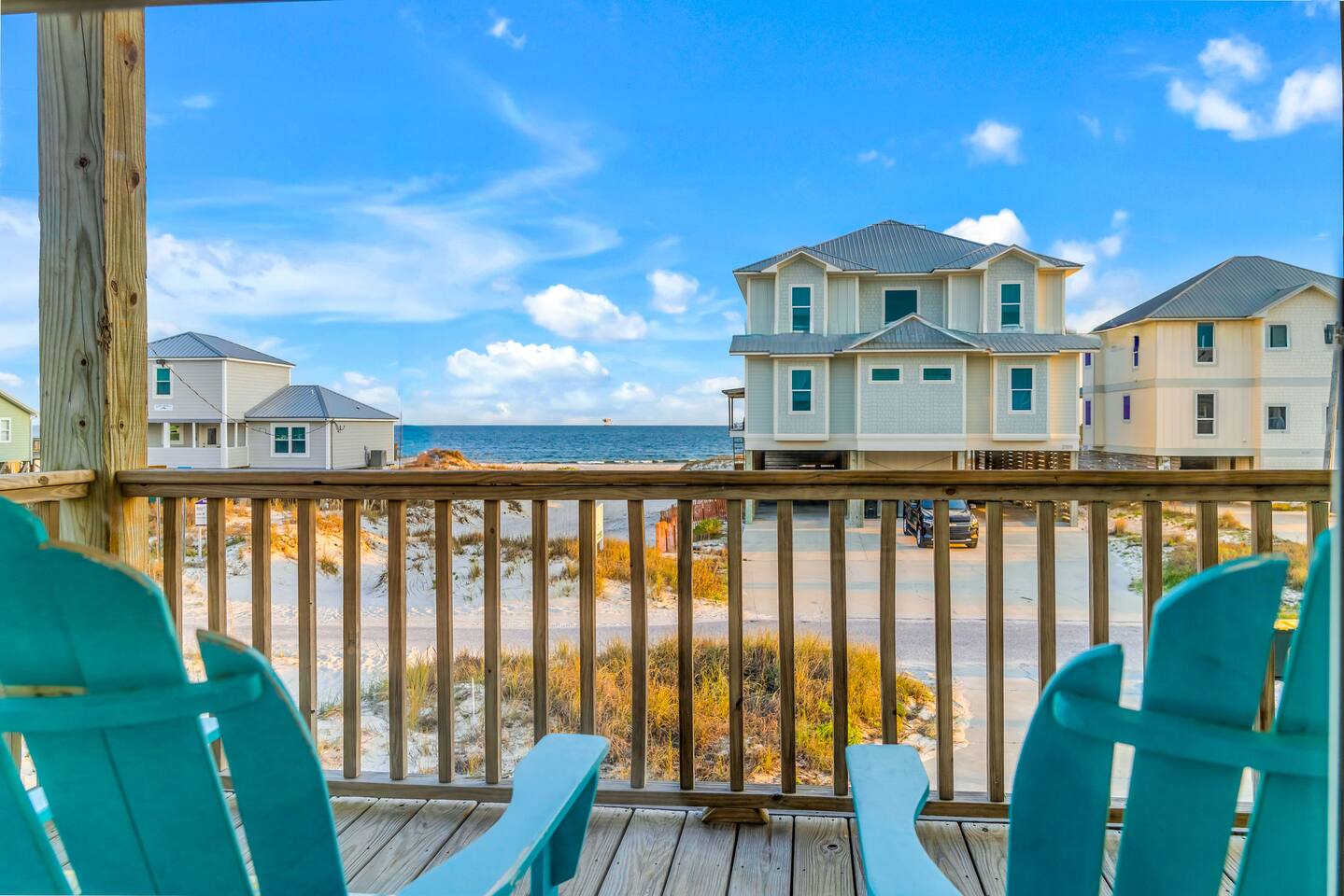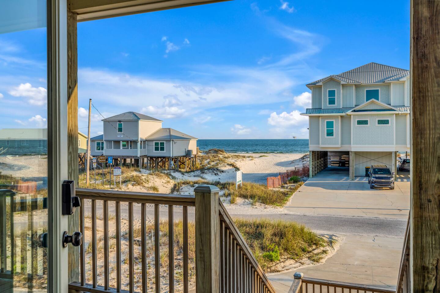 Gulf Views, Hot Tub & Beach Across the Street—All on One Level This single-story coastal retreat in Gulf Shores gives you the best of both worlds: stunning Gulf views from your front deck and beach access just steps across the street—all without the oceanfront price tag. With three king suites, a bunk room for the kids, and a killer outdoor hangout area complete with hot tub, bar, and games, this is where beach days and late nights come together perfectly. Wake up to Gulf breezes, spend your days between the sand and the hot tub, and end each night with sunset cocktails from your front-row deck. WHAT MAKES THIS HOME SPECIAL ✔ Gulf views from the front deck + beach across the street ✔ Single-level layout—no stairs, easy living ✔ Private outdoor bar, hot tub & game area under the house ✔ 3 king suites with private bathrooms + bunk room ✔ Dog-friendly—beach life is better with your pup THE SPACE Your Gulf-facing front deck is where mornings begin—coffee in hand, sunrise painting the water, planning which beach you'll hit first. As the day winds down, grab a seat with a cold drink and watch the sky turn pink and gold over the waves. Below, your private shaded hangout area is the real MVP. Fire up the outdoor bar, sink into the hot tub after a long beach day, challenge someone to cornhole, and let the good times roll. Rinse off the sand in the outdoor shower and decide whether your next move is the hot tub or back to the beach—it's only across the street. Inside, the fully stocked kitchen handles everything from quick breakfast tacos to full seafood spreads. The dining table seats everyone comfortably, and the living room invites you to kick back on stylish boho-chic seating and stream whatever you're binge-watching on the 65" Smart TV. The single-level layout means no one's hauling luggage upstairs or chasing kids between floors—just easy, breezy beach house living. WHERE EVERYONE SLEEPS 3 king suites with Gulf views, private en-suite bathrooms, 50" Smart TVs 1 bunk room with full-over-full bunk + extra twin bed—perfect for kids or teens All beds and mattresses are brand new as of 2025. Four full bathrooms total (three private en-suites, one hallway bath for the bunk room) with spa-style showers, boho accents, and plush towels throughout. GOOD TO KNOW ✔ Beach chairs, wagon, toys, and gear included ✔ Outdoor shower for easy post-beach cleanup ✔ Washer and dryer in-unit ✔ Central A/C and fast Wi-Fi ✔ Dining favorites 5 minutes away (Tacky Jacks, Jessie's, Sassy Bass) ✔ Downtown Gulf Shores is 20 minutes down the coast BOOK YOUR ESCAPE This is the kind of place that becomes your new beach tradition—where you're close enough to hear the waves but far enough from the crowd to have your own vibe. Morning beach walks, afternoon hot tub hangs, evening games at the bar. If you want Gulf views, easy beach access, and a single-level layout that just works, you've found it. Availability fills fast—check your dates now. Rose & Doug Waves & Wilderness