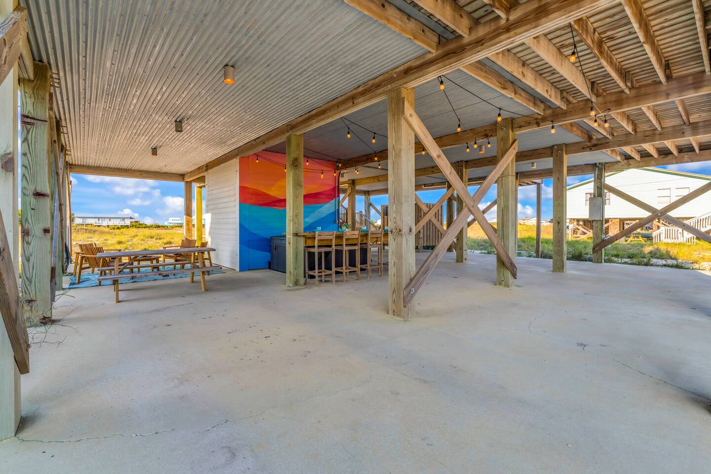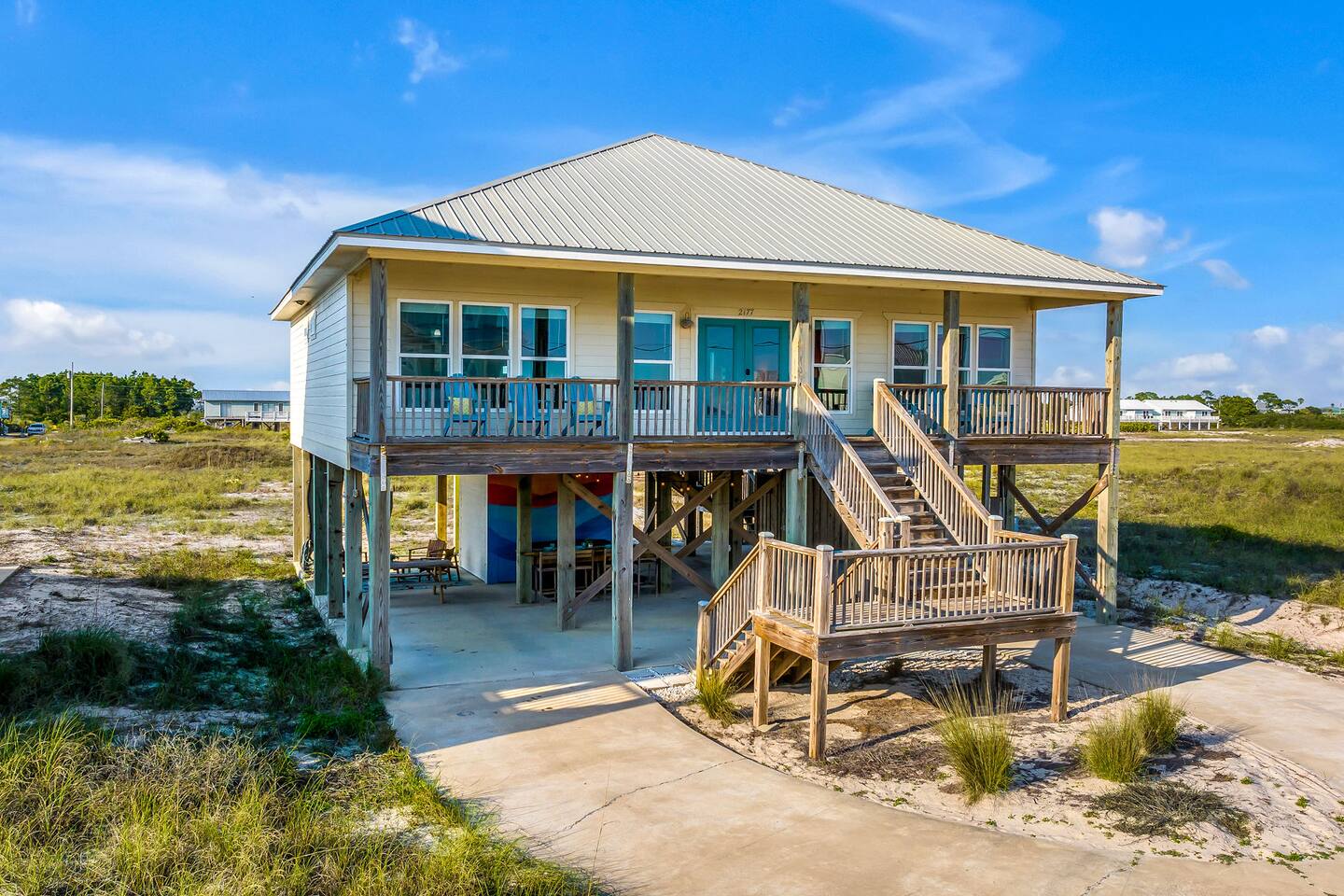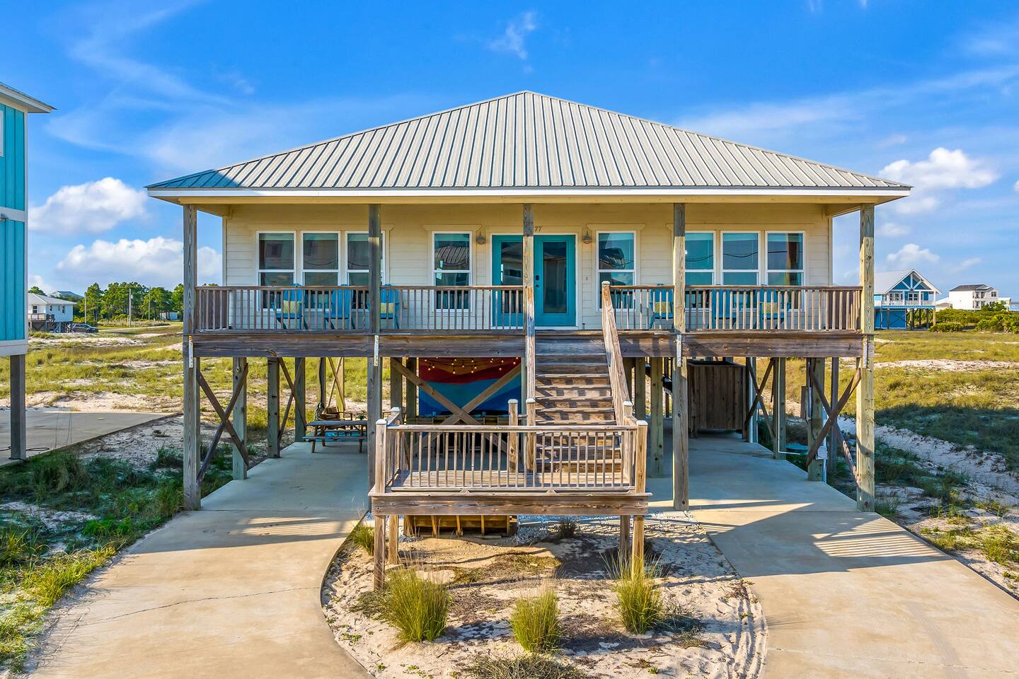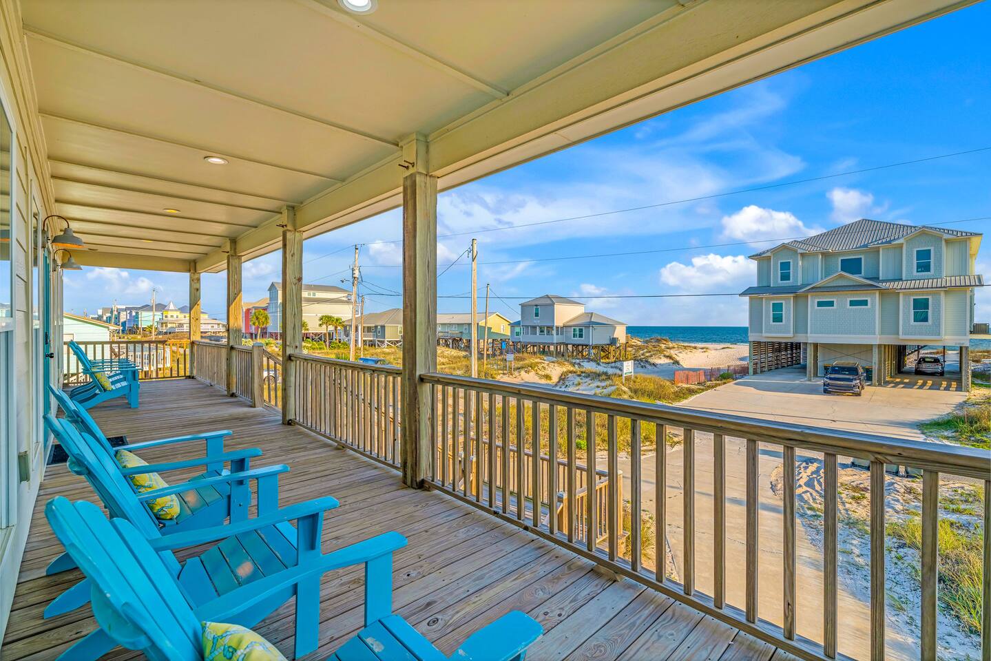 ✔ Directly Across From Public Beach ✔ Private Hot Tub ✔ All Dogs Welcome, Dog-Friendly Beach ✔️ 4 bedrooms, 4 baths, Sleeps 10 ✔️ Gulf-Facing Deck – Soak in the salt air and watch the waves roll in from an expansive deck with lounge seating. ✔️ Outdoor Oasis – Hang in your own shaded bar area under the house, complete with hot tub, cornhole, and comfy seating ✔️ Beach Gear, Linens & Soaps Included. ✔️ Outdoor Shower