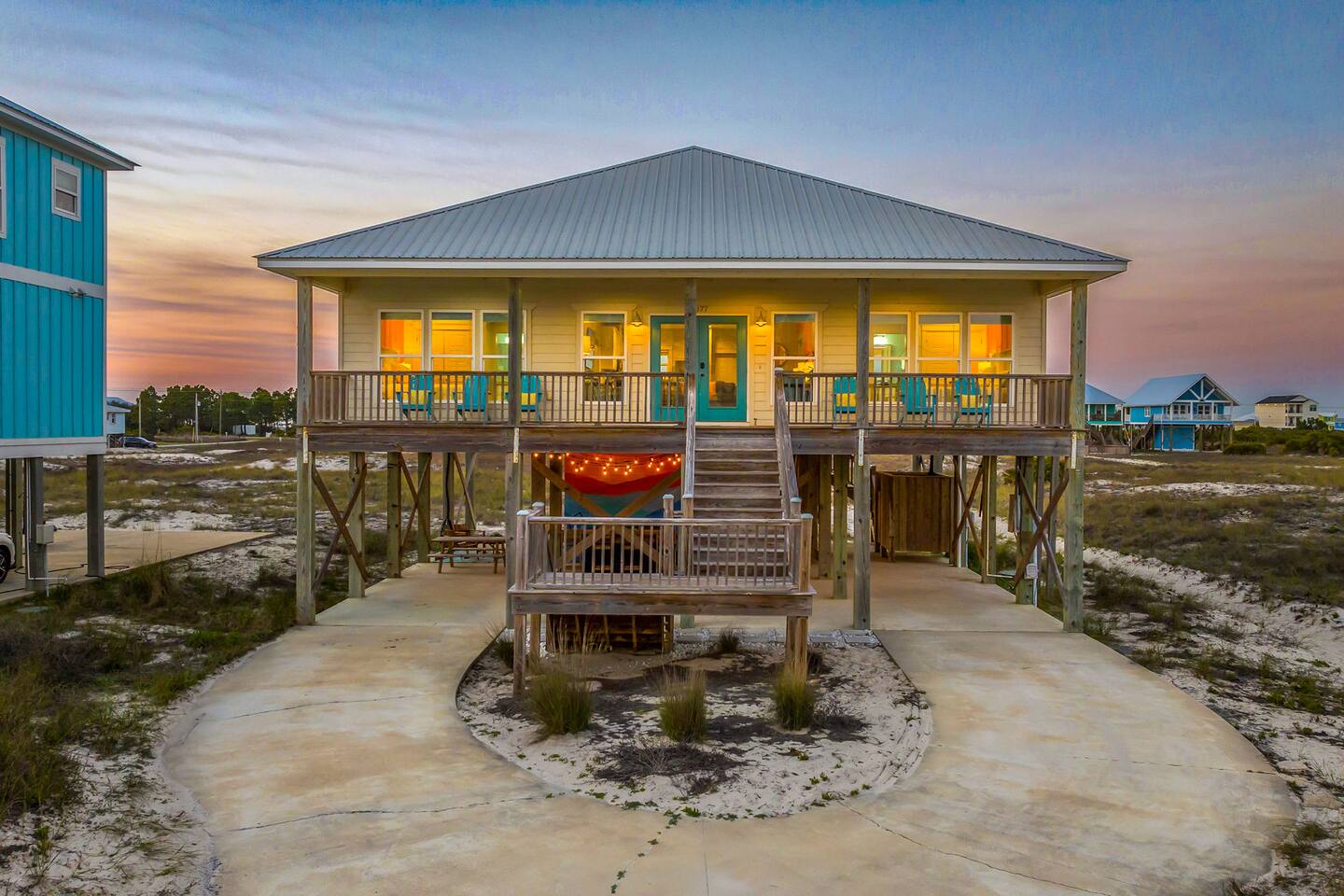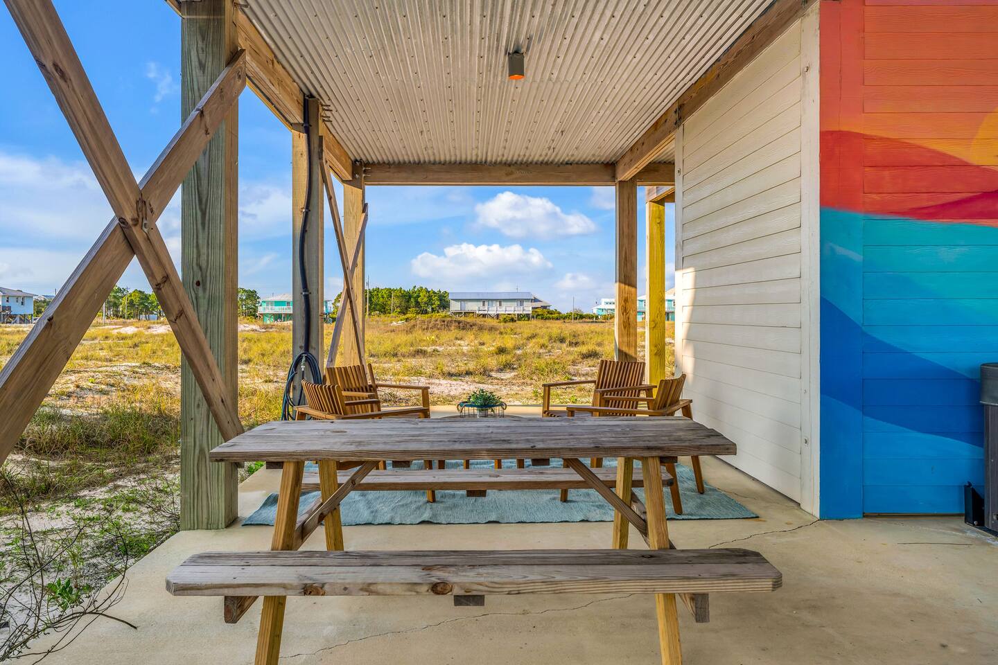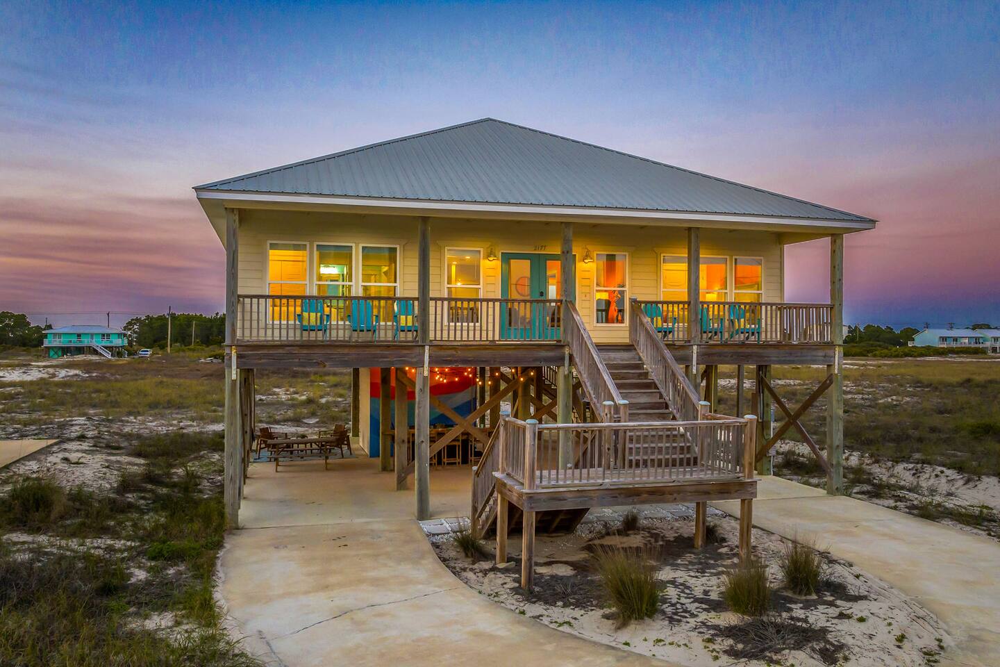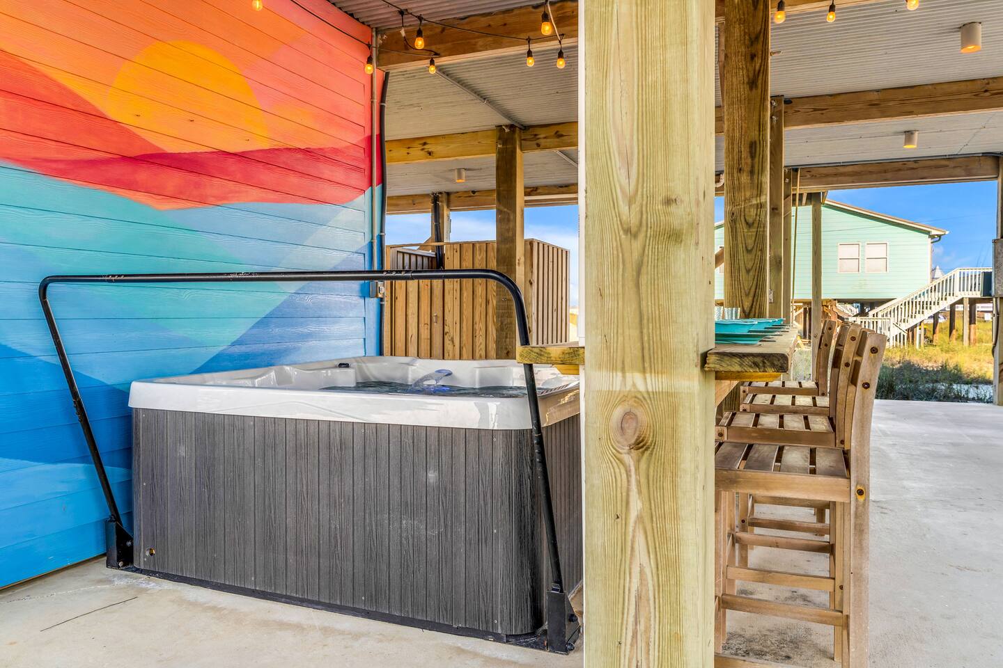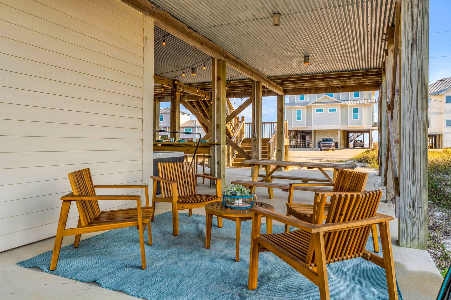 ✔ Directly Across From Public Beach ✔ Private Hot Tub ✔ All Dogs Welcome, Dog-Friendly Beach ✔️ 4 bedrooms, 4 baths, Sleeps 10 ✔️ Gulf-Facing Deck – Soak in the salt air and watch the waves roll in from an expansive deck with lounge seating. ✔️ Outdoor Oasis – Hang in your own shaded bar area under the house, complete with hot tub, cornhole, and comfy seating ✔️ Beach Gear, Linens & Soaps Included. ✔️ Outdoor Shower