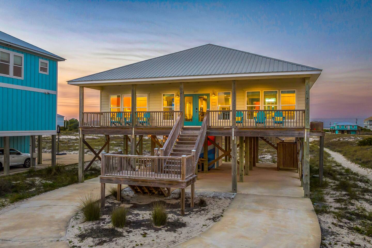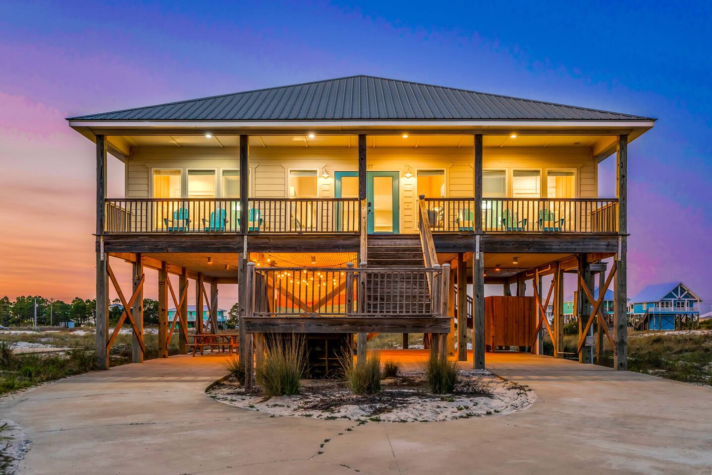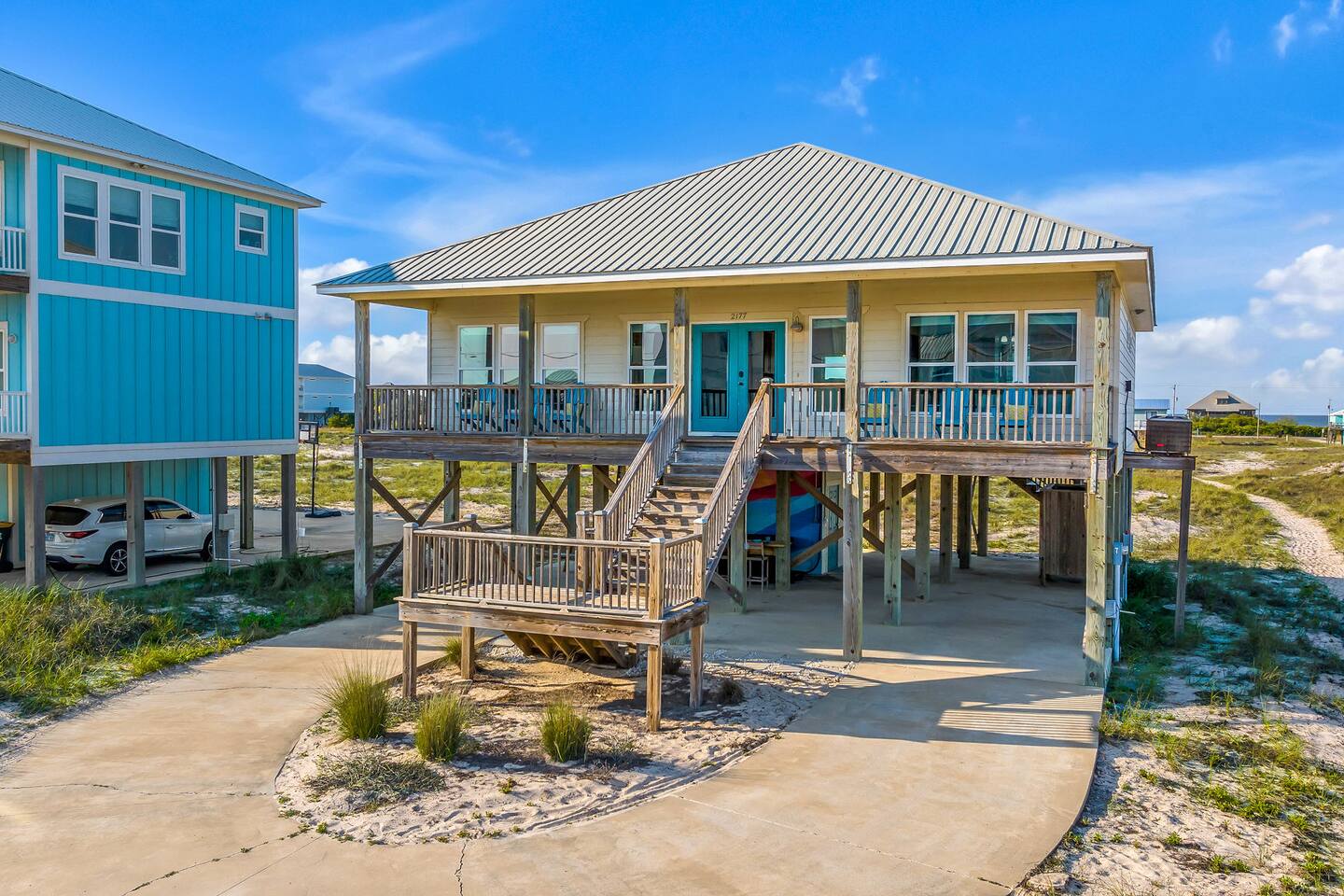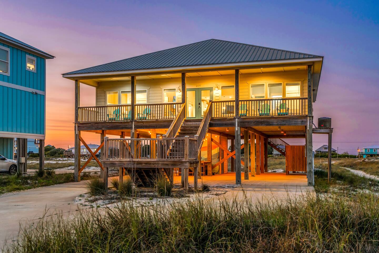 ✔ Directly Across From Public Beach ✔ Private Hot Tub ✔ All Dogs Welcome, Dog-Friendly Beach ✔️ 4 bedrooms, 4 baths, Sleeps 10 ✔️ Gulf-Facing Deck – Soak in the salt air and watch the waves roll in from an expansive deck with lounge seating. ✔️ Outdoor Oasis – Hang in your own shaded bar area under the house, complete with hot tub, cornhole, and comfy seating ✔️ Beach Gear, Linens & Soaps Included. ✔️ Outdoor Shower