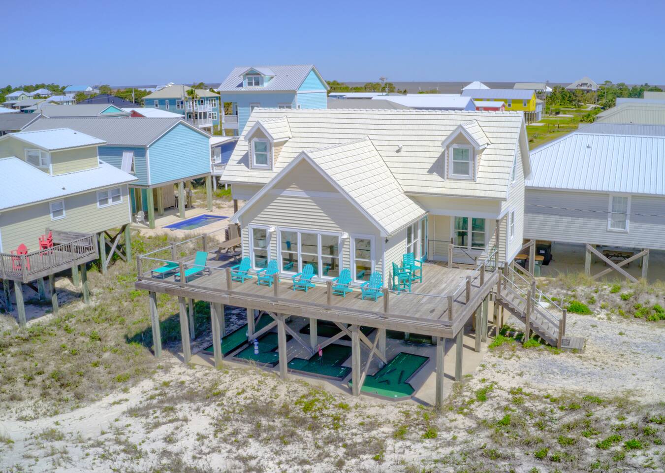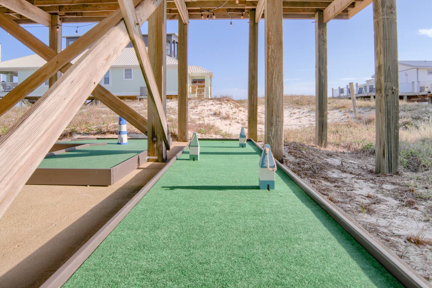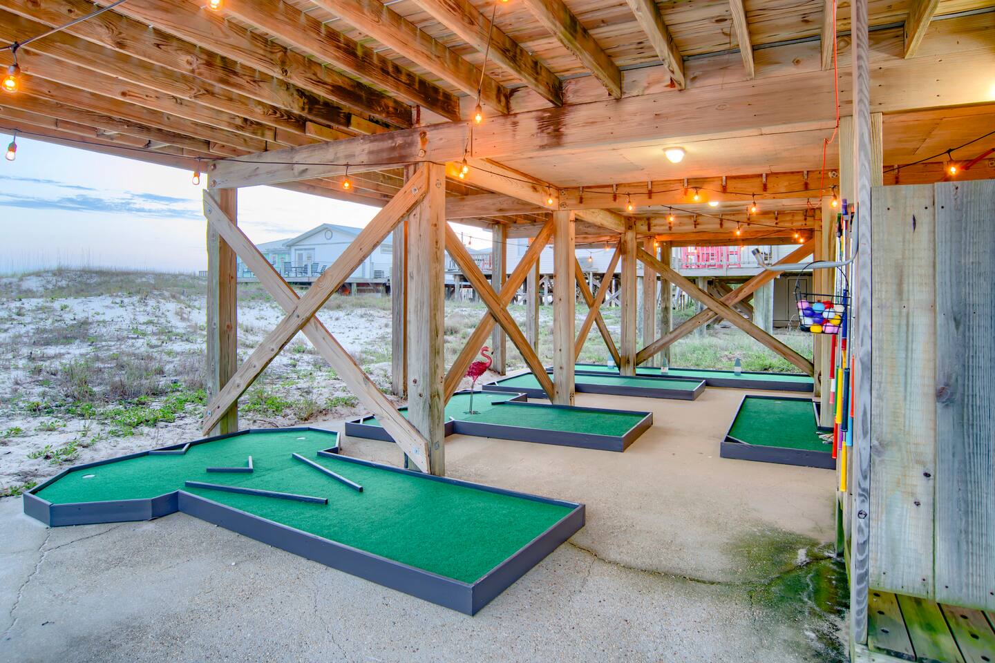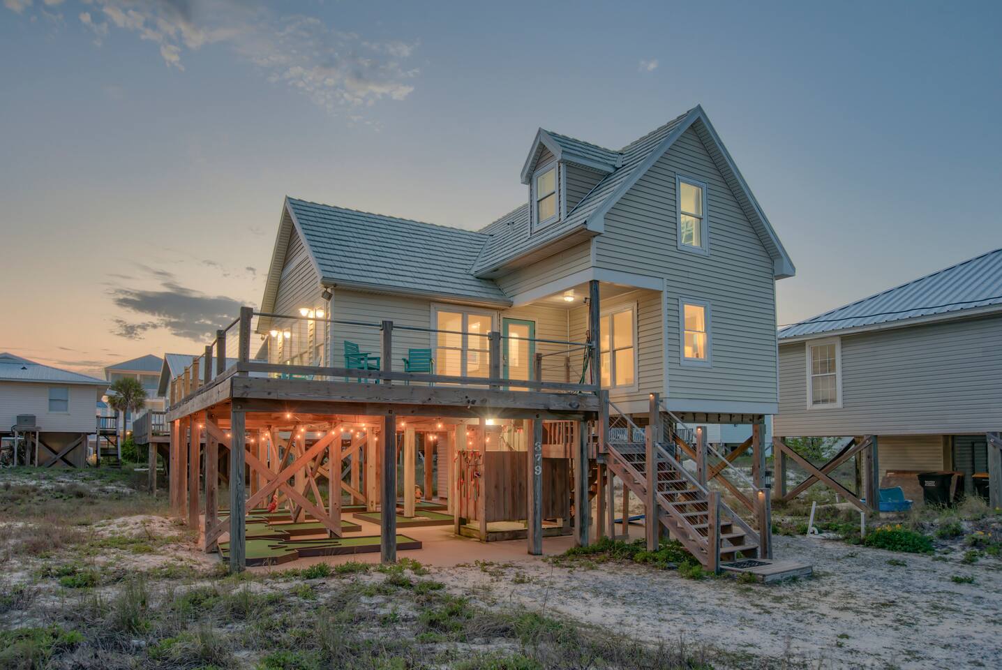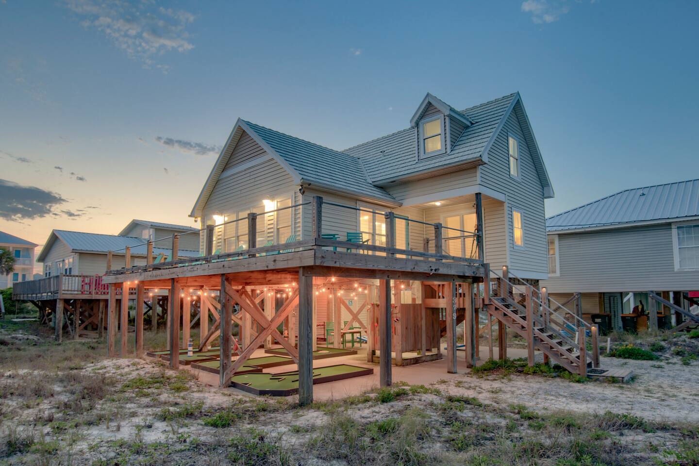Steps to the Beach, Wrap-Around Deck & Mini Golf at Your Door Wake up to the sound of crashing waves and step directly onto the sand—no roads to cross, no long walks, just pure beachfront access from your door. This 4-bedroom Gulf Shores beach house features a wrap-around deck with unobstructed ocean views, an 8-hole putt-putt course, and all the coastal charm you need for the perfect family getaway. Spend your days between the beach and the deck, challenge the kids to mini golf or cornhole, fire up the grill for sunset dinners, and let the sound of the waves be your soundtrack. WHAT MAKES THIS HOME SPECIAL ✔ Direct beach access—steps from your door to the sand ✔ Wrap-around deck with sweeping Gulf views ✔ 8-hole mini golf course + cornhole under the house ✔ Sleeps 10 in 4 bedrooms with coastal-boho vibes ✔ Dog-friendly home and beach—bring the whole pack THE SPACE Floor-to-ceiling windows frame postcard-worthy Gulf views from the moment you walk in. The open-concept main floor flows seamlessly from kitchen to dining to living room, keeping everyone connected whether you're prepping breakfast burritos, dealing cards at the table, or sinking into the cognac leather sectional for movie night on the 65" Smart TV. Outside, your wrap-around deck is the heart of the home. Lounge in the Adirondack chairs with your morning coffee, gather around the outdoor dining table for grilled seafood dinners, and watch the sun dip into the Gulf with a cold drink in hand. When you're ready for the beach, it's right there—just a few steps and you're toes-in-the-sand. The real surprise? Your own 8-hole putt-putt course and cornhole setup under the house. Perfect for post-beach entertainment, friendly competition, or keeping the kids busy while you finish that chapter. Rinse off the sand in the outdoor shower and decide whether your next move is mini golf, the beach, or back to the deck. WHERE EVERYONE SLEEPS Main Floor: 2 king bedrooms (one with Gulf views from bed), Smart TVs Upstairs: 1 king bedroom with Gulf views, Smart TV Upstairs: 1 bunk room with 2 twin-over-twin bunks (sleeps 4 kids), Smart TV Two full bathrooms (one per floor). All linens and towels provided. GOOD TO KNOW ✔ Beach chairs, boogie boards, toys, and wagon included ✔ Outdoor shower for easy cleanup ✔ BBQ grill on the deck ✔ Pack 'n Play and high chair provided ✔ Washer and dryer in-unit ✔ Central A/C and fast Wi-Fi ✔ Local shops 5 minutes away, downtown Gulf Shores 20 minutes ✔ Tacky Jack's and Sassy Bass nearby for easy dinners out BOOK YOUR ESCAPE This is the kind of place where vacation just flows—beach walks, mini golf tournaments, deck hangs, repeat. If you want direct beach access, sweeping Gulf views, and built-in entertainment for the whole crew, this is it. Availability fills fast—check your dates now. Doug & Rose Waves & Wilderness