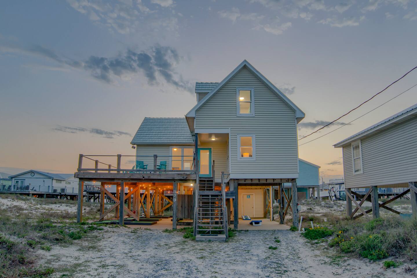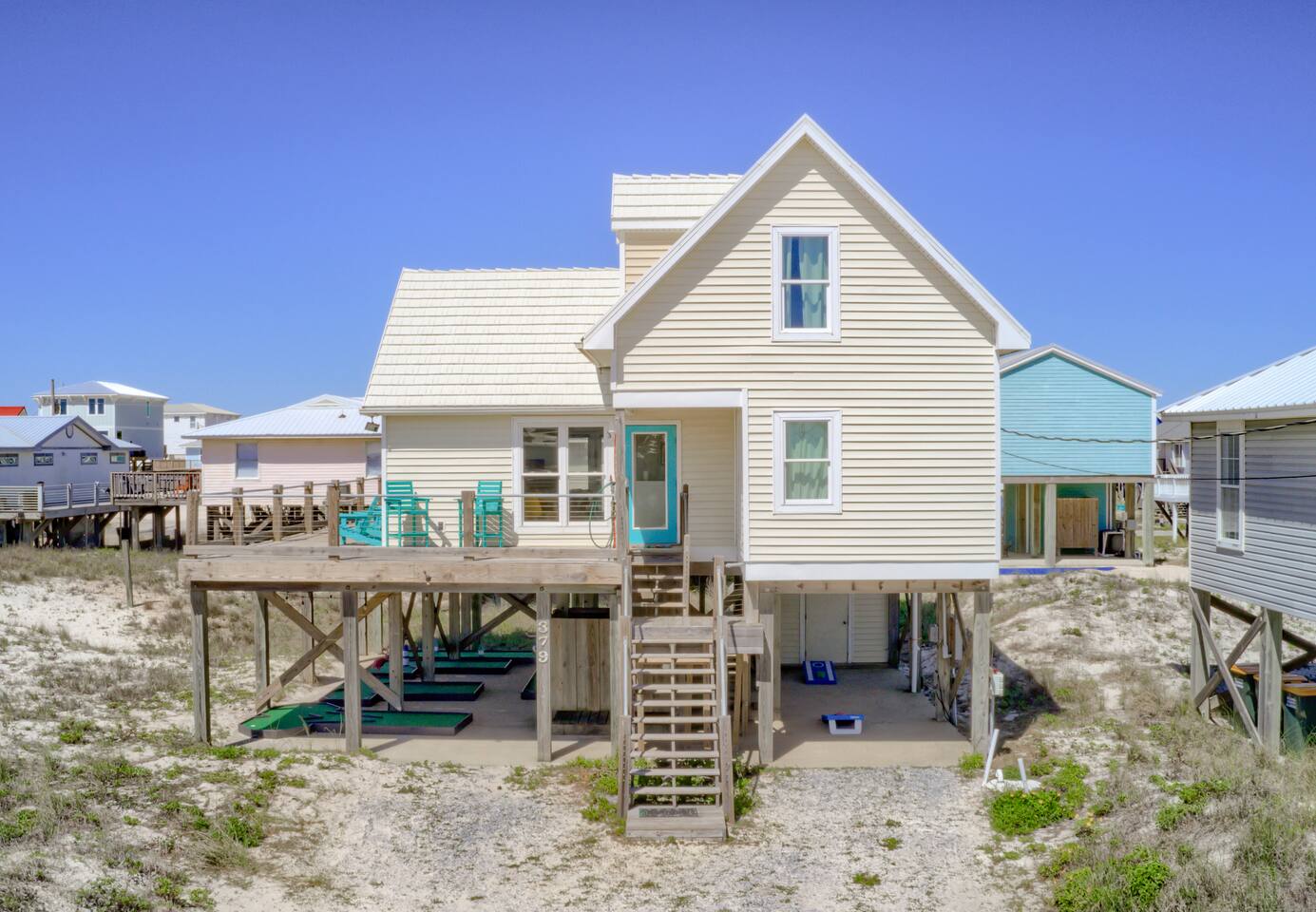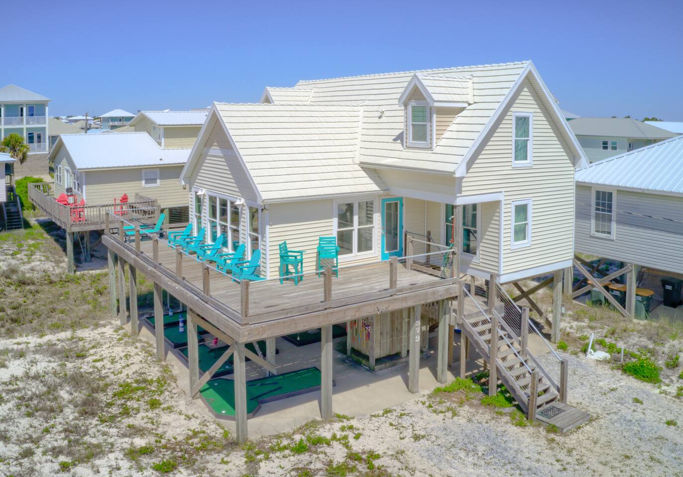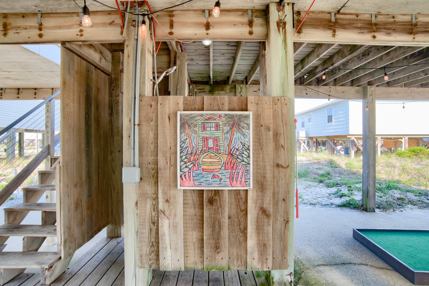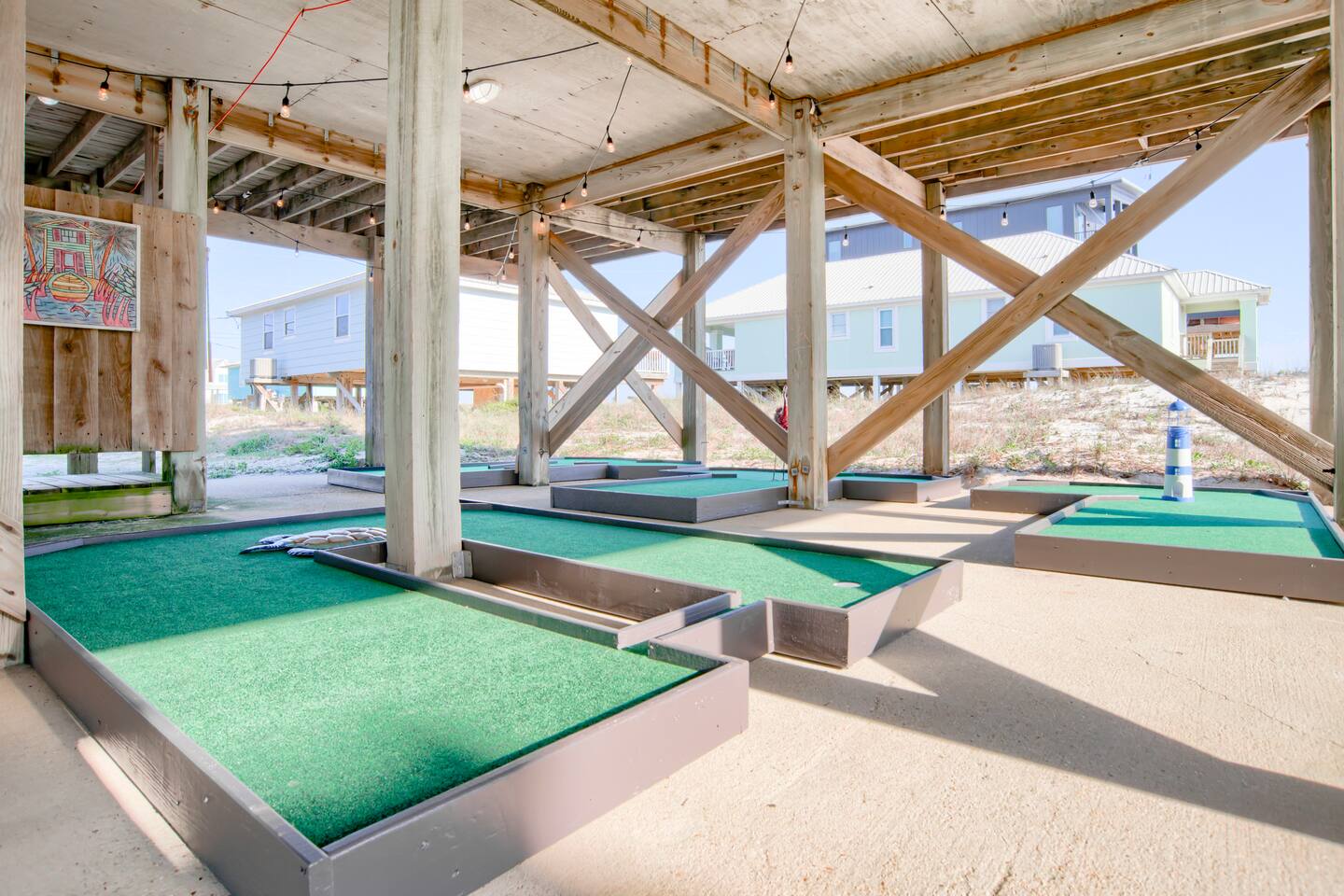 Steps to the Beach, Wrap-Around Deck & Mini Golf at Your Door Wake up to the sound of crashing waves and step directly onto the sand—no roads to cross, no long walks, just pure beachfront access from your door. This 4-bedroom Gulf Shores beach house features a wrap-around deck with unobstructed ocean views, an 8-hole putt-putt course, and all the coastal charm you need for the perfect family getaway. Spend your days between the beach and the deck, challenge the kids to mini golf or cornhole, fire up the grill for sunset dinners, and let the sound of the waves be your soundtrack. WHAT MAKES THIS HOME SPECIAL ✔ Direct beach access—steps from your door to the sand ✔ Wrap-around deck with sweeping Gulf views ✔ 8-hole mini golf course + cornhole under the house ✔ Sleeps 10 in 4 bedrooms with coastal-boho vibes ✔ Dog-friendly home and beach—bring the whole pack THE SPACE Floor-to-ceiling windows frame postcard-worthy Gulf views from the moment you walk in. The open-concept main floor flows seamlessly from kitchen to dining to living room, keeping everyone connected whether you're prepping breakfast burritos, dealing cards at the table, or sinking into the cognac leather sectional for movie night on the 65" Smart TV. Outside, your wrap-around deck is the heart of the home. Lounge in the Adirondack chairs with your morning coffee, gather around the outdoor dining table for grilled seafood dinners, and watch the sun dip into the Gulf with a cold drink in hand. When you're ready for the beach, it's right there—just a few steps and you're toes-in-the-sand. The real surprise? Your own 8-hole putt-putt course and cornhole setup under the house. Perfect for post-beach entertainment, friendly competition, or keeping the kids busy while you finish that chapter. Rinse off the sand in the outdoor shower and decide whether your next move is mini golf, the beach, or back to the deck. WHERE EVERYONE SLEEPS Main Floor: 2 king bedrooms (one with Gulf views from bed), Smart TVs Upstairs: 1 king bedroom with Gulf views, Smart TV Upstairs: 1 bunk room with 2 twin-over-twin bunks (sleeps 4 kids), Smart TV Two full bathrooms (one per floor). All linens and towels provided. GOOD TO KNOW ✔ Beach chairs, boogie boards, toys, and wagon included ✔ Outdoor shower for easy cleanup ✔ BBQ grill on the deck ✔ Pack 'n Play and high chair provided ✔ Washer and dryer in-unit ✔ Central A/C and fast Wi-Fi ✔ Local shops 5 minutes away, downtown Gulf Shores 20 minutes ✔ Tacky Jack's and Sassy Bass nearby for easy dinners out BOOK YOUR ESCAPE This is the kind of place where vacation just flows—beach walks, mini golf tournaments, deck hangs, repeat. If you want direct beach access, sweeping Gulf views, and built-in entertainment for the whole crew, this is it. Availability fills fast—check your dates now. Doug & Rose Waves & Wilderness