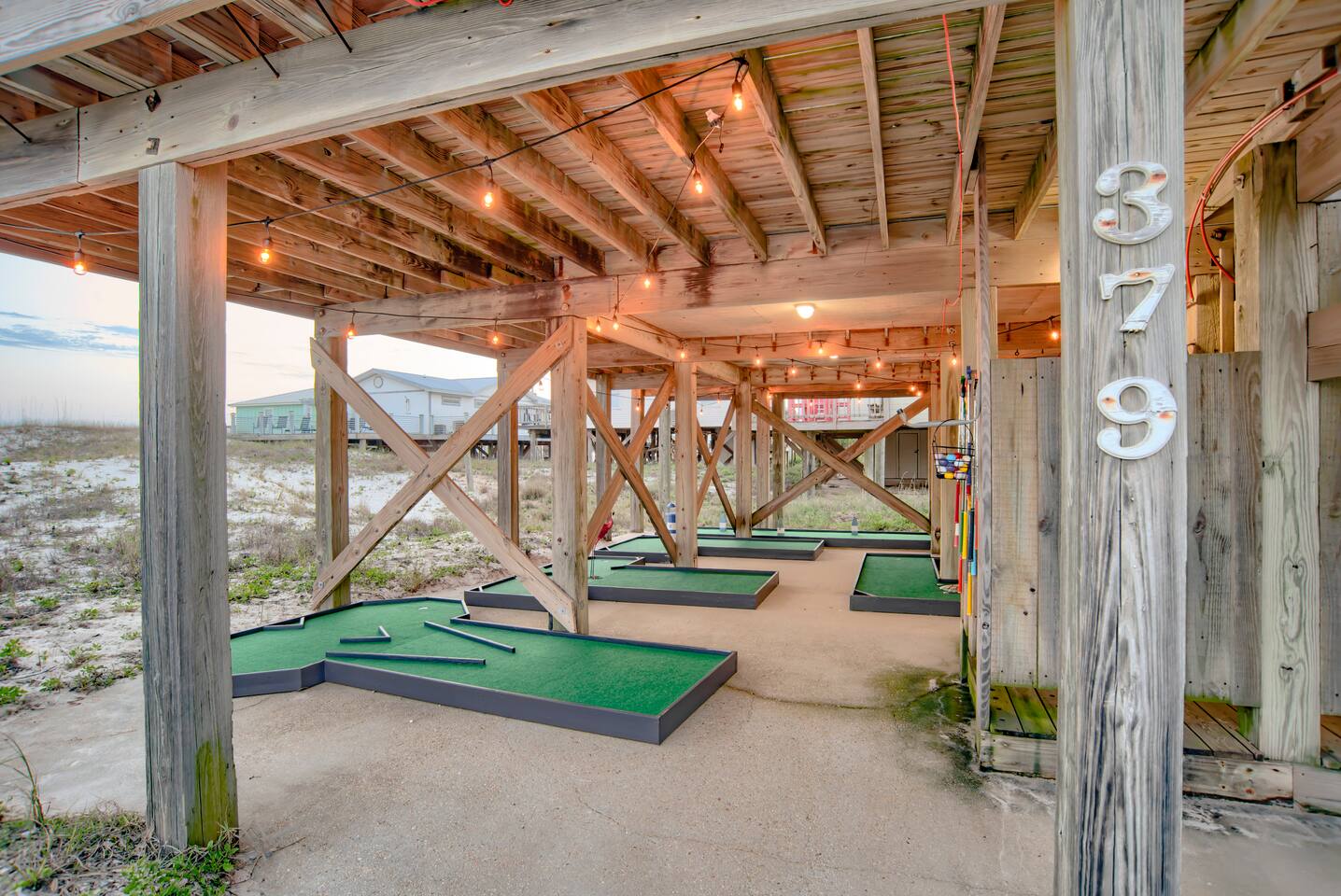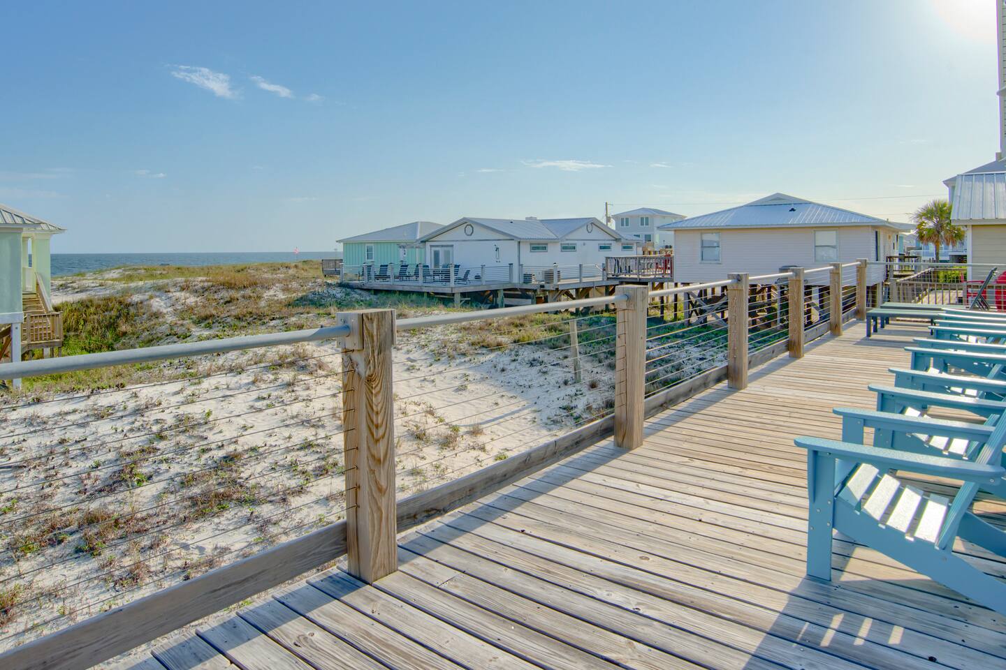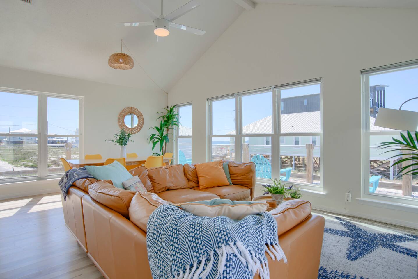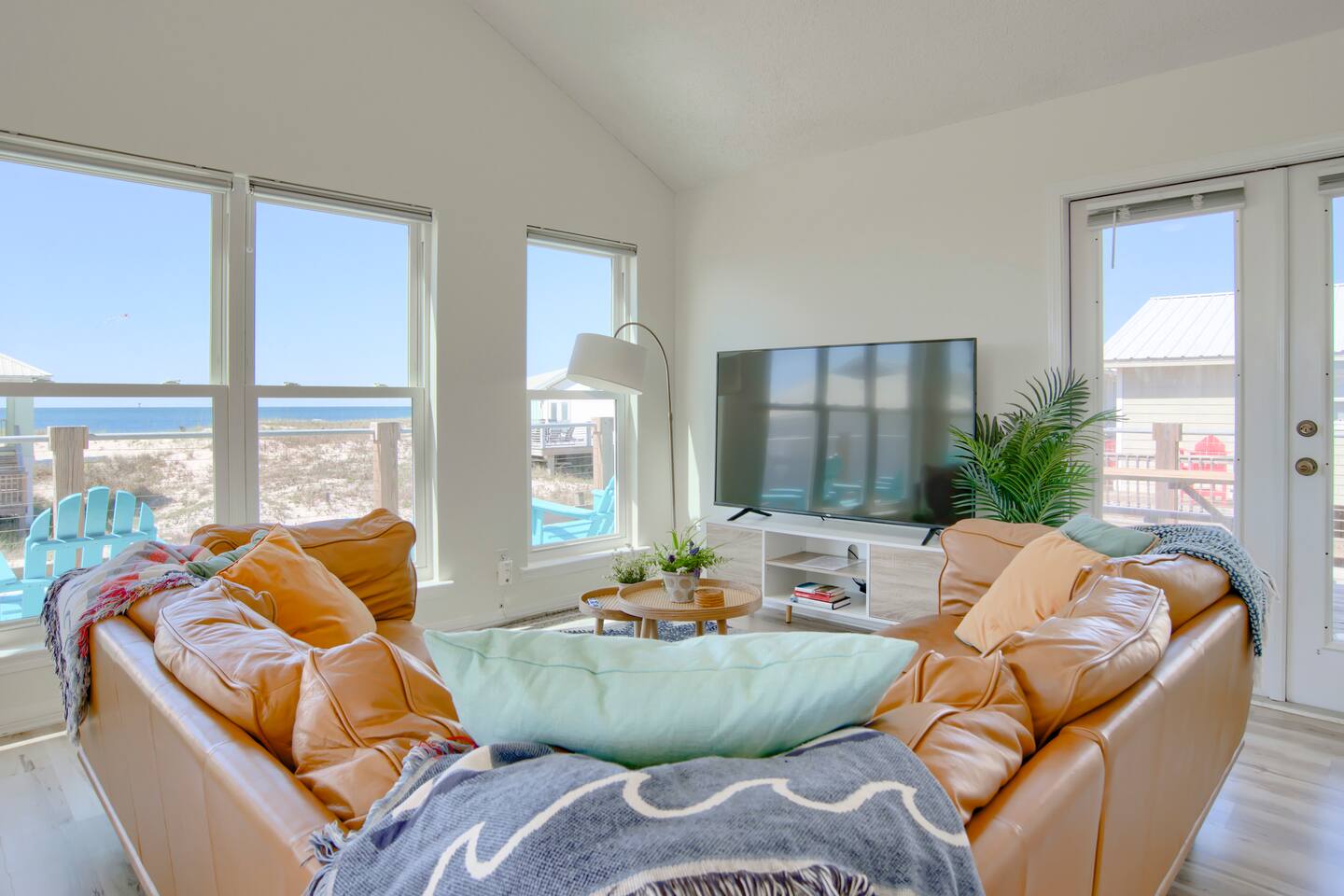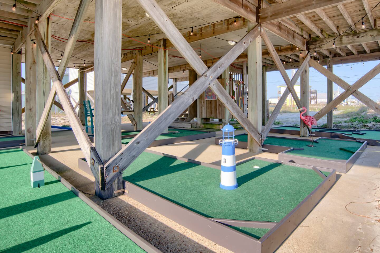 Steps to the Beach, Wrap-Around Deck & Mini Golf at Your Door Wake up to the sound of crashing waves and step directly onto the sand—no roads to cross, no long walks, just pure beachfront access from your door. This 4-bedroom Gulf Shores beach house features a wrap-around deck with unobstructed ocean views, an 8-hole putt-putt course, and all the coastal charm you need for the perfect family getaway. Spend your days between the beach and the deck, challenge the kids to mini golf or cornhole, fire up the grill for sunset dinners, and let the sound of the waves be your soundtrack. WHAT MAKES THIS HOME SPECIAL ✔ Direct beach access—steps from your door to the sand ✔ Wrap-around deck with sweeping Gulf views ✔ 8-hole mini golf course + cornhole under the house ✔ Sleeps 10 in 4 bedrooms with coastal-boho vibes ✔ Dog-friendly home and beach—bring the whole pack THE SPACE Floor-to-ceiling windows frame postcard-worthy Gulf views from the moment you walk in. The open-concept main floor flows seamlessly from kitchen to dining to living room, keeping everyone connected whether you're prepping breakfast burritos, dealing cards at the table, or sinking into the cognac leather sectional for movie night on the 65" Smart TV. Outside, your wrap-around deck is the heart of the home. Lounge in the Adirondack chairs with your morning coffee, gather around the outdoor dining table for grilled seafood dinners, and watch the sun dip into the Gulf with a cold drink in hand. When you're ready for the beach, it's right there—just a few steps and you're toes-in-the-sand. The real surprise? Your own 8-hole putt-putt course and cornhole setup under the house. Perfect for post-beach entertainment, friendly competition, or keeping the kids busy while you finish that chapter. Rinse off the sand in the outdoor shower and decide whether your next move is mini golf, the beach, or back to the deck. WHERE EVERYONE SLEEPS Main Floor: 2 king bedrooms (one with Gulf views from bed), Smart TVs Upstairs: 1 king bedroom with Gulf views, Smart TV Upstairs: 1 bunk room with 2 twin-over-twin bunks (sleeps 4 kids), Smart TV Two full bathrooms (one per floor). All linens and towels provided. GOOD TO KNOW ✔ Beach chairs, boogie boards, toys, and wagon included ✔ Outdoor shower for easy cleanup ✔ BBQ grill on the deck ✔ Pack 'n Play and high chair provided ✔ Washer and dryer in-unit ✔ Central A/C and fast Wi-Fi ✔ Local shops 5 minutes away, downtown Gulf Shores 20 minutes ✔ Tacky Jack's and Sassy Bass nearby for easy dinners out BOOK YOUR ESCAPE This is the kind of place where vacation just flows—beach walks, mini golf tournaments, deck hangs, repeat. If you want direct beach access, sweeping Gulf views, and built-in entertainment for the whole crew, this is it. Availability fills fast—check your dates now. Doug & Rose Waves & Wilderness