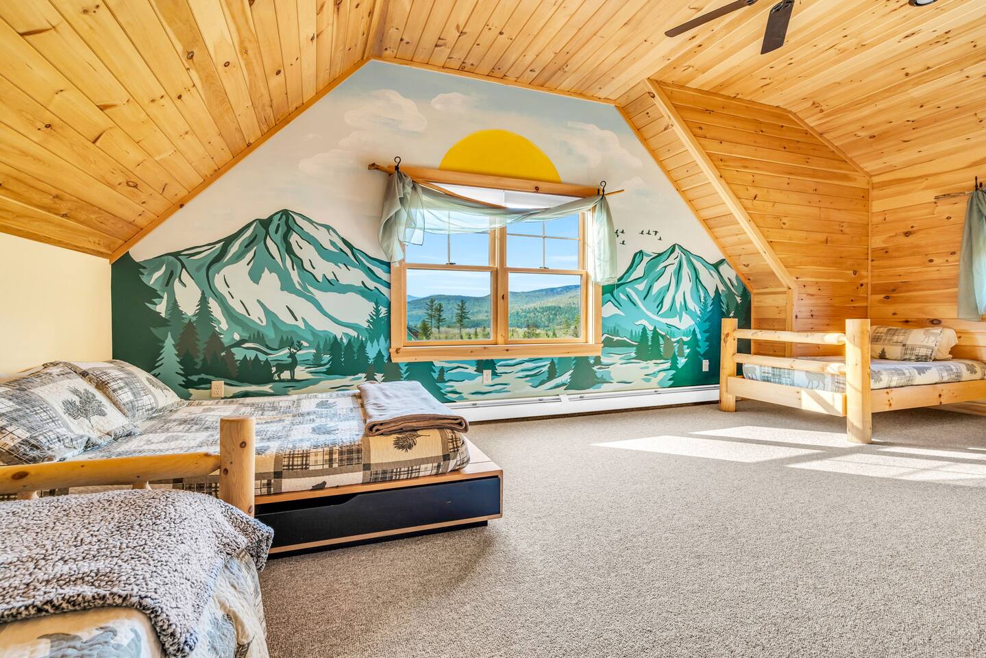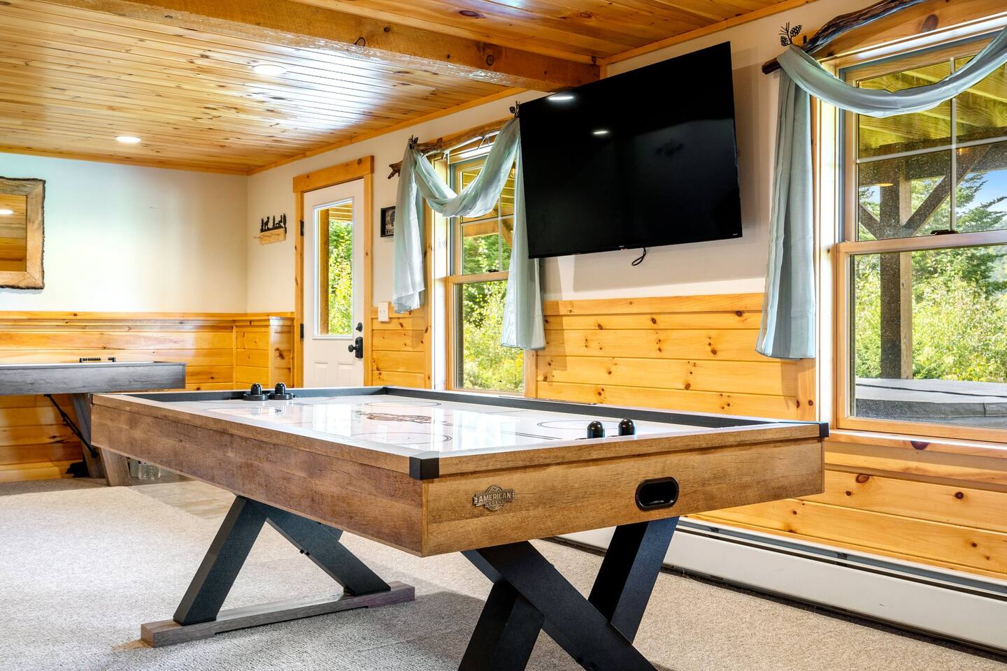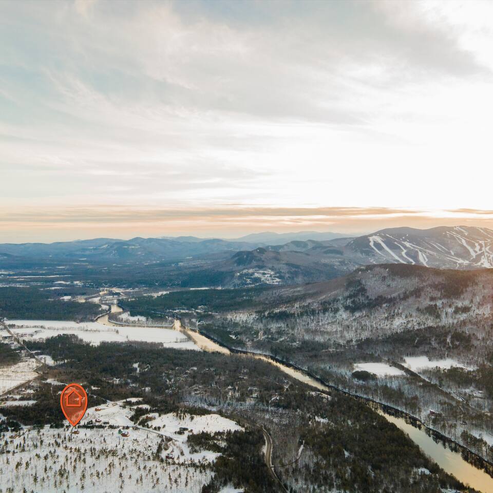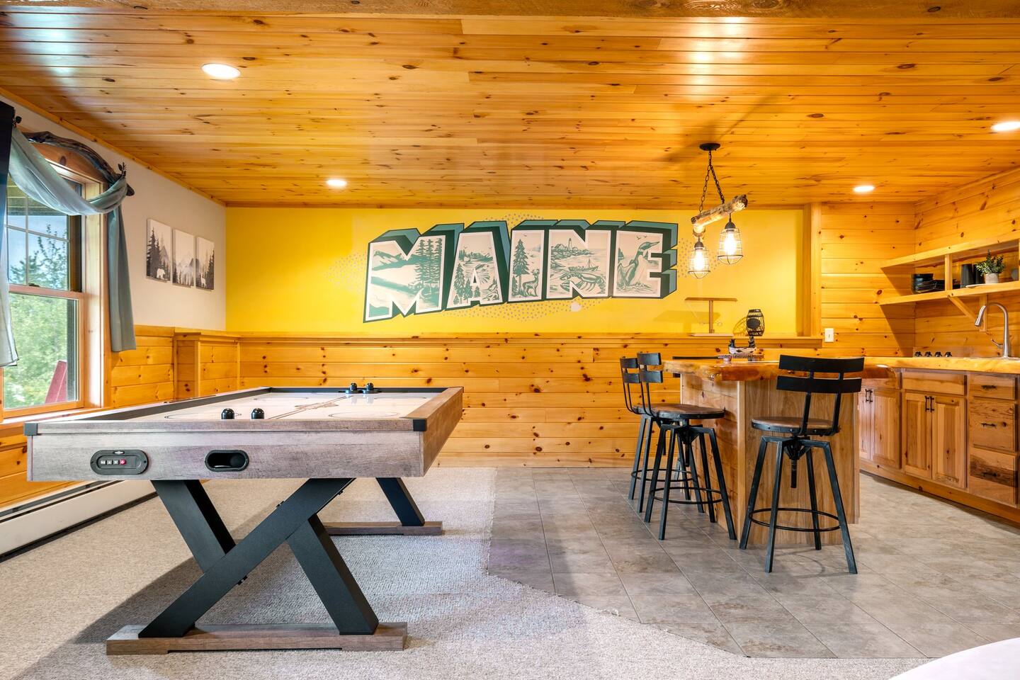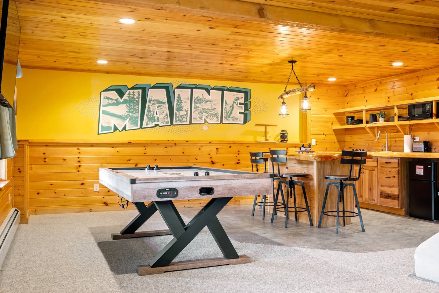 Mountain Views, Hot Tub & Game Room—15 Minutes to Sunday River This three-story Bethel cabin blends rustic Maine charm with modern comfort and unbeatable Western Maine access. Wake up to sweeping views of Sunday River and the Mahoosuc Mountains, soak in your private hot tub after skiing or hiking, and gather in the game room with a full bar and second kitchen. Spend your days on the slopes or trails, then come home to a gas fireplace, plush leather seating, and the kind of mountain retreat where everyone actually relaxes. WHAT MAKES THIS HOME SPECIAL ✔ Stunning Sunday River and Mahoosuc Mountain views ✔ Game room with air hockey, shuffleboard & full bar with second kitchen ✔ Private hot tub and fire pit with mountain backdrop ✔ 15 minutes to Sunday River, 5 minutes to Carter's Cross Country Ski Center ✔ 4 bedrooms sleep up to 12 with flexible bunk layouts ✔ Dog-friendly + whole-house generator ✔ Whole-house generator THE SPACE The spacious living area is designed for gathering and making memories. Sink into plush leather seating around the gas fireplace, stream your favorites on the 65" Smart TV, and let the large windows frame beautiful Sunday River and Mahoosuc Mountain views. The open layout connects kitchen, dining, and living spaces so no one's left out—whether you're cooking breakfast, dealing cards at the dining table, or just relaxing after a day outside. The fully stocked gourmet kitchen handles everything with modern appliances, ample counter space, and all the cookware you need. The dining table is perfect for home-cooked meals or takeout from Bethel's nearby favorites. The game room is a game-changer—air hockey, shuffleboard, a full bar with a second kitchen, and a large Smart TV for movies, sports, or rainy-day entertainment. This space works for kids, teens, and adults alike—everyone finds their happy place here. Outside, your private hot tub overlooks stunning mountain views—the perfect spot for après-ski soaks or post-hike recovery. Gather around the fire pit for stargazing and s'mores, lounge on the large deck in Adirondack chairs with Sunday River spread out before you, fire up the BBQ grill, or challenge someone to cornhole under the cabin. Peaceful surroundings and nature all around. WHERE EVERYONE SLEEPS Master Bedroom: Queen bed with en-suite bath Bedroom 2: Queen bed with twin trundle Bedroom 3: Large bunk room with twin bunks, 2 additional twin beds + full bed (sleeps 6) Bedroom 4: Full-over-twin bunk bed All bedrooms are cozy and designed for rest. Bathrooms feature tub/shower combos with upgraded finishes. All linens, towels, and soaps provided. GOOD TO KNOW ✔ Parking for up to 6 vehicles on private road ✔ Whole-house generator for uninterrupted stays ✔ Washer and dryer in-unit ✔ Central A/C and fast fiber Wi-Fi ✔ High chair available ✔ 15 minutes to Sunday River and Mt. Abram Ski & Bike Park ✔ 5 minutes to Carter's Cross Country Ski Center ✔ 10 minutes to downtown Bethel for dining, shopping & local charm ✔ 30 minutes to Frenchman's Hole for scenic summer swims BOOK YOUR ESCAPE This is the kind of mountain cabin where ski trips, fall foliage weekends, and summer getaways all work perfectly—because the views never quit, the game room keeps everyone entertained, and the hot tub is always waiting. If you want Sunday River access, rustic charm, and modern comfort, this is it. Availability fills fast—check your dates now. Doug & Rose Waves & Wilderness