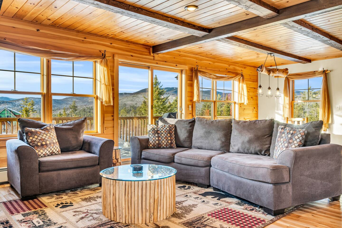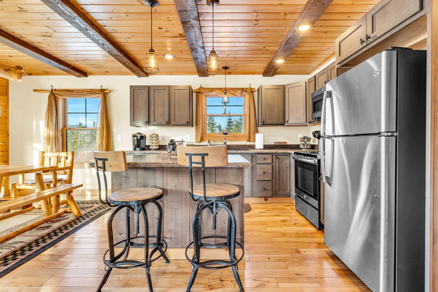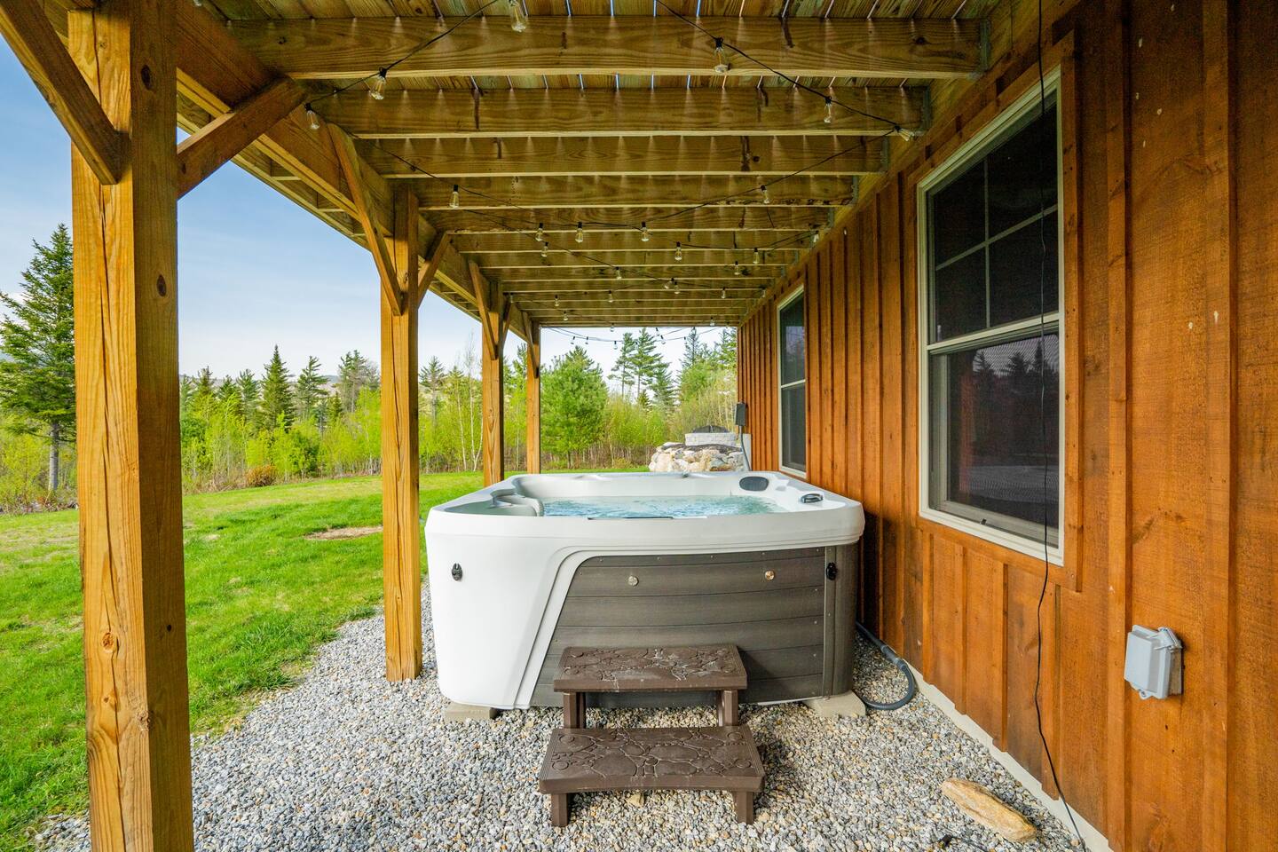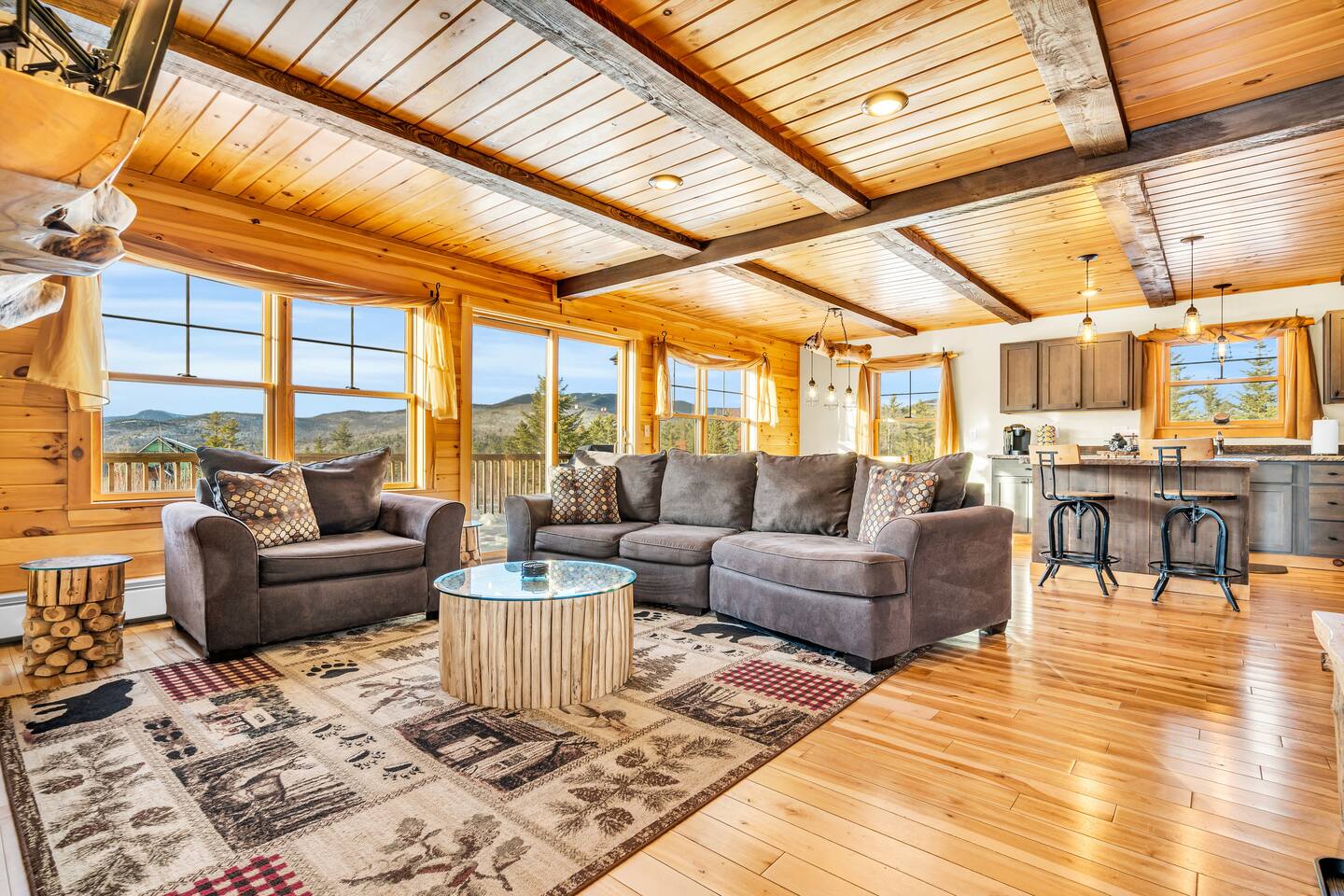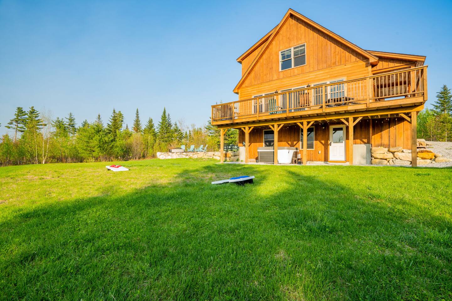 Mountain Views, Hot Tub & Game Room—15 Minutes to Sunday River This three-story Bethel cabin blends rustic Maine charm with modern comfort and unbeatable Western Maine access. Wake up to sweeping views of Sunday River and the Mahoosuc Mountains, soak in your private hot tub after skiing or hiking, and gather in the game room with a full bar and second kitchen. Spend your days on the slopes or trails, then come home to a gas fireplace, plush leather seating, and the kind of mountain retreat where everyone actually relaxes. WHAT MAKES THIS HOME SPECIAL ✔ Stunning Sunday River and Mahoosuc Mountain views ✔ Game room with air hockey, shuffleboard & full bar with second kitchen ✔ Private hot tub and fire pit with mountain backdrop ✔ 15 minutes to Sunday River, 5 minutes to Carter's Cross Country Ski Center ✔ 4 bedrooms sleep up to 12 with flexible bunk layouts ✔ Dog-friendly + whole-house generator ✔ Whole-house generator THE SPACE The spacious living area is designed for gathering and making memories. Sink into plush leather seating around the gas fireplace, stream your favorites on the 65" Smart TV, and let the large windows frame beautiful Sunday River and Mahoosuc Mountain views. The open layout connects kitchen, dining, and living spaces so no one's left out—whether you're cooking breakfast, dealing cards at the dining table, or just relaxing after a day outside. The fully stocked gourmet kitchen handles everything with modern appliances, ample counter space, and all the cookware you need. The dining table is perfect for home-cooked meals or takeout from Bethel's nearby favorites. The game room is a game-changer—air hockey, shuffleboard, a full bar with a second kitchen, and a large Smart TV for movies, sports, or rainy-day entertainment. This space works for kids, teens, and adults alike—everyone finds their happy place here. Outside, your private hot tub overlooks stunning mountain views—the perfect spot for après-ski soaks or post-hike recovery. Gather around the fire pit for stargazing and s'mores, lounge on the large deck in Adirondack chairs with Sunday River spread out before you, fire up the BBQ grill, or challenge someone to cornhole under the cabin. Peaceful surroundings and nature all around. WHERE EVERYONE SLEEPS Master Bedroom: Queen bed with en-suite bath Bedroom 2: Queen bed with twin trundle Bedroom 3: Large bunk room with twin bunks, 2 additional twin beds + full bed (sleeps 6) Bedroom 4: Full-over-twin bunk bed All bedrooms are cozy and designed for rest. Bathrooms feature tub/shower combos with upgraded finishes. All linens, towels, and soaps provided. GOOD TO KNOW ✔ Parking for up to 6 vehicles on private road ✔ Whole-house generator for uninterrupted stays ✔ Washer and dryer in-unit ✔ Central A/C and fast fiber Wi-Fi ✔ High chair available ✔ 15 minutes to Sunday River and Mt. Abram Ski & Bike Park ✔ 5 minutes to Carter's Cross Country Ski Center ✔ 10 minutes to downtown Bethel for dining, shopping & local charm ✔ 30 minutes to Frenchman's Hole for scenic summer swims BOOK YOUR ESCAPE This is the kind of mountain cabin where ski trips, fall foliage weekends, and summer getaways all work perfectly—because the views never quit, the game room keeps everyone entertained, and the hot tub is always waiting. If you want Sunday River access, rustic charm, and modern comfort, this is it. Availability fills fast—check your dates now. Doug & Rose Waves & Wilderness