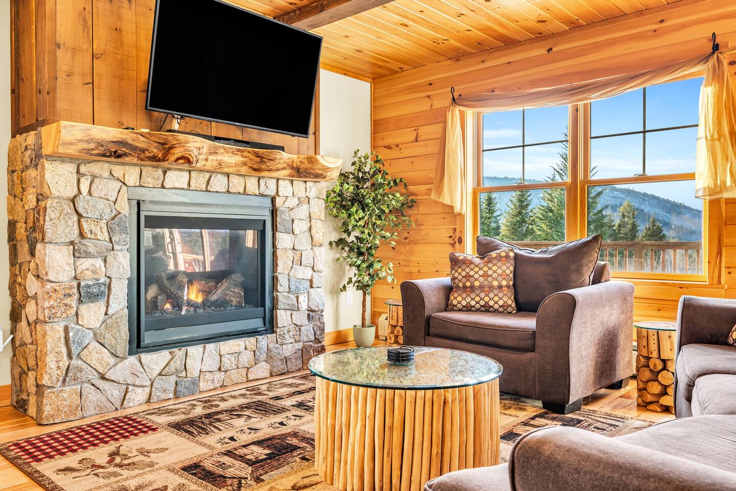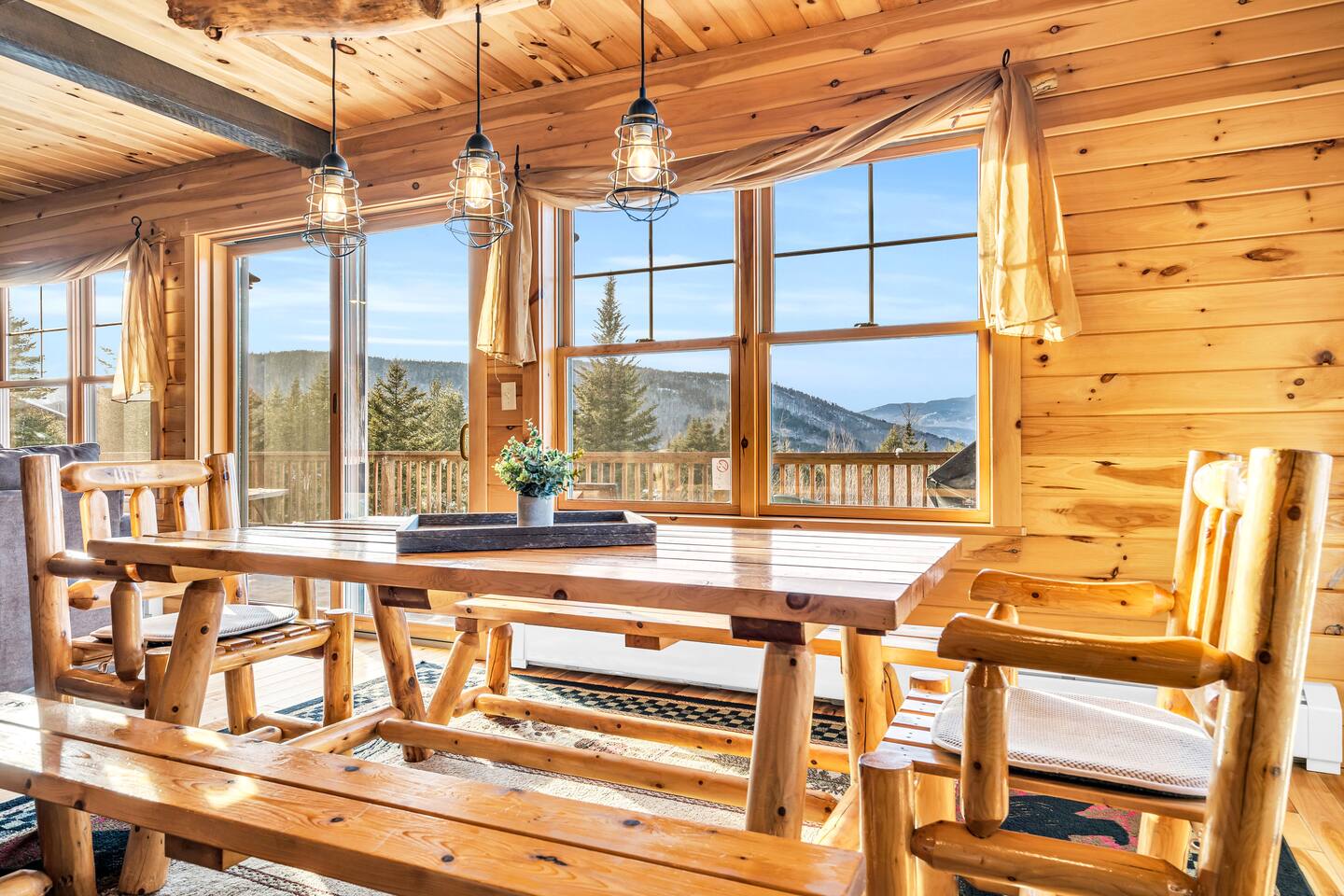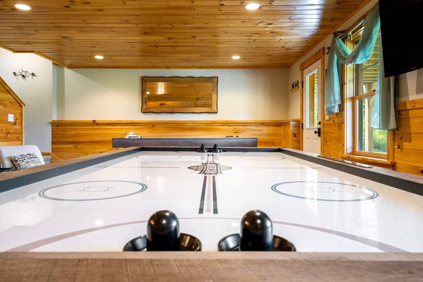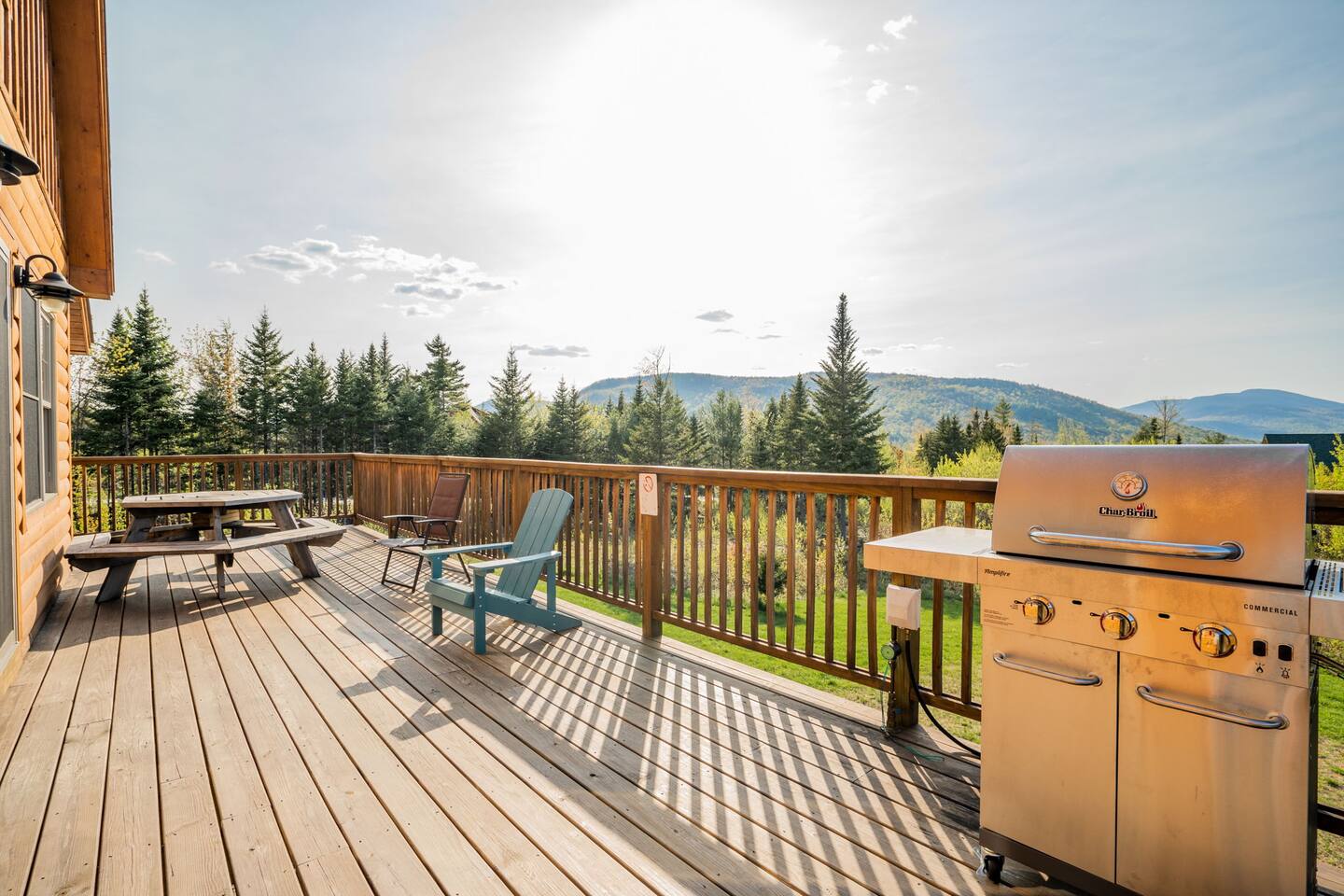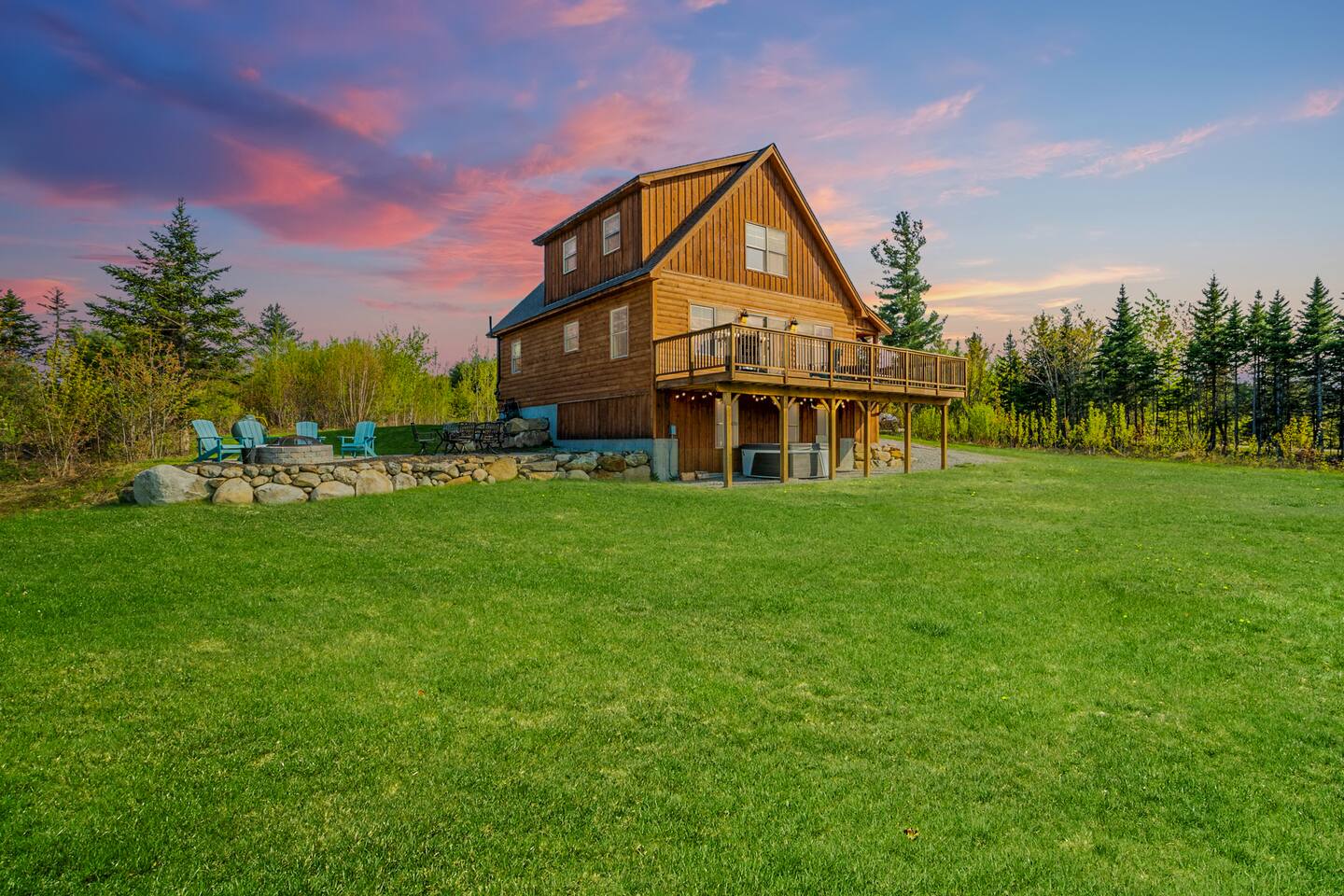 Mountain Views, Hot Tub & Game Room—15 Minutes to Sunday River This three-story Bethel cabin blends rustic Maine charm with modern comfort and unbeatable Western Maine access. Wake up to sweeping views of Sunday River and the Mahoosuc Mountains, soak in your private hot tub after skiing or hiking, and gather in the game room with a full bar and second kitchen. Spend your days on the slopes or trails, then come home to a gas fireplace, plush leather seating, and the kind of mountain retreat where everyone actually relaxes. WHAT MAKES THIS HOME SPECIAL ✔ Stunning Sunday River and Mahoosuc Mountain views ✔ Game room with air hockey, shuffleboard & full bar with second kitchen ✔ Private hot tub and fire pit with mountain backdrop ✔ 15 minutes to Sunday River, 5 minutes to Carter's Cross Country Ski Center ✔ 4 bedrooms sleep up to 12 with flexible bunk layouts ✔ Dog-friendly + whole-house generator ✔ Whole-house generator THE SPACE The spacious living area is designed for gathering and making memories. Sink into plush leather seating around the gas fireplace, stream your favorites on the 65" Smart TV, and let the large windows frame beautiful Sunday River and Mahoosuc Mountain views. The open layout connects kitchen, dining, and living spaces so no one's left out—whether you're cooking breakfast, dealing cards at the dining table, or just relaxing after a day outside. The fully stocked gourmet kitchen handles everything with modern appliances, ample counter space, and all the cookware you need. The dining table is perfect for home-cooked meals or takeout from Bethel's nearby favorites. The game room is a game-changer—air hockey, shuffleboard, a full bar with a second kitchen, and a large Smart TV for movies, sports, or rainy-day entertainment. This space works for kids, teens, and adults alike—everyone finds their happy place here. Outside, your private hot tub overlooks stunning mountain views—the perfect spot for après-ski soaks or post-hike recovery. Gather around the fire pit for stargazing and s'mores, lounge on the large deck in Adirondack chairs with Sunday River spread out before you, fire up the BBQ grill, or challenge someone to cornhole under the cabin. Peaceful surroundings and nature all around. WHERE EVERYONE SLEEPS Master Bedroom: Queen bed with en-suite bath Bedroom 2: Queen bed with twin trundle Bedroom 3: Large bunk room with twin bunks, 2 additional twin beds + full bed (sleeps 6) Bedroom 4: Full-over-twin bunk bed All bedrooms are cozy and designed for rest. Bathrooms feature tub/shower combos with upgraded finishes. All linens, towels, and soaps provided. GOOD TO KNOW ✔ Parking for up to 6 vehicles on private road ✔ Whole-house generator for uninterrupted stays ✔ Washer and dryer in-unit ✔ Central A/C and fast fiber Wi-Fi ✔ High chair available ✔ 15 minutes to Sunday River and Mt. Abram Ski & Bike Park ✔ 5 minutes to Carter's Cross Country Ski Center ✔ 10 minutes to downtown Bethel for dining, shopping & local charm ✔ 30 minutes to Frenchman's Hole for scenic summer swims BOOK YOUR ESCAPE This is the kind of mountain cabin where ski trips, fall foliage weekends, and summer getaways all work perfectly—because the views never quit, the game room keeps everyone entertained, and the hot tub is always waiting. If you want Sunday River access, rustic charm, and modern comfort, this is it. Availability fills fast—check your dates now. Doug & Rose Waves & Wilderness