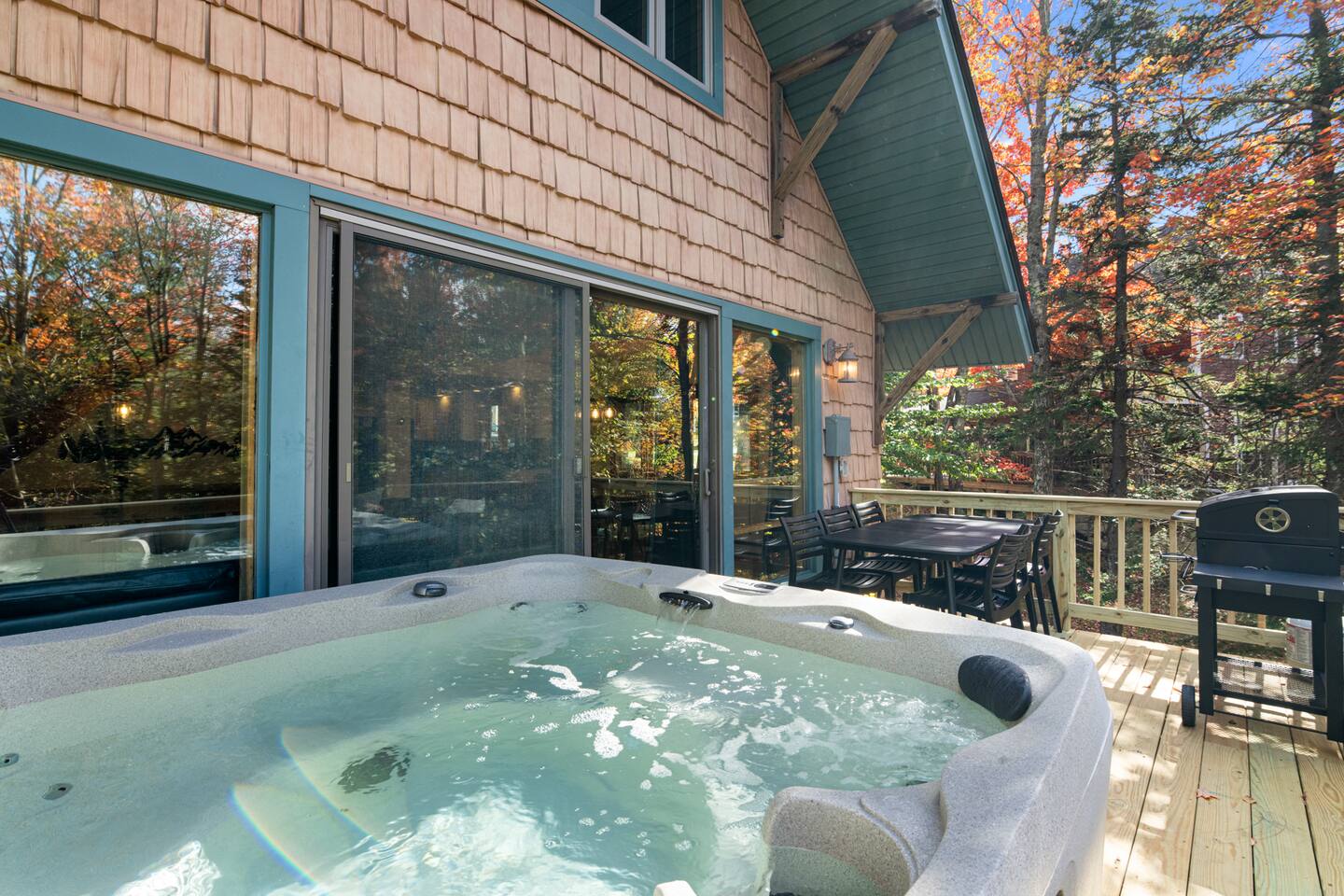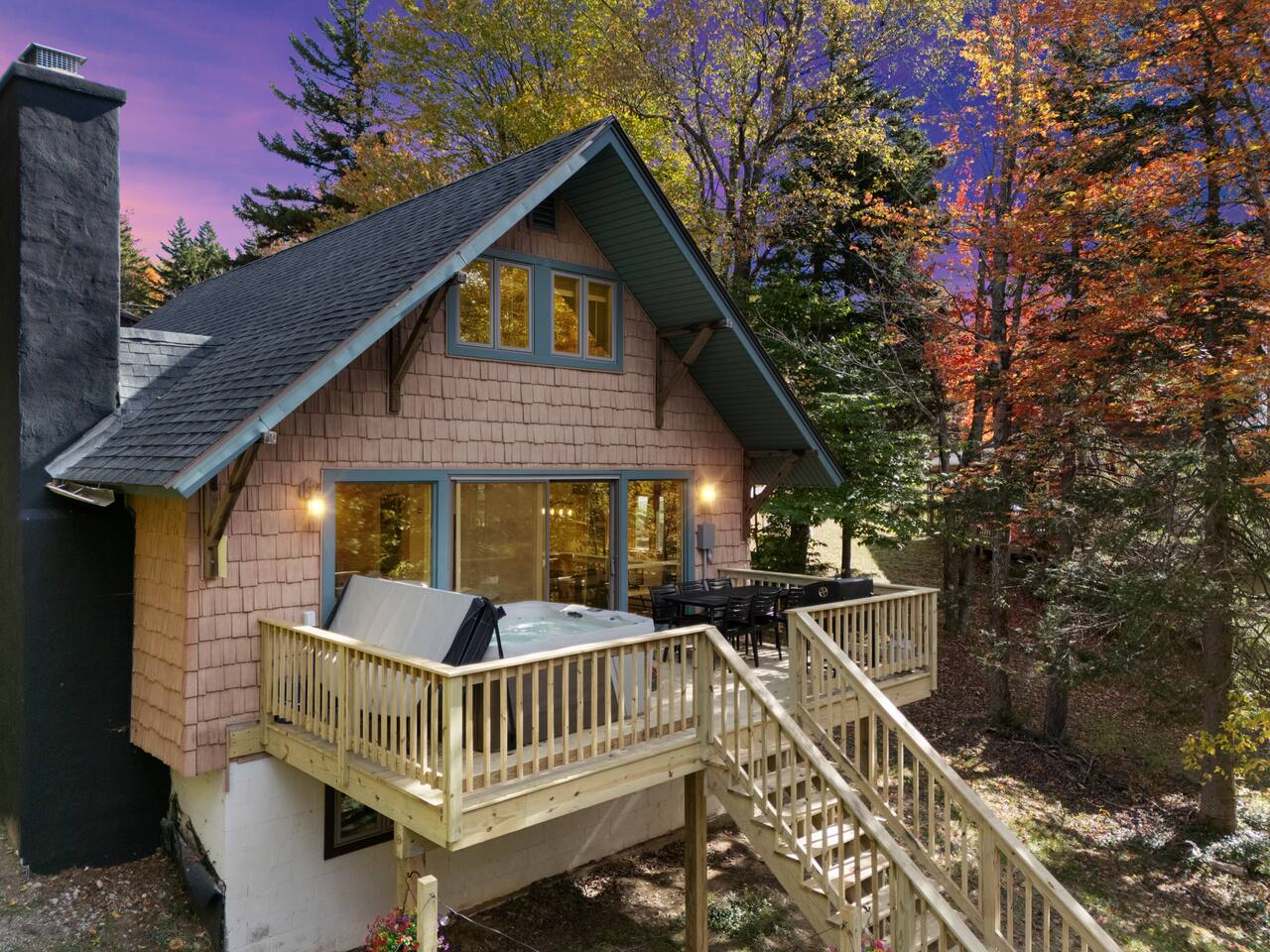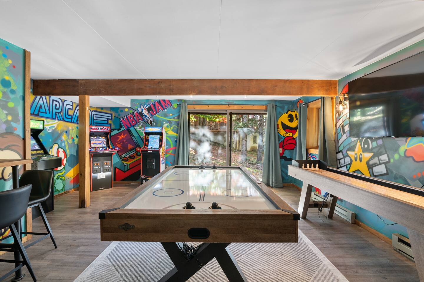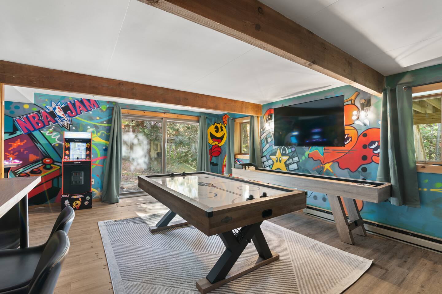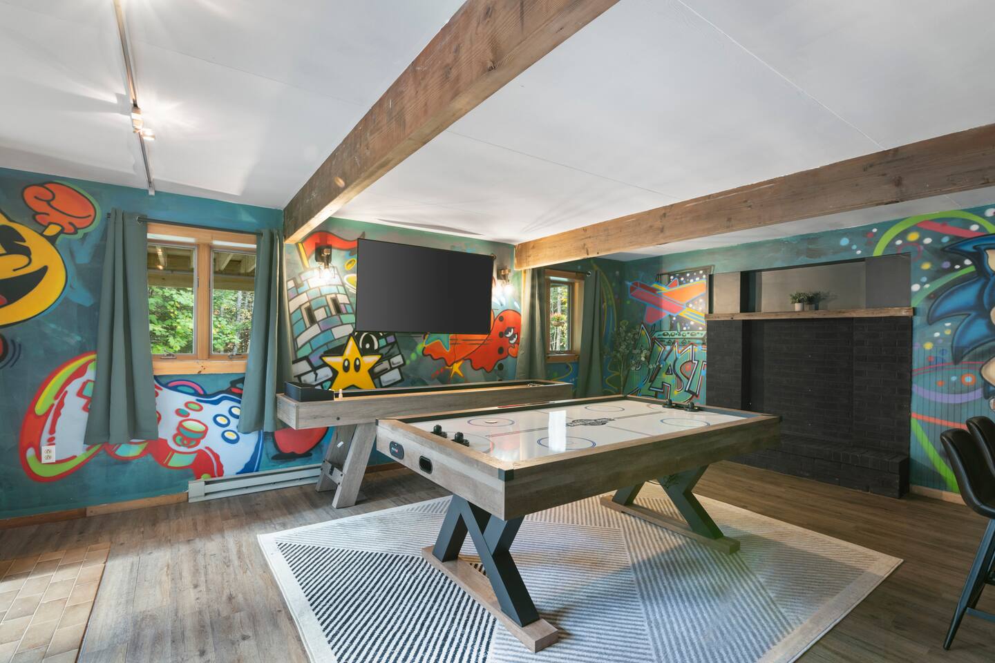 Vermont Chalet with Theater Room, Game Room & Hot Tub Near Mount Snow This 3-story Vermont chalet is loaded for mountain getaways—private theater with reclining seats and candy bar, top-tier game room with arcade classics and custom murals, hot tub under the stars, and a prime location near Mount Snow and Southern Vermont's best outdoor adventures. Spend your days skiing, hiking, or exploring everything Vermont has to offer, then come home to knotty pine charm, modern comfort, and the kind of entertainment that keeps everyone happy. WHAT MAKES THIS HOME SPECIAL ✔ Private theater room with leather recliners, surround sound & candy bar ✔ Game room with air hockey, shuffleboard, arcade games & 75" Smart TV ✔ Hot tub and fire pit for après-ski relaxation ✔ Minutes to Mount Snow and Southern Vermont trails ✔ 4 bedrooms sleep up to 12 with flexible layouts ✔ Easy year-round access—no steep mountain roads THE SPACE The heart of the chalet is the open living space where everyone naturally gathers. Sink into plush leather seating around the warm electric fireplace, stream your favorites on the Smart TV, and let the natural light pour in through large windows and glass doors. The open layout connects kitchen, dining, and living areas so no one's left out—whether you're cooking breakfast, dealing cards at the dining table, or just relaxing after a day on the mountain. The fully equipped kitchen handles everything from hearty ski-day breakfasts to cozy dinners with modern appliances, generous counter space, and all the cookware you need. The dining area seats your entire group for home-cooked meals, takeout from nearby spots, or late-night conversations that stretch longer than planned. Your private theater room brings the cinema experience home with leather reclining seats, surround sound, and a popcorn and candy bar. Perfect for movie marathons, game days, or giving the kids something to do while adults finish their wine. The game room is where the real fun happens—air hockey, shuffleboard, three arcade games, a 75" Smart TV, and custom murals by a local artist. Rainy day? Restless kids? Competitive adults? Everyone's covered. Outside, soak in the hot tub after a long ski day, roast s'mores around the fire pit under Vermont stars, or fire up the grill on the deck with peaceful wilderness views all around. WHERE EVERYONE SLEEPS Bedroom 1 (Primary): King bed with en-suite bathroom and soaker tub Bedroom 2: Four built-in full beds—great for kids or groups Bedroom 3: Two king beds—perfect for couples or friends sharing Bedroom 4 (Lower Level): Queen bed with twin trundle Three full bathrooms. Every bedroom has a Smart TV. All linens, towels, and soaps are provided. GOOD TO KNOW ✔ Parking for up to 4 vehicles ✔ Easy year-round access—no steep roads ✔ Washer and dryer in-unit ✔ Central A/C and heat ✔ Pack 'n Play and high chair provided ✔ Deck with grill and outdoor dining ✔ Minutes to Mount Snow skiing, hiking & Southern Vermont adventures ✔ Bring your favorite towel for the hot tub BOOK YOUR ESCAPE This is the kind of Vermont chalet where ski trips, fall foliage weekends, and summer getaways all work perfectly—because there's as much to do inside as there is outside. If you want mountain access, modern comfort, and built-in entertainment for the whole crew, this is it. Availability fills fast—check your dates now. Doug & Rose Waves & Wilderness