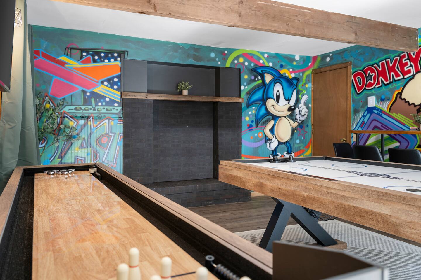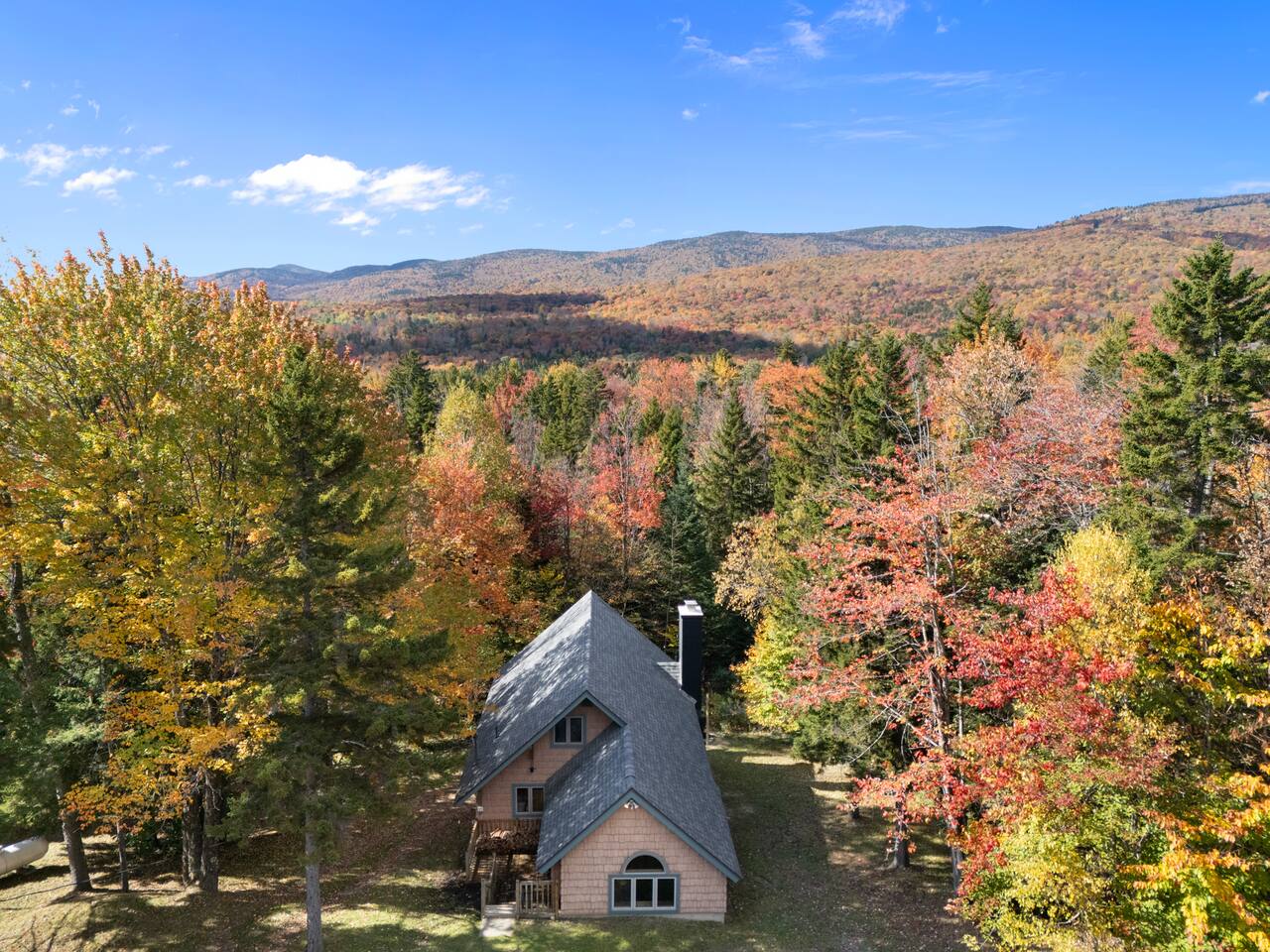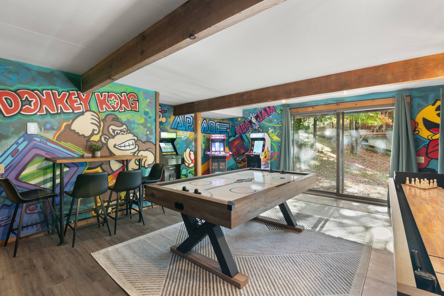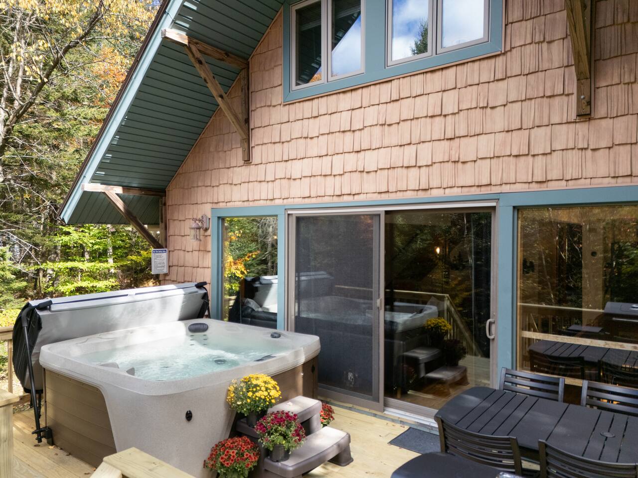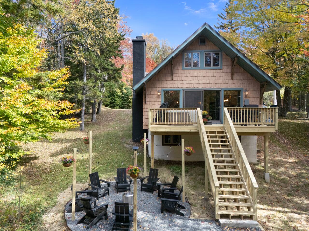 Vermont Chalet with Theater Room, Game Room & Hot Tub Near Mount Snow This 3-story Vermont chalet is loaded for mountain getaways—private theater with reclining seats and candy bar, top-tier game room with arcade classics and custom murals, hot tub under the stars, and a prime location near Mount Snow and Southern Vermont's best outdoor adventures. Spend your days skiing, hiking, or exploring everything Vermont has to offer, then come home to knotty pine charm, modern comfort, and the kind of entertainment that keeps everyone happy. WHAT MAKES THIS HOME SPECIAL ✔ Private theater room with leather recliners, surround sound & candy bar ✔ Game room with air hockey, shuffleboard, arcade games & 75" Smart TV ✔ Hot tub and fire pit for après-ski relaxation ✔ Minutes to Mount Snow and Southern Vermont trails ✔ 4 bedrooms sleep up to 12 with flexible layouts ✔ Easy year-round access—no steep mountain roads THE SPACE The heart of the chalet is the open living space where everyone naturally gathers. Sink into plush leather seating around the warm electric fireplace, stream your favorites on the Smart TV, and let the natural light pour in through large windows and glass doors. The open layout connects kitchen, dining, and living areas so no one's left out—whether you're cooking breakfast, dealing cards at the dining table, or just relaxing after a day on the mountain. The fully equipped kitchen handles everything from hearty ski-day breakfasts to cozy dinners with modern appliances, generous counter space, and all the cookware you need. The dining area seats your entire group for home-cooked meals, takeout from nearby spots, or late-night conversations that stretch longer than planned. Your private theater room brings the cinema experience home with leather reclining seats, surround sound, and a popcorn and candy bar. Perfect for movie marathons, game days, or giving the kids something to do while adults finish their wine. The game room is where the real fun happens—air hockey, shuffleboard, three arcade games, a 75" Smart TV, and custom murals by a local artist. Rainy day? Restless kids? Competitive adults? Everyone's covered. Outside, soak in the hot tub after a long ski day, roast s'mores around the fire pit under Vermont stars, or fire up the grill on the deck with peaceful wilderness views all around. WHERE EVERYONE SLEEPS Bedroom 1 (Primary): King bed with en-suite bathroom and soaker tub Bedroom 2: Four built-in full beds—great for kids or groups Bedroom 3: Two king beds—perfect for couples or friends sharing Bedroom 4 (Lower Level): Queen bed with twin trundle Three full bathrooms. Every bedroom has a Smart TV. All linens, towels, and soaps are provided. GOOD TO KNOW ✔ Parking for up to 4 vehicles ✔ Easy year-round access—no steep roads ✔ Washer and dryer in-unit ✔ Central A/C and heat ✔ Pack 'n Play and high chair provided ✔ Deck with grill and outdoor dining ✔ Minutes to Mount Snow skiing, hiking & Southern Vermont adventures ✔ Bring your favorite towel for the hot tub BOOK YOUR ESCAPE This is the kind of Vermont chalet where ski trips, fall foliage weekends, and summer getaways all work perfectly—because there's as much to do inside as there is outside. If you want mountain access, modern comfort, and built-in entertainment for the whole crew, this is it. Availability fills fast—check your dates now. Doug & Rose Waves & Wilderness