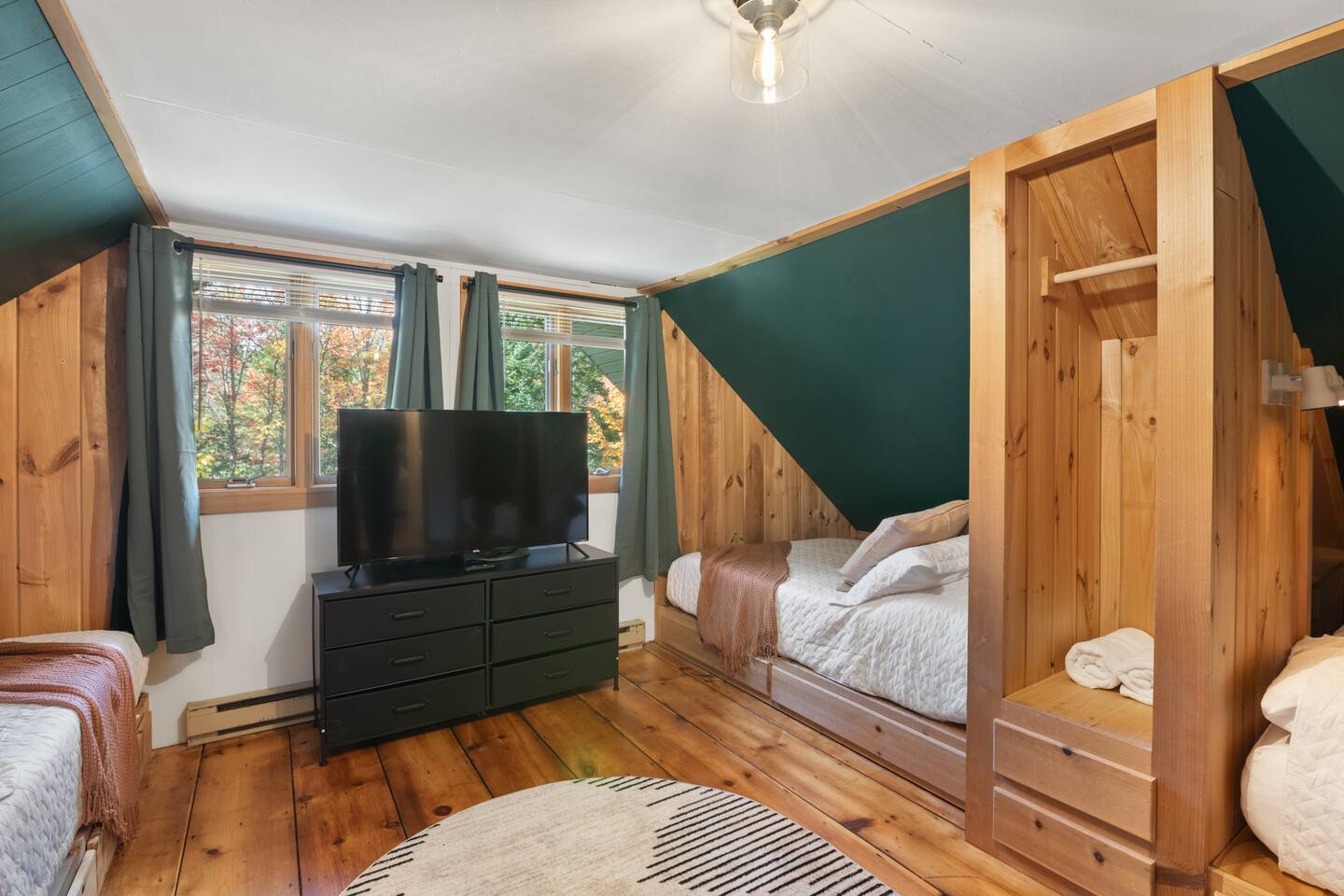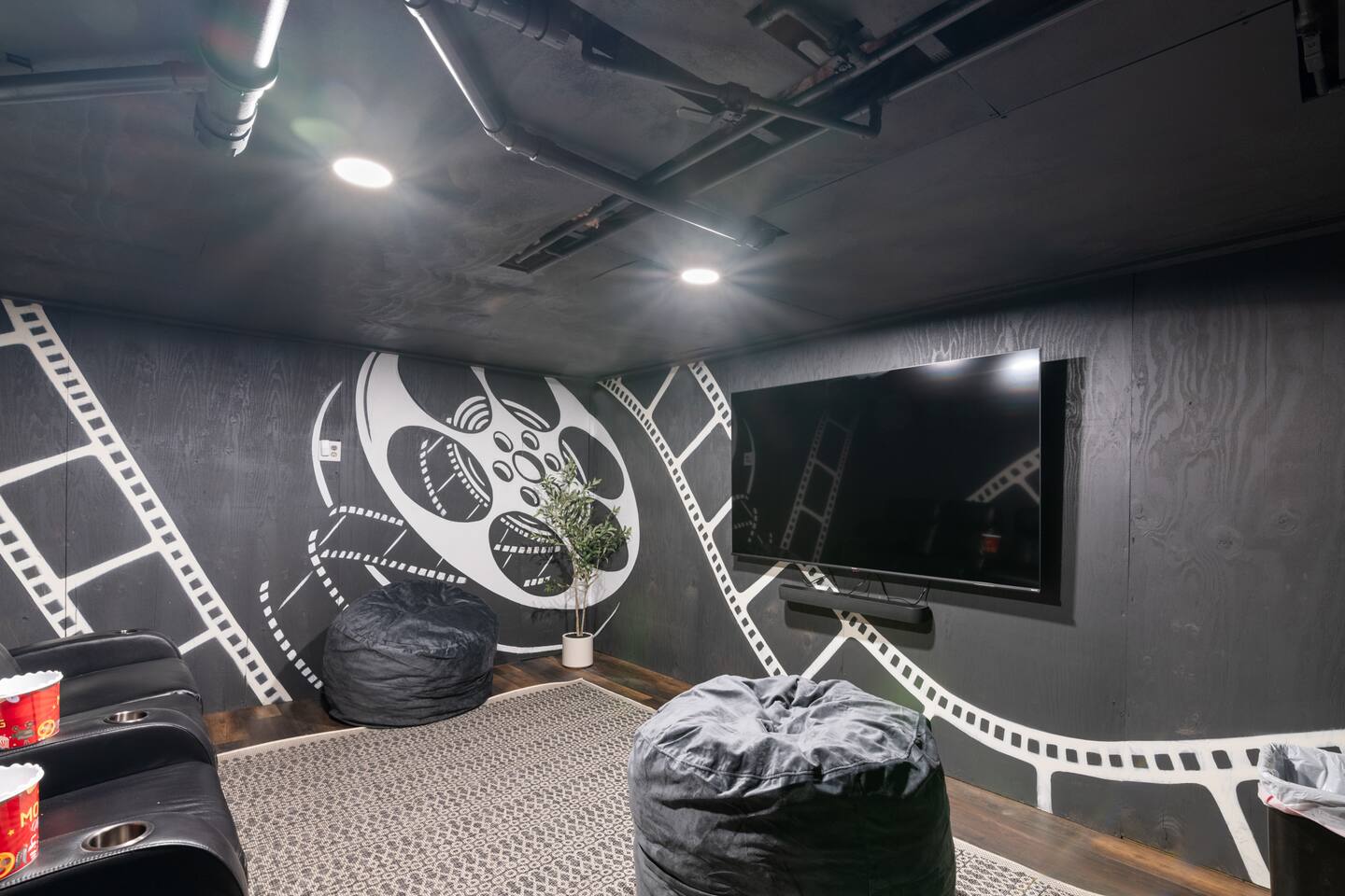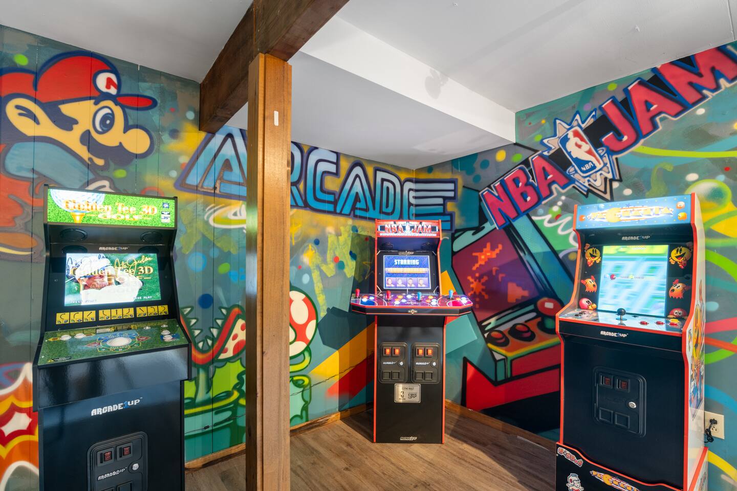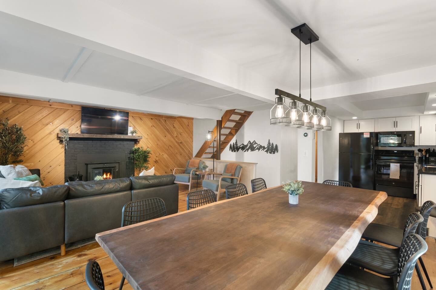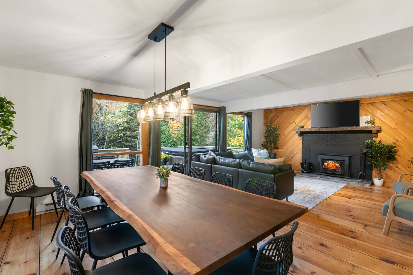 Vermont Chalet with Theater Room, Game Room & Hot Tub Near Mount Snow This 3-story Vermont chalet is loaded for mountain getaways—private theater with reclining seats and candy bar, top-tier game room with arcade classics and custom murals, hot tub under the stars, and a prime location near Mount Snow and Southern Vermont's best outdoor adventures. Spend your days skiing, hiking, or exploring everything Vermont has to offer, then come home to knotty pine charm, modern comfort, and the kind of entertainment that keeps everyone happy. WHAT MAKES THIS HOME SPECIAL ✔ Private theater room with leather recliners, surround sound & candy bar ✔ Game room with air hockey, shuffleboard, arcade games & 75" Smart TV ✔ Hot tub and fire pit for après-ski relaxation ✔ Minutes to Mount Snow and Southern Vermont trails ✔ 4 bedrooms sleep up to 12 with flexible layouts ✔ Easy year-round access—no steep mountain roads THE SPACE The heart of the chalet is the open living space where everyone naturally gathers. Sink into plush leather seating around the warm electric fireplace, stream your favorites on the Smart TV, and let the natural light pour in through large windows and glass doors. The open layout connects kitchen, dining, and living areas so no one's left out—whether you're cooking breakfast, dealing cards at the dining table, or just relaxing after a day on the mountain. The fully equipped kitchen handles everything from hearty ski-day breakfasts to cozy dinners with modern appliances, generous counter space, and all the cookware you need. The dining area seats your entire group for home-cooked meals, takeout from nearby spots, or late-night conversations that stretch longer than planned. Your private theater room brings the cinema experience home with leather reclining seats, surround sound, and a popcorn and candy bar. Perfect for movie marathons, game days, or giving the kids something to do while adults finish their wine. The game room is where the real fun happens—air hockey, shuffleboard, three arcade games, a 75" Smart TV, and custom murals by a local artist. Rainy day? Restless kids? Competitive adults? Everyone's covered. Outside, soak in the hot tub after a long ski day, roast s'mores around the fire pit under Vermont stars, or fire up the grill on the deck with peaceful wilderness views all around. WHERE EVERYONE SLEEPS Bedroom 1 (Primary): King bed with en-suite bathroom and soaker tub Bedroom 2: Four built-in full beds—great for kids or groups Bedroom 3: Two king beds—perfect for couples or friends sharing Bedroom 4 (Lower Level): Queen bed with twin trundle Three full bathrooms. Every bedroom has a Smart TV. All linens, towels, and soaps are provided. GOOD TO KNOW ✔ Parking for up to 4 vehicles ✔ Easy year-round access—no steep roads ✔ Washer and dryer in-unit ✔ Central A/C and heat ✔ Pack 'n Play and high chair provided ✔ Deck with grill and outdoor dining ✔ Minutes to Mount Snow skiing, hiking & Southern Vermont adventures ✔ Bring your favorite towel for the hot tub BOOK YOUR ESCAPE This is the kind of Vermont chalet where ski trips, fall foliage weekends, and summer getaways all work perfectly—because there's as much to do inside as there is outside. If you want mountain access, modern comfort, and built-in entertainment for the whole crew, this is it. Availability fills fast—check your dates now. Doug & Rose Waves & Wilderness