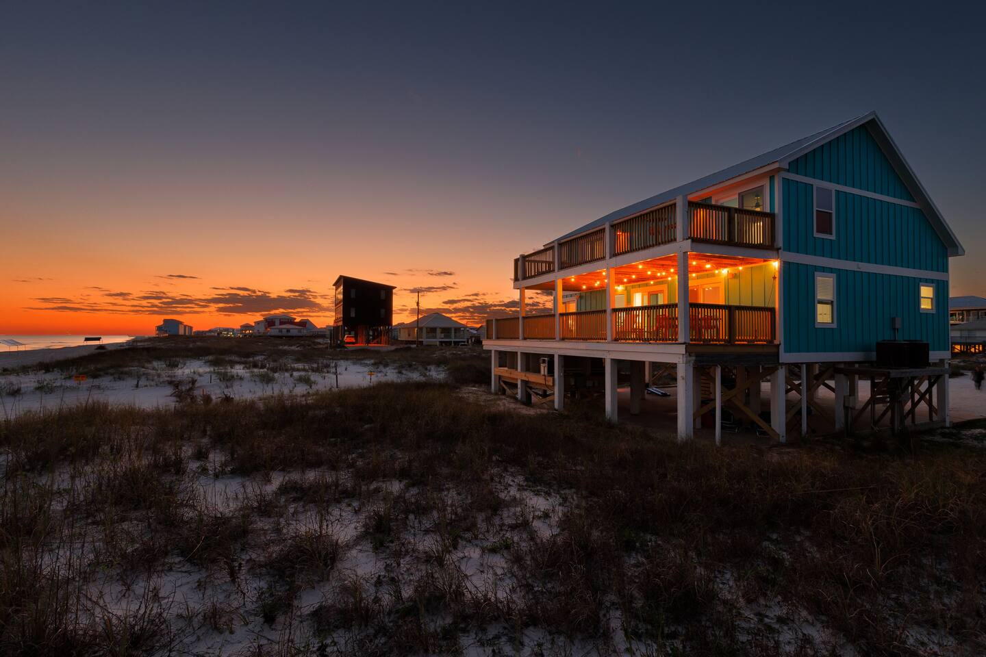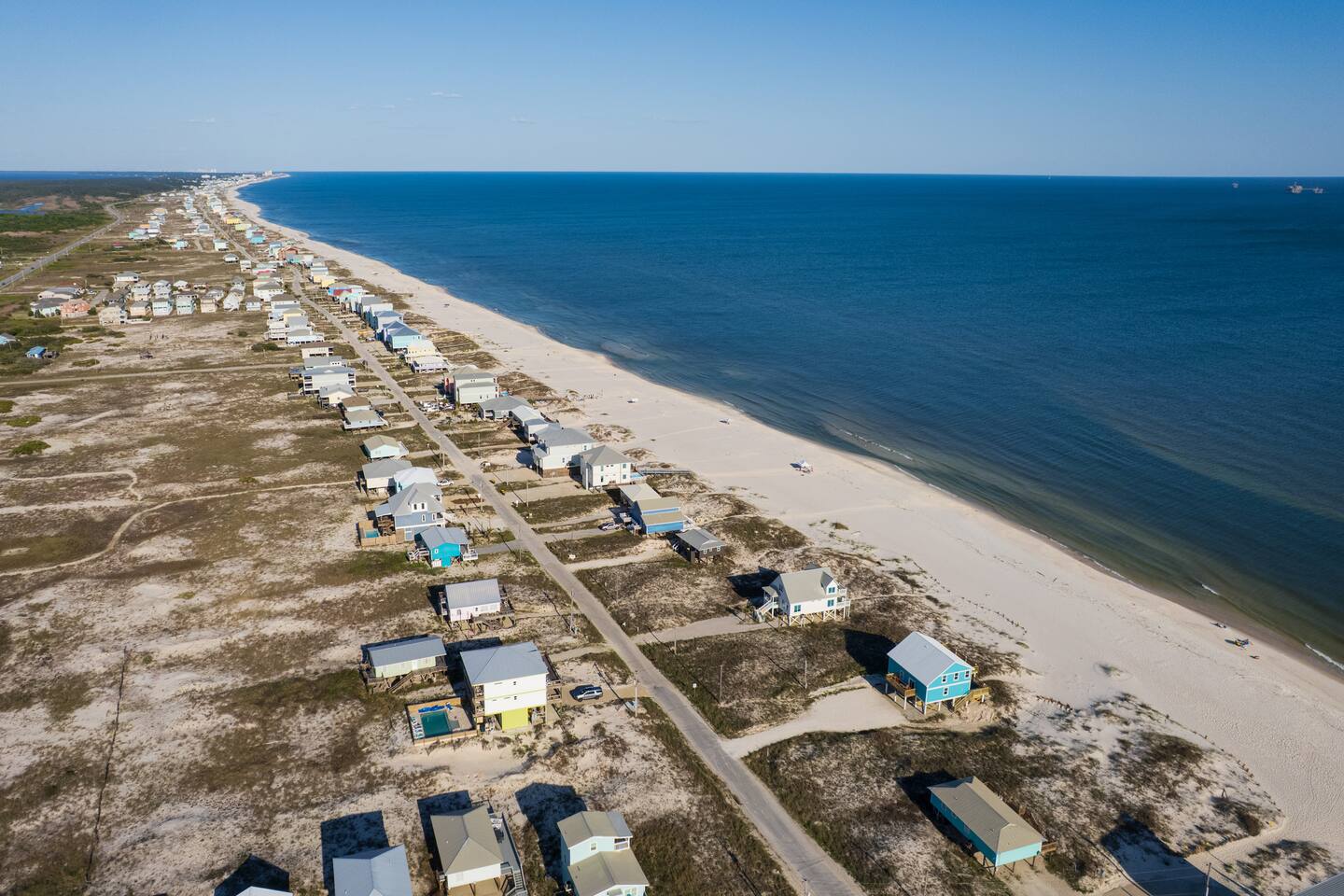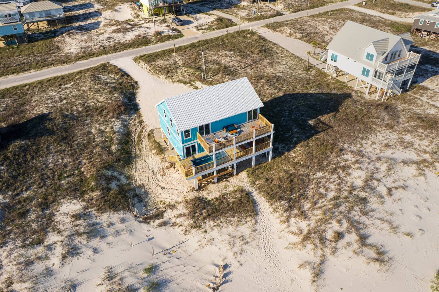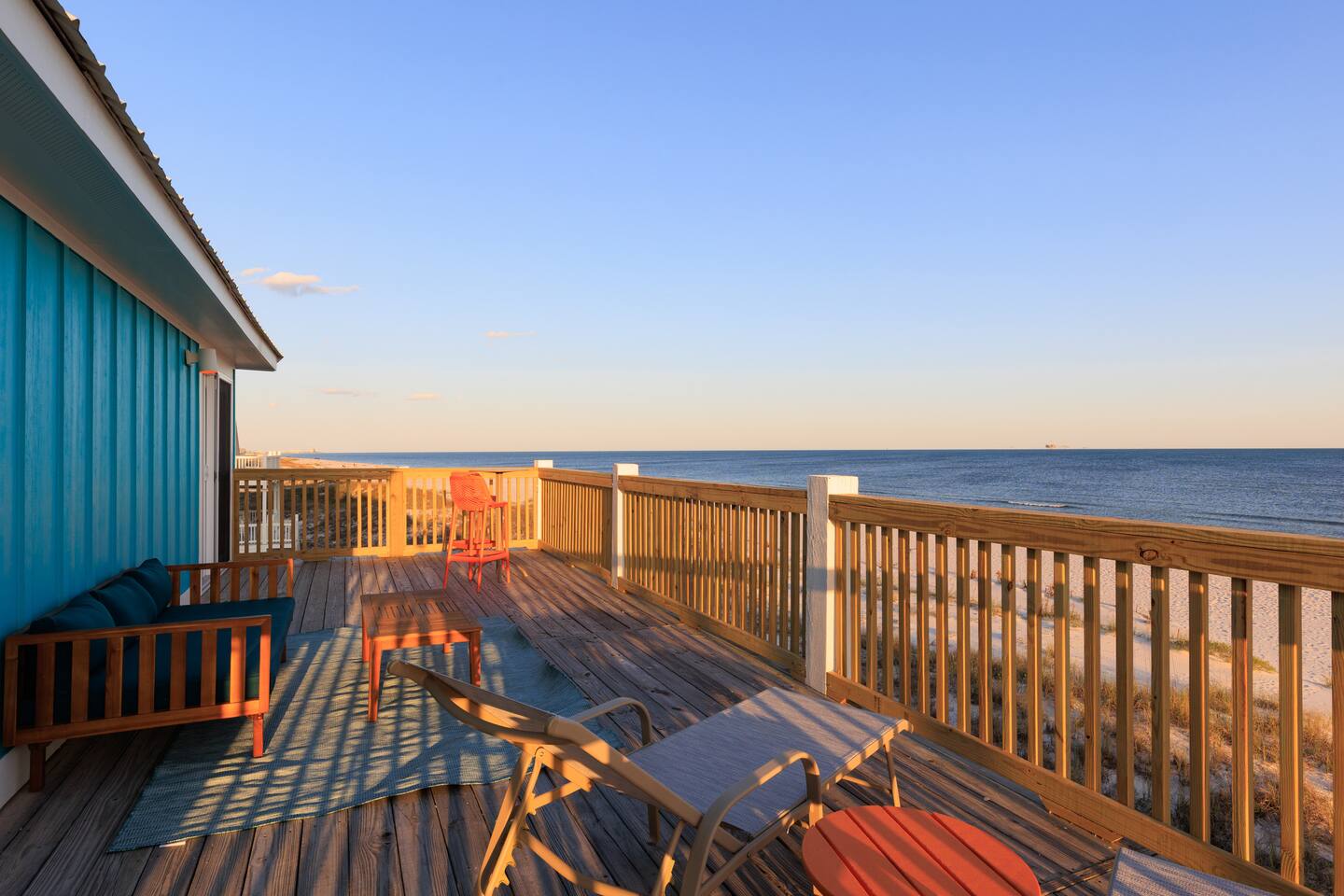 Gulf-Front Luxury with Private Pool & Sunset Views from Every Room Fully renovated in 2025, this stunning beachfront home in Gulf Shores offers the ultimate coastal escape for families, friends, and your four-legged crew. Wake up to endless Gulf views from every room, step directly from your deck onto the sand, and spend your days floating between the beach and your private heated pool. This is true Gulf-front living—where the sound of waves is your constant companion and sunset swims are just part of the daily routine. WHAT MAKES THIS HOME SPECIAL ✔ Direct beachfront—step from your deck straight onto the sand ✔ Unobstructed Gulf views from every single room ✔ Private heated pool on the deck for post-beach cooldowns ✔ Fully renovated in 2025 with coastal-chic design ✔ Dog-friendly—bring the whole pack THE SPACE Your two expansive Gulf-facing decks are where you'll spend most of your time. Start mornings with coffee and front-row sunrise views, gather for alfresco dinners at the outdoor table, or pull up a seat at the high-top pub seating with a cold drink as the sky turns pink and gold. When you need to cool off, dive into your private pool without ever leaving the view. And when the beach calls? You're already there—just step off the deck onto the sand. Inside, the fully stocked kitchen makes meal prep effortless, whether you're blending morning smoothies or prepping a seafood feast. The dining table has room for everyone, and the living room invites you to sink into the cognac leather sofa surrounded by boho-chic accents. Stream a movie on the 65" Smart TV or leave the windows open and let the sound of the waves be your entertainment. Rinse off the salt and sand in the outdoor shower, then decide whether your next move is the pool, the deck, or straight back to the beach. WHERE EVERYONE SLEEPS Main Floor: 2 Gulf-front king suites with deck access, 50" Smart TVs Upstairs: 2 Gulf-front king suites with deck access, 50" Smart TVs Upstairs: 1 bunk room with queen-over-twin and twin-over-twin bunks—perfect for kids As of 2025, every bed and mattress is brand new. Four full bathrooms (two per floor) with spa-inspired showers, plush towels, and boho decor throughout. GOOD TO KNOW ✔ Beach chairs, toys, and wagon included ✔ Private outdoor shower ✔ Washer and dryer in-unit ✔ Central A/C for year-round comfort ✔ Fast Wi-Fi for streaming or staying connected ✔ Dining favorites 5 minutes away (Tacky Jacks, Jessie's, Sassy Bass) ✔ Downtown Gulf Shores 20 minutes down the coast ✔ Fort Morgan's quieter, family-friendly vibe with easy access to everything POOL HEATING Want to swim even when it's cooler outside? Pool heating is available for $75/day and typically maintains a comfortable 80–85°F depending on the weather. Just let us know after booking, and we'll have it ready for your arrival. BOOK YOUR ESCAPE This is the kind of place where you lose track of time—where days blur into a perfect rhythm of beach, pool, deck, repeat. Whether you're here for a family reunion, a friends' trip, or just to unplug and recharge, this Gulf-front home delivers the vacation you've been dreaming about. Availability fills fast—check your dates now. Rose & Doug Waves & Wilderness