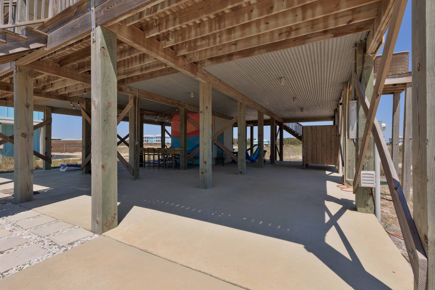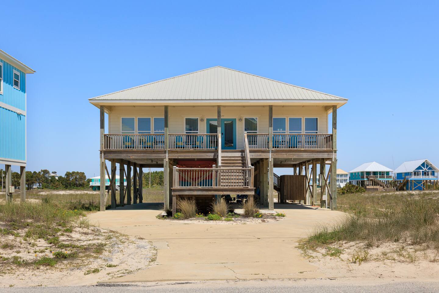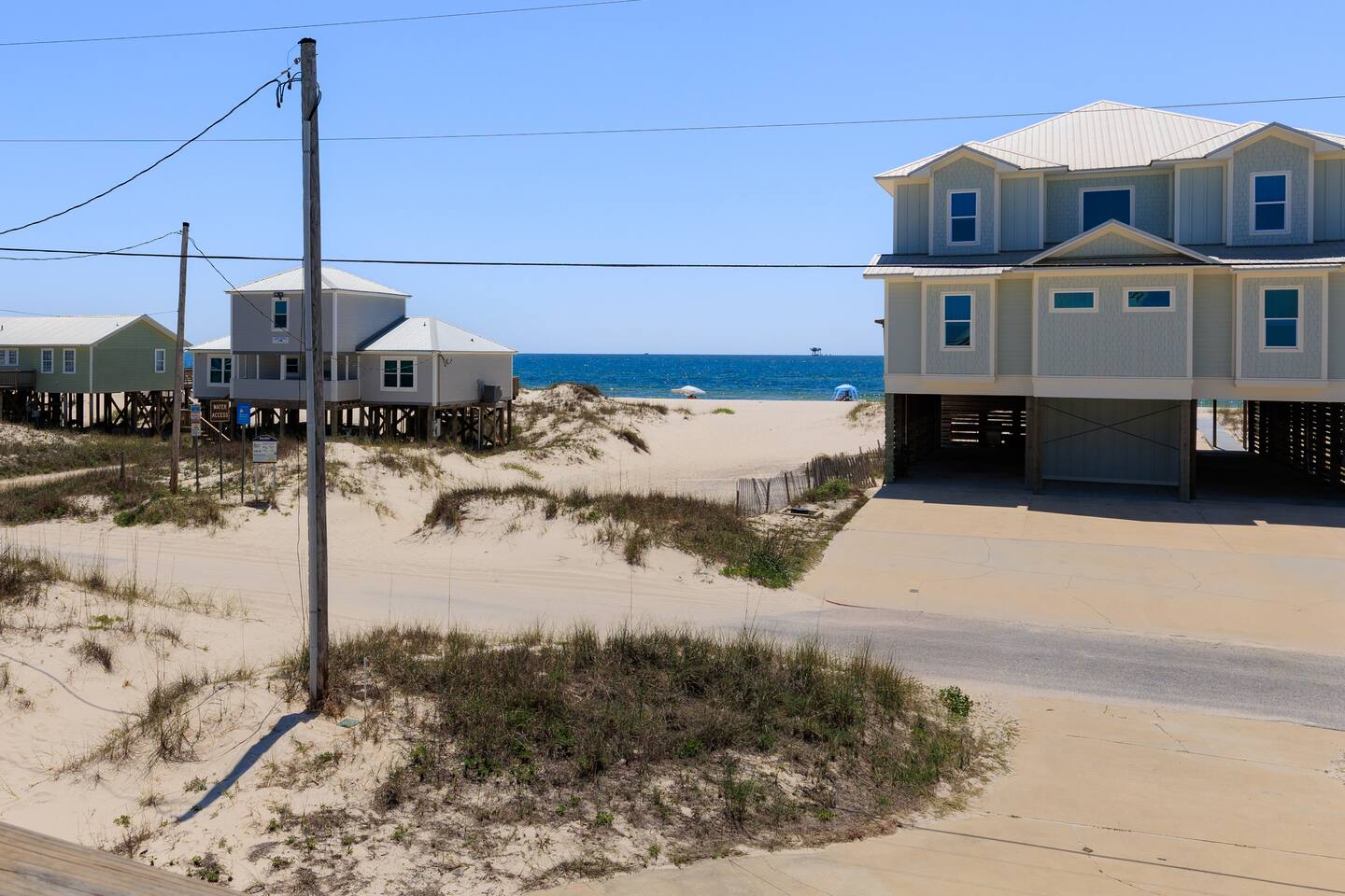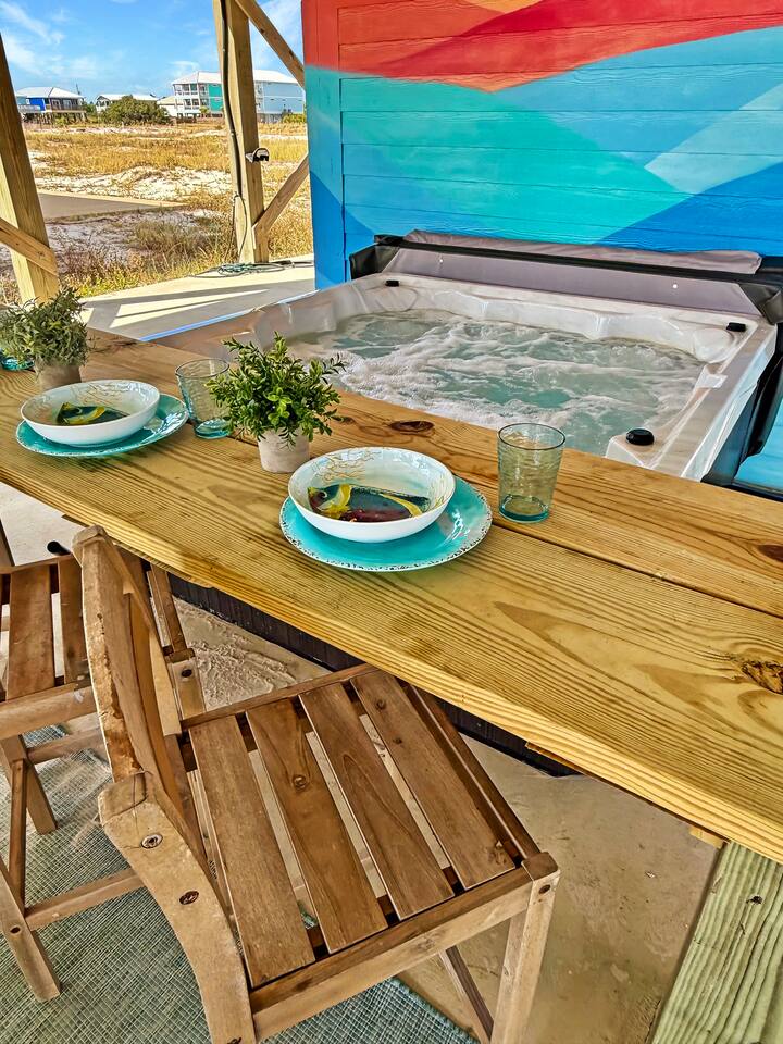 ✔ Directly Across From Public Beach ✔ Private Hot Tub ✔ All Dogs Welcome, Dog-Friendly Beach ✔️ 4 bedrooms, 4 baths, Sleeps 10 ✔️ Gulf-Facing Deck – Soak in the salt air and watch the waves roll in from an expansive deck with lounge seating. ✔️ Outdoor Oasis – Hang in your own shaded bar area under the house, complete with hot tub, cornhole, and comfy seating ✔️ Beach Gear, Linens & Soaps Included. ✔️ Outdoor Shower