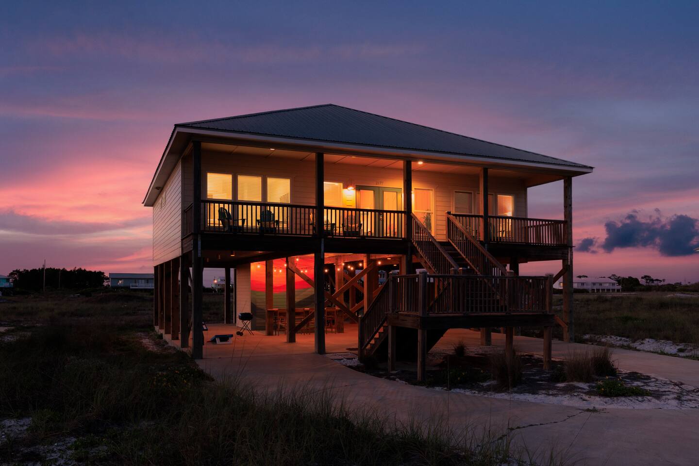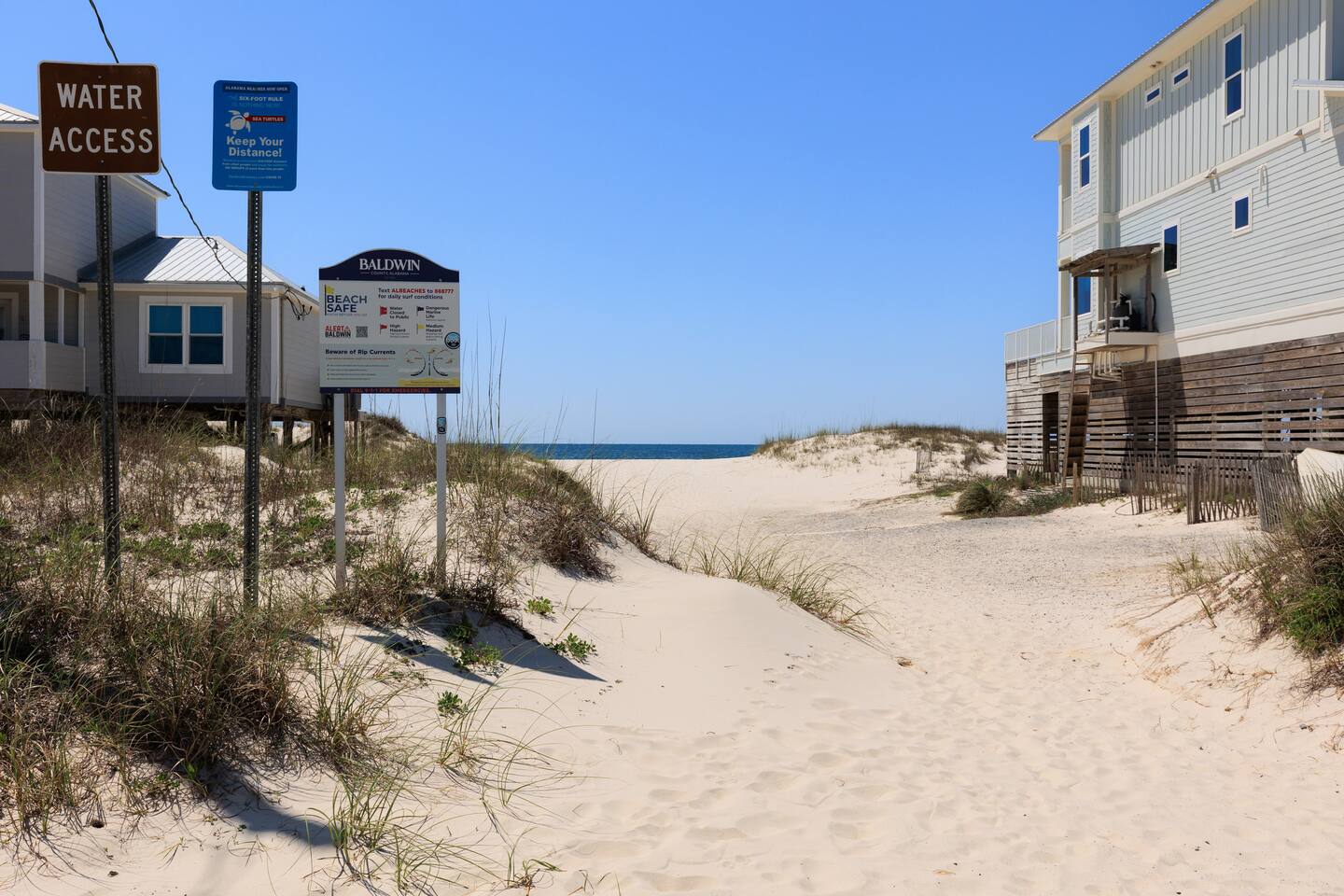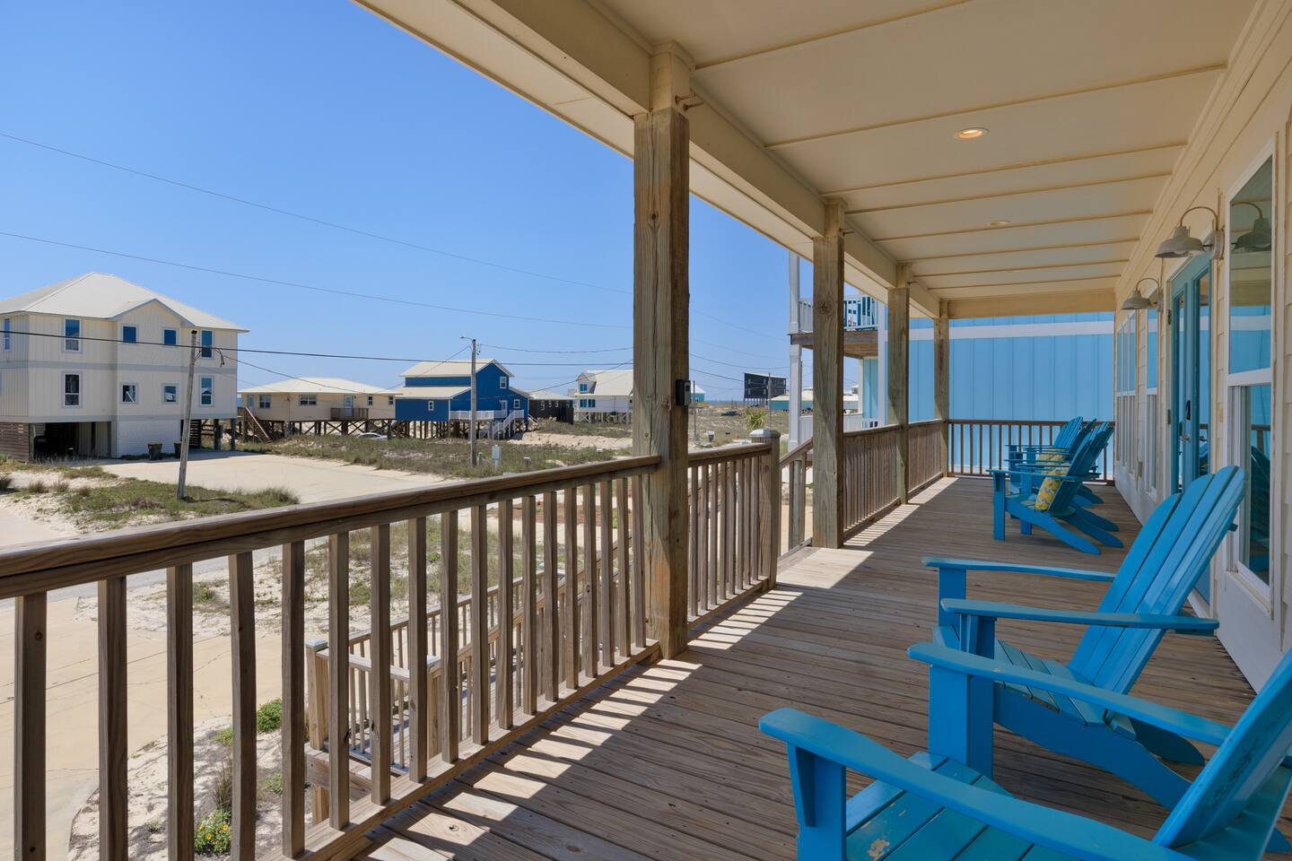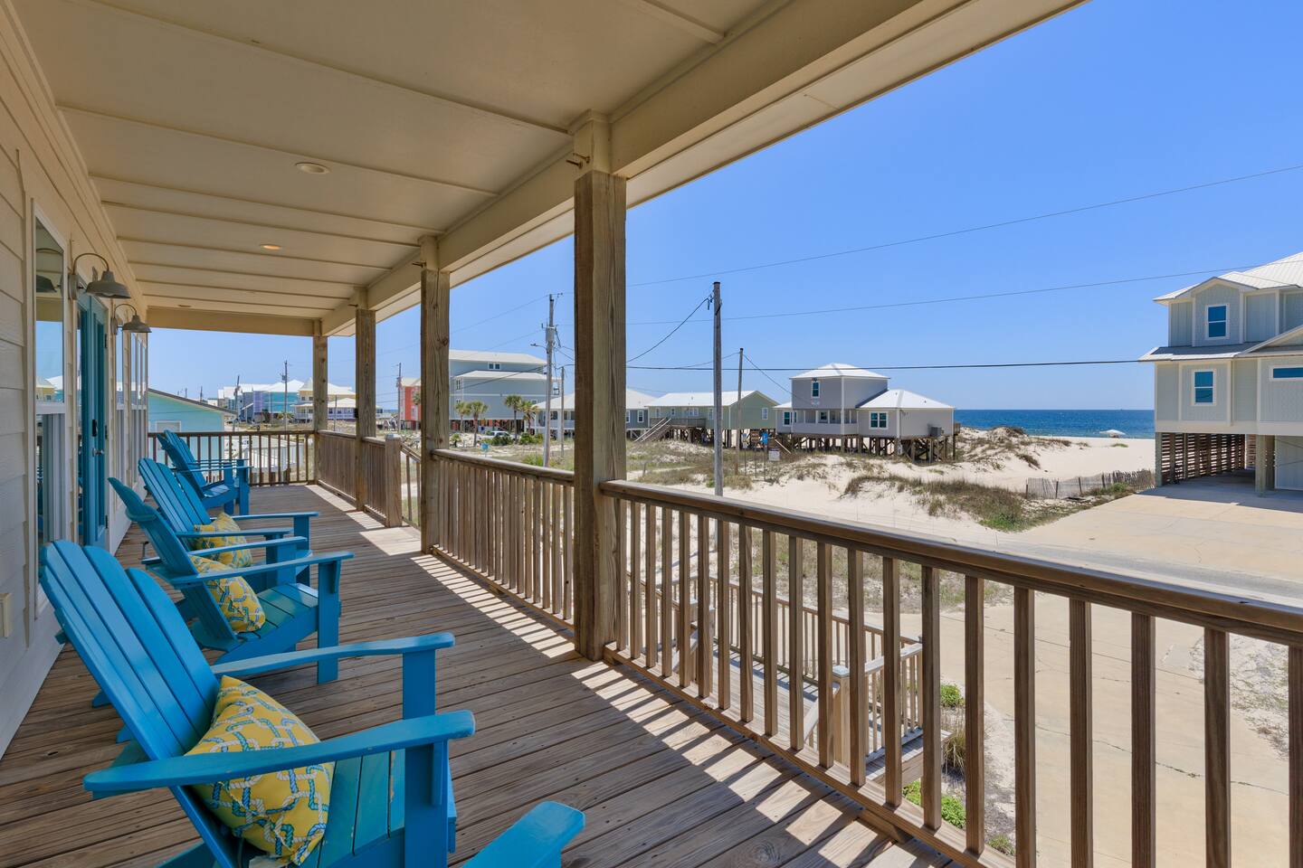 Gulf Views, Hot Tub & Beach Across the Street—All on One Level This single-story coastal retreat in Gulf Shores gives you the best of both worlds: stunning Gulf views from your front deck and beach access just steps across the street—all without the oceanfront price tag. With three king suites, a bunk room for the kids, and a killer outdoor hangout area complete with hot tub, bar, and games, this is where beach days and late nights come together perfectly. Wake up to Gulf breezes, spend your days between the sand and the hot tub, and end each night with sunset cocktails from your front-row deck. WHAT MAKES THIS HOME SPECIAL ✔ Gulf views from the front deck + beach across the street ✔ Single-level layout—no stairs, easy living ✔ Private outdoor bar, hot tub & game area under the house ✔ 3 king suites with private bathrooms + bunk room ✔ Dog-friendly—beach life is better with your pup THE SPACE Your Gulf-facing front deck is where mornings begin—coffee in hand, sunrise painting the water, planning which beach you'll hit first. As the day winds down, grab a seat with a cold drink and watch the sky turn pink and gold over the waves. Below, your private shaded hangout area is the real MVP. Fire up the outdoor bar, sink into the hot tub after a long beach day, challenge someone to cornhole, and let the good times roll. Rinse off the sand in the outdoor shower and decide whether your next move is the hot tub or back to the beach—it's only across the street. Inside, the fully stocked kitchen handles everything from quick breakfast tacos to full seafood spreads. The dining table seats everyone comfortably, and the living room invites you to kick back on stylish boho-chic seating and stream whatever you're binge-watching on the 65" Smart TV. The single-level layout means no one's hauling luggage upstairs or chasing kids between floors—just easy, breezy beach house living. WHERE EVERYONE SLEEPS 3 king suites with Gulf views, private en-suite bathrooms, 50" Smart TVs 1 bunk room with full-over-full bunk + extra twin bed—perfect for kids or teens All beds and mattresses are brand new as of 2025. Four full bathrooms total (three private en-suites, one hallway bath for the bunk room) with spa-style showers, boho accents, and plush towels throughout. GOOD TO KNOW ✔ Beach chairs, wagon, toys, and gear included ✔ Outdoor shower for easy post-beach cleanup ✔ Washer and dryer in-unit ✔ Central A/C and fast Wi-Fi ✔ Dining favorites 5 minutes away (Tacky Jacks, Jessie's, Sassy Bass) ✔ Downtown Gulf Shores is 20 minutes down the coast BOOK YOUR ESCAPE This is the kind of place that becomes your new beach tradition—where you're close enough to hear the waves but far enough from the crowd to have your own vibe. Morning beach walks, afternoon hot tub hangs, evening games at the bar. If you want Gulf views, easy beach access, and a single-level layout that just works, you've found it. Availability fills fast—check your dates now. Rose & Doug Waves & Wilderness