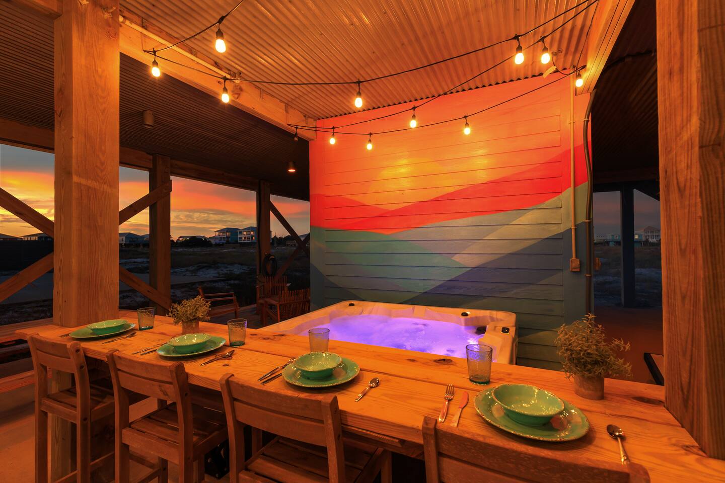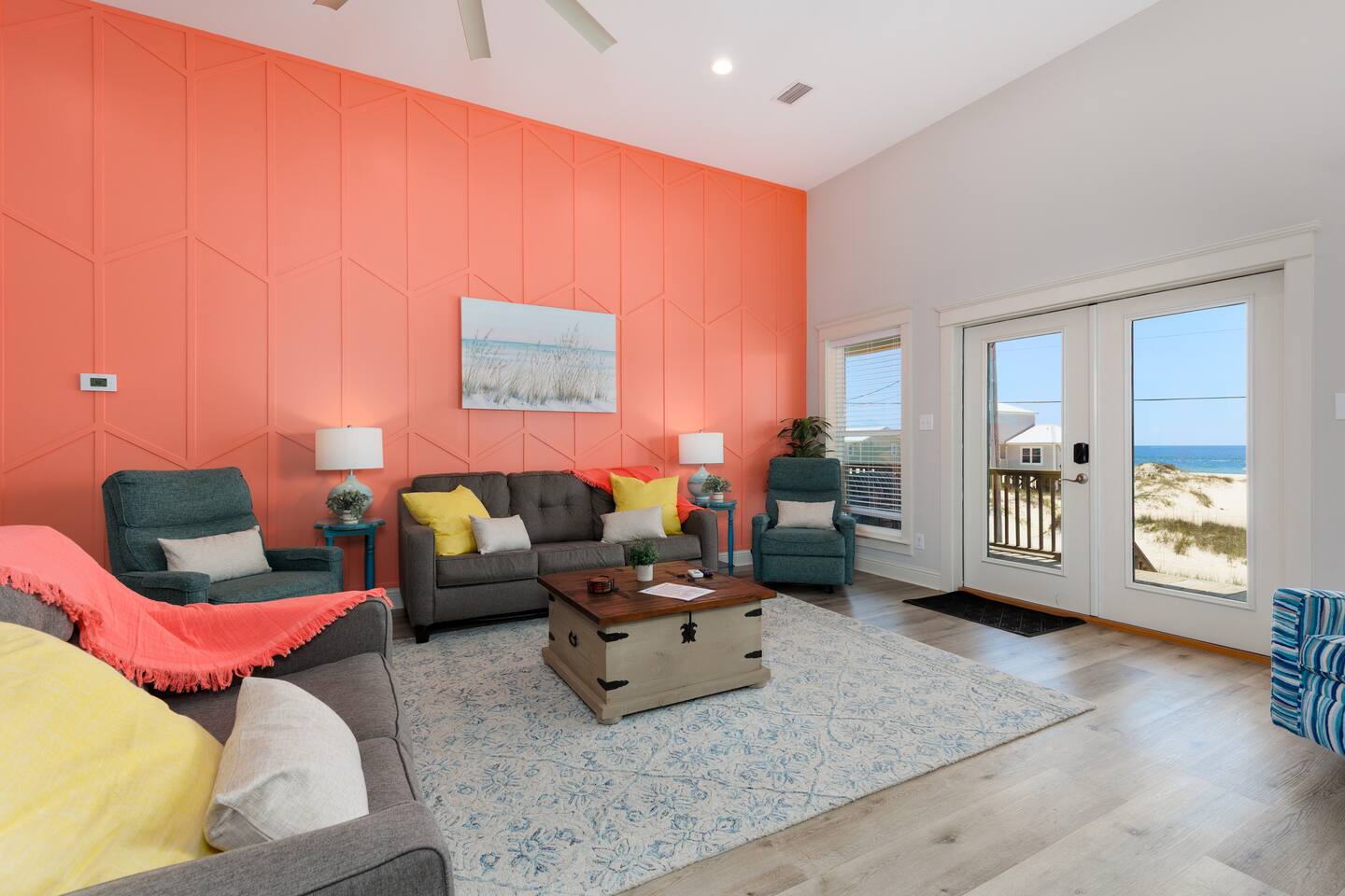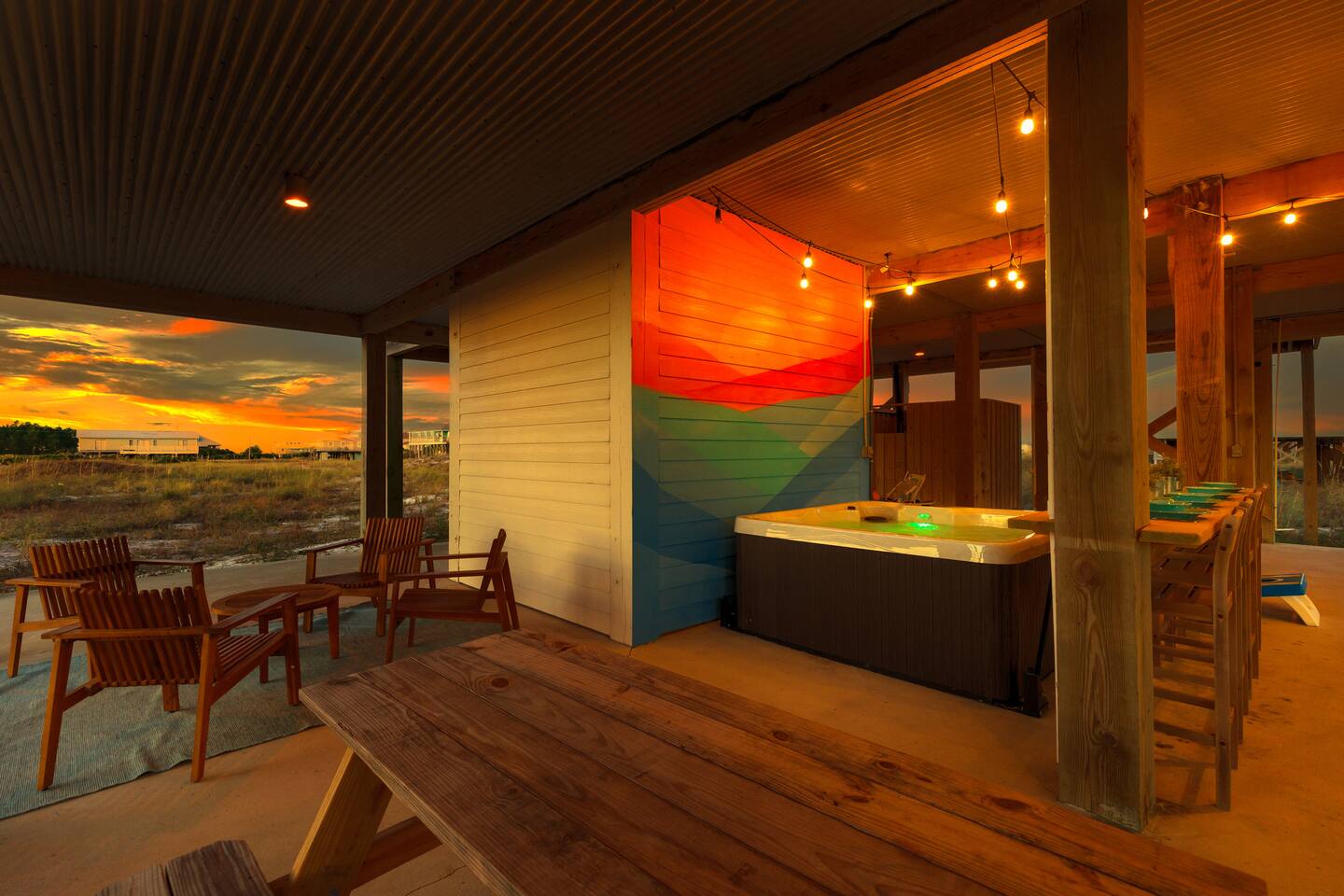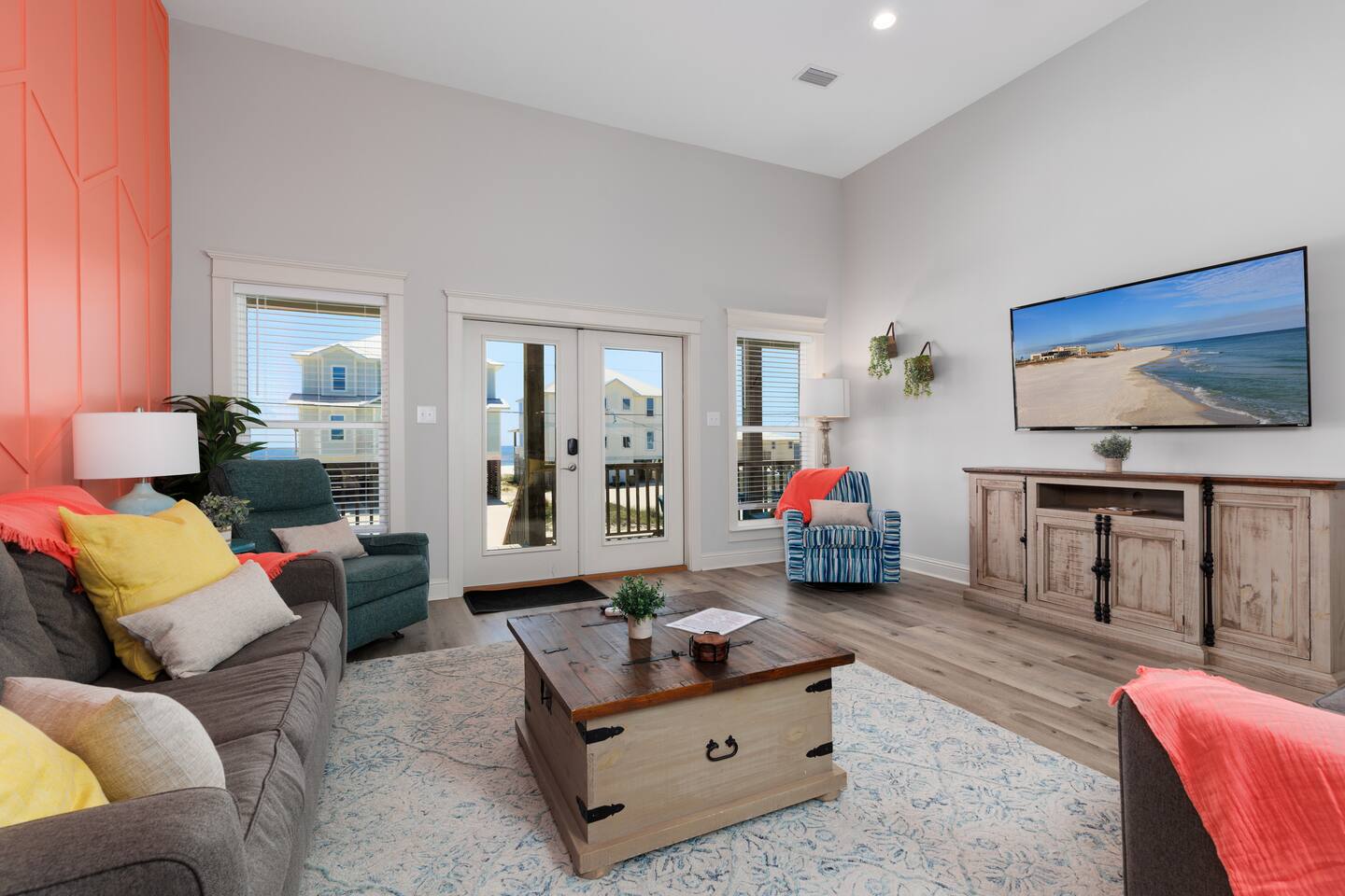 Gulf Views, Hot Tub & Beach Across the Street—All on One Level This single-story coastal retreat in Gulf Shores gives you the best of both worlds: stunning Gulf views from your front deck and beach access just steps across the street—all without the oceanfront price tag. With three king suites, a bunk room for the kids, and a killer outdoor hangout area complete with hot tub, bar, and games, this is where beach days and late nights come together perfectly. Wake up to Gulf breezes, spend your days between the sand and the hot tub, and end each night with sunset cocktails from your front-row deck. WHAT MAKES THIS HOME SPECIAL ✔ Gulf views from the front deck + beach across the street ✔ Single-level layout—no stairs, easy living ✔ Private outdoor bar, hot tub & game area under the house ✔ 3 king suites with private bathrooms + bunk room ✔ Dog-friendly—beach life is better with your pup THE SPACE Your Gulf-facing front deck is where mornings begin—coffee in hand, sunrise painting the water, planning which beach you'll hit first. As the day winds down, grab a seat with a cold drink and watch the sky turn pink and gold over the waves. Below, your private shaded hangout area is the real MVP. Fire up the outdoor bar, sink into the hot tub after a long beach day, challenge someone to cornhole, and let the good times roll. Rinse off the sand in the outdoor shower and decide whether your next move is the hot tub or back to the beach—it's only across the street. Inside, the fully stocked kitchen handles everything from quick breakfast tacos to full seafood spreads. The dining table seats everyone comfortably, and the living room invites you to kick back on stylish boho-chic seating and stream whatever you're binge-watching on the 65" Smart TV. The single-level layout means no one's hauling luggage upstairs or chasing kids between floors—just easy, breezy beach house living. WHERE EVERYONE SLEEPS 3 king suites with Gulf views, private en-suite bathrooms, 50" Smart TVs 1 bunk room with full-over-full bunk + extra twin bed—perfect for kids or teens All beds and mattresses are brand new as of 2025. Four full bathrooms total (three private en-suites, one hallway bath for the bunk room) with spa-style showers, boho accents, and plush towels throughout. GOOD TO KNOW ✔ Beach chairs, wagon, toys, and gear included ✔ Outdoor shower for easy post-beach cleanup ✔ Washer and dryer in-unit ✔ Central A/C and fast Wi-Fi ✔ Dining favorites 5 minutes away (Tacky Jacks, Jessie's, Sassy Bass) ✔ Downtown Gulf Shores is 20 minutes down the coast BOOK YOUR ESCAPE This is the kind of place that becomes your new beach tradition—where you're close enough to hear the waves but far enough from the crowd to have your own vibe. Morning beach walks, afternoon hot tub hangs, evening games at the bar. If you want Gulf views, easy beach access, and a single-level layout that just works, you've found it. Availability fills fast—check your dates now. Rose & Doug Waves & Wilderness
