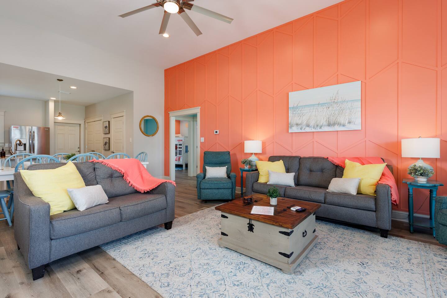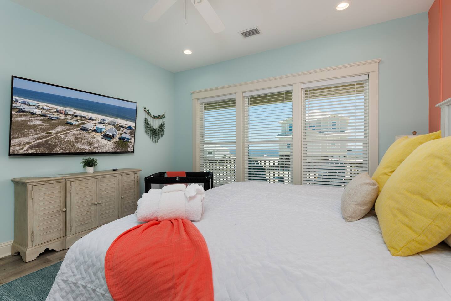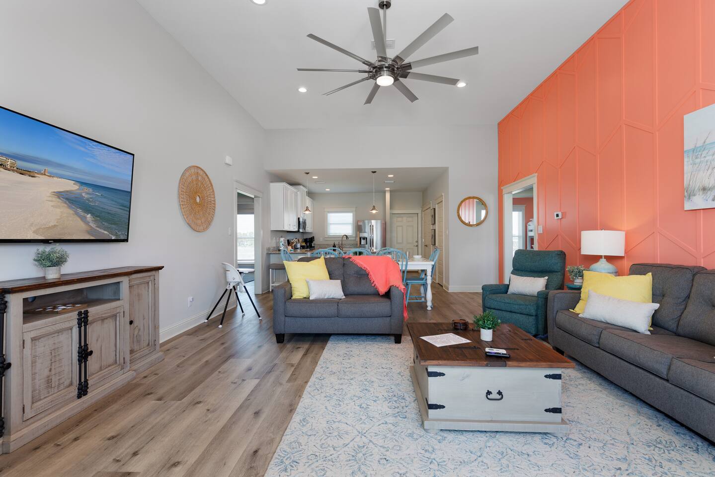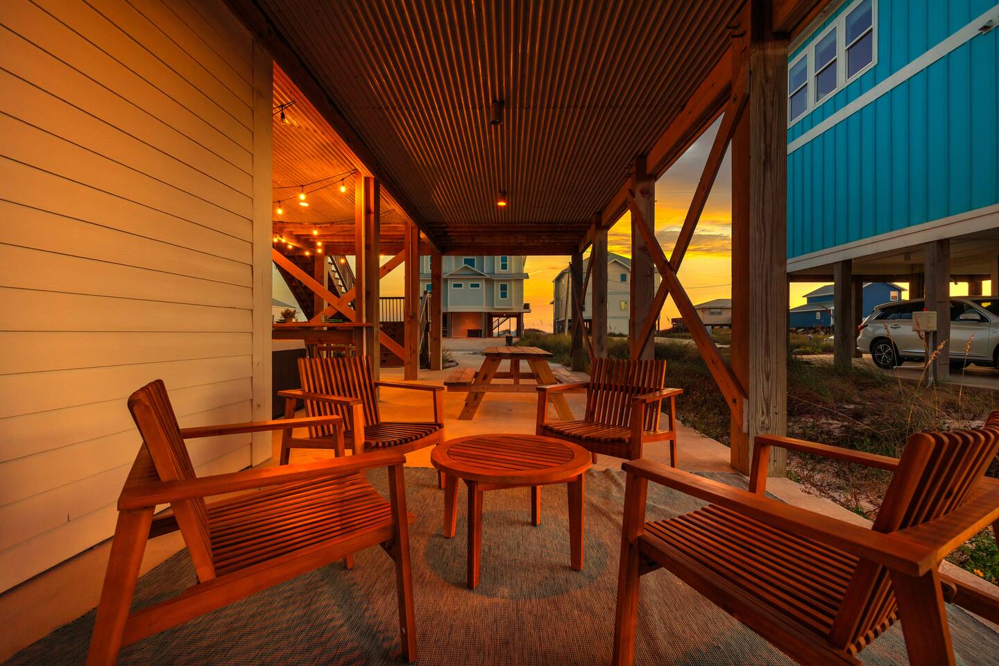 Gulf Views, Hot Tub & Beach Across the Street—All on One Level This single-story coastal retreat in Gulf Shores gives you the best of both worlds: stunning Gulf views from your front deck and beach access just steps across the street—all without the oceanfront price tag. With three king suites, a bunk room for the kids, and a killer outdoor hangout area complete with hot tub, bar, and games, this is where beach days and late nights come together perfectly. Wake up to Gulf breezes, spend your days between the sand and the hot tub, and end each night with sunset cocktails from your front-row deck. WHAT MAKES THIS HOME SPECIAL ✔ Gulf views from the front deck + beach across the street ✔ Single-level layout—no stairs, easy living ✔ Private outdoor bar, hot tub & game area under the house ✔ 3 king suites with private bathrooms + bunk room ✔ Dog-friendly—beach life is better with your pup THE SPACE Your Gulf-facing front deck is where mornings begin—coffee in hand, sunrise painting the water, planning which beach you'll hit first. As the day winds down, grab a seat with a cold drink and watch the sky turn pink and gold over the waves. Below, your private shaded hangout area is the real MVP. Fire up the outdoor bar, sink into the hot tub after a long beach day, challenge someone to cornhole, and let the good times roll. Rinse off the sand in the outdoor shower and decide whether your next move is the hot tub or back to the beach—it's only across the street. Inside, the fully stocked kitchen handles everything from quick breakfast tacos to full seafood spreads. The dining table seats everyone comfortably, and the living room invites you to kick back on stylish boho-chic seating and stream whatever you're binge-watching on the 65" Smart TV. The single-level layout means no one's hauling luggage upstairs or chasing kids between floors—just easy, breezy beach house living. WHERE EVERYONE SLEEPS 3 king suites with Gulf views, private en-suite bathrooms, 50" Smart TVs 1 bunk room with full-over-full bunk + extra twin bed—perfect for kids or teens All beds and mattresses are brand new as of 2025. Four full bathrooms total (three private en-suites, one hallway bath for the bunk room) with spa-style showers, boho accents, and plush towels throughout. GOOD TO KNOW ✔ Beach chairs, wagon, toys, and gear included ✔ Outdoor shower for easy post-beach cleanup ✔ Washer and dryer in-unit ✔ Central A/C and fast Wi-Fi ✔ Dining favorites 5 minutes away (Tacky Jacks, Jessie's, Sassy Bass) ✔ Downtown Gulf Shores is 20 minutes down the coast BOOK YOUR ESCAPE This is the kind of place that becomes your new beach tradition—where you're close enough to hear the waves but far enough from the crowd to have your own vibe. Morning beach walks, afternoon hot tub hangs, evening games at the bar. If you want Gulf views, easy beach access, and a single-level layout that just works, you've found it. Availability fills fast—check your dates now. Rose & Doug Waves & Wilderness